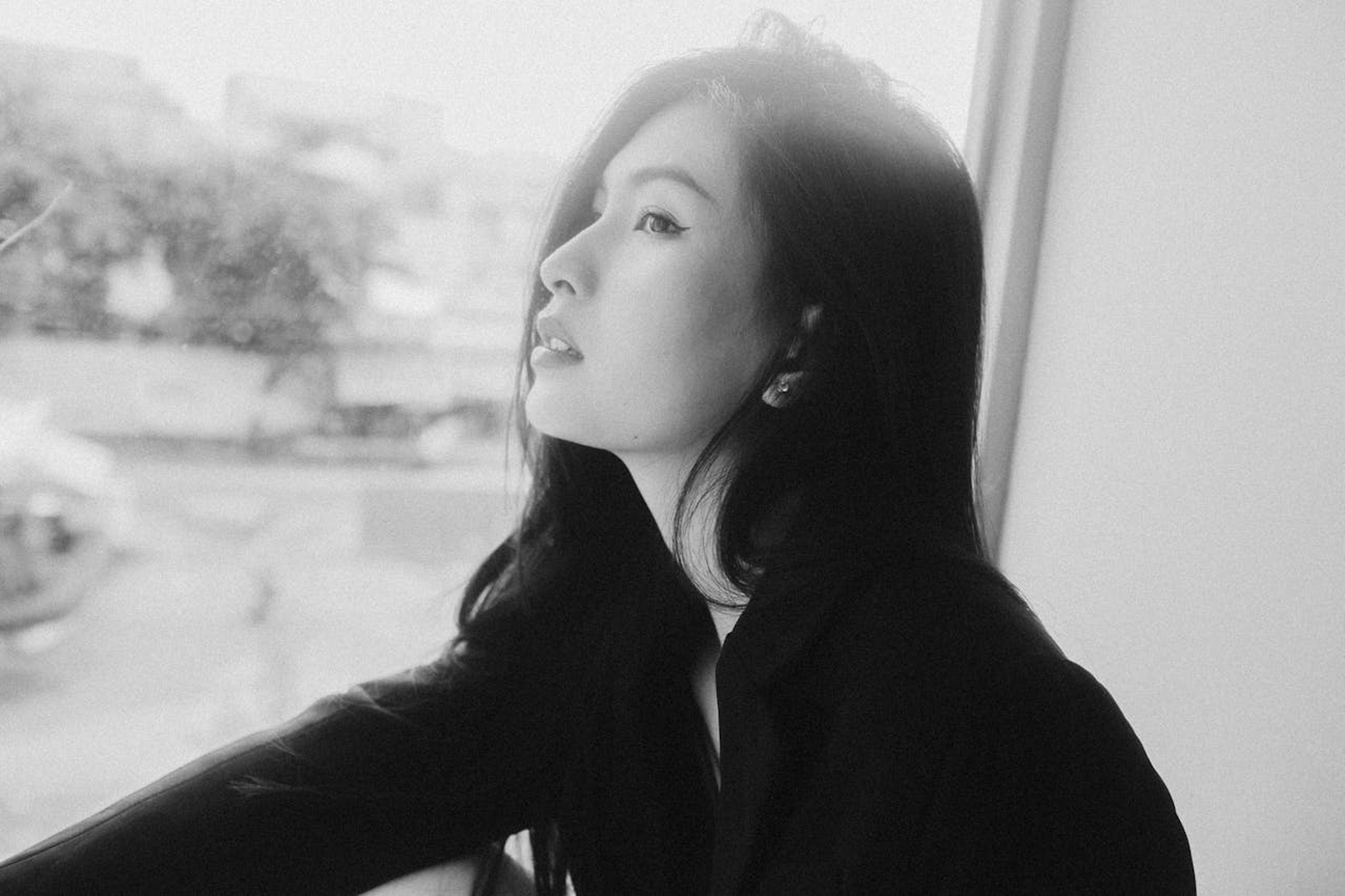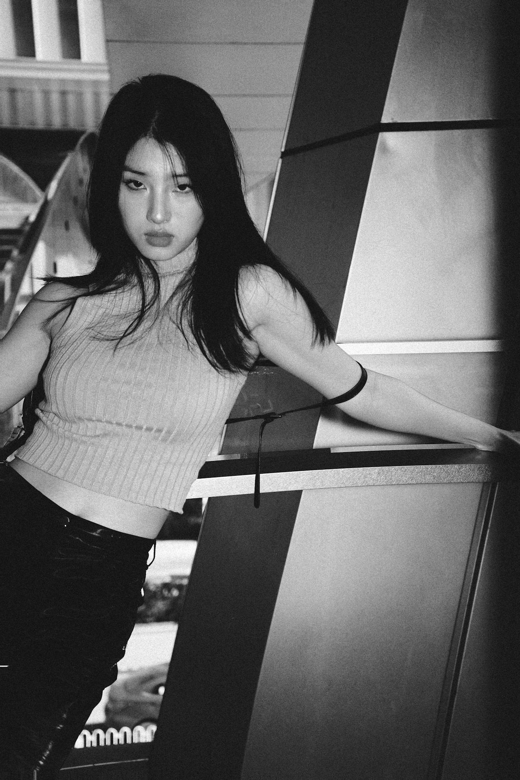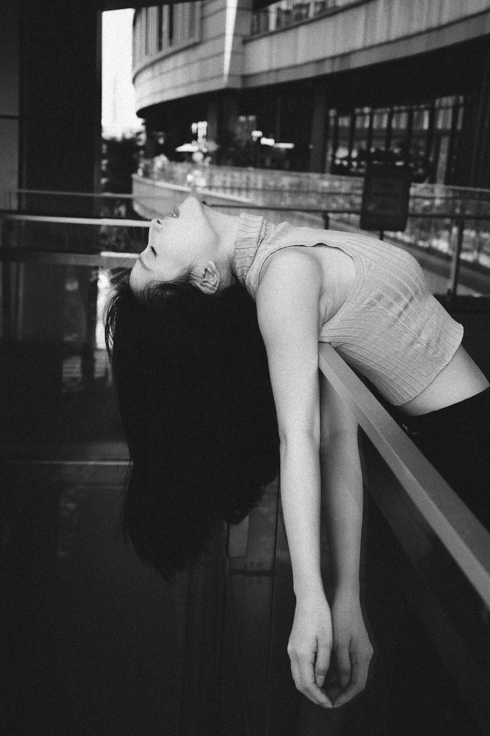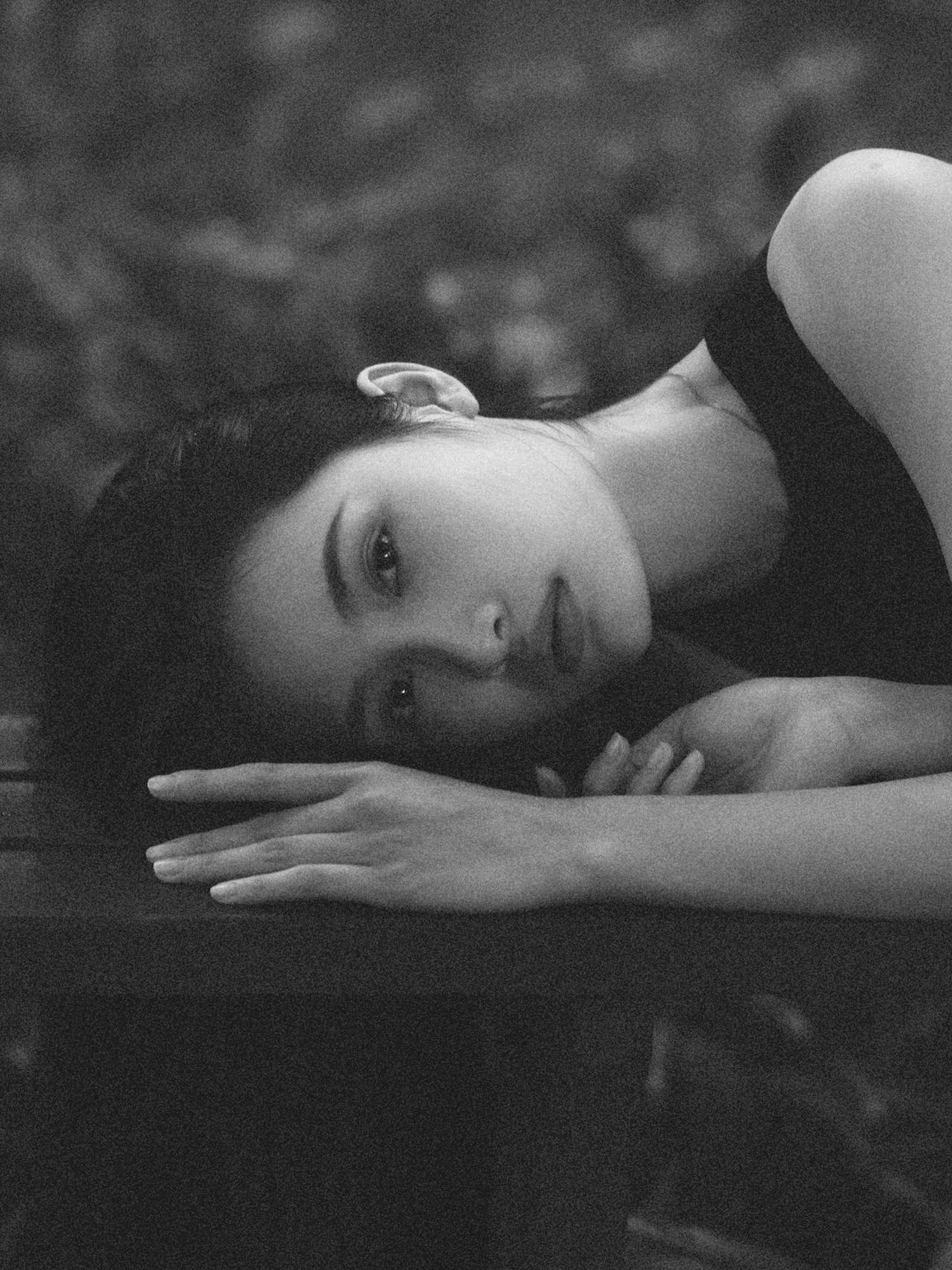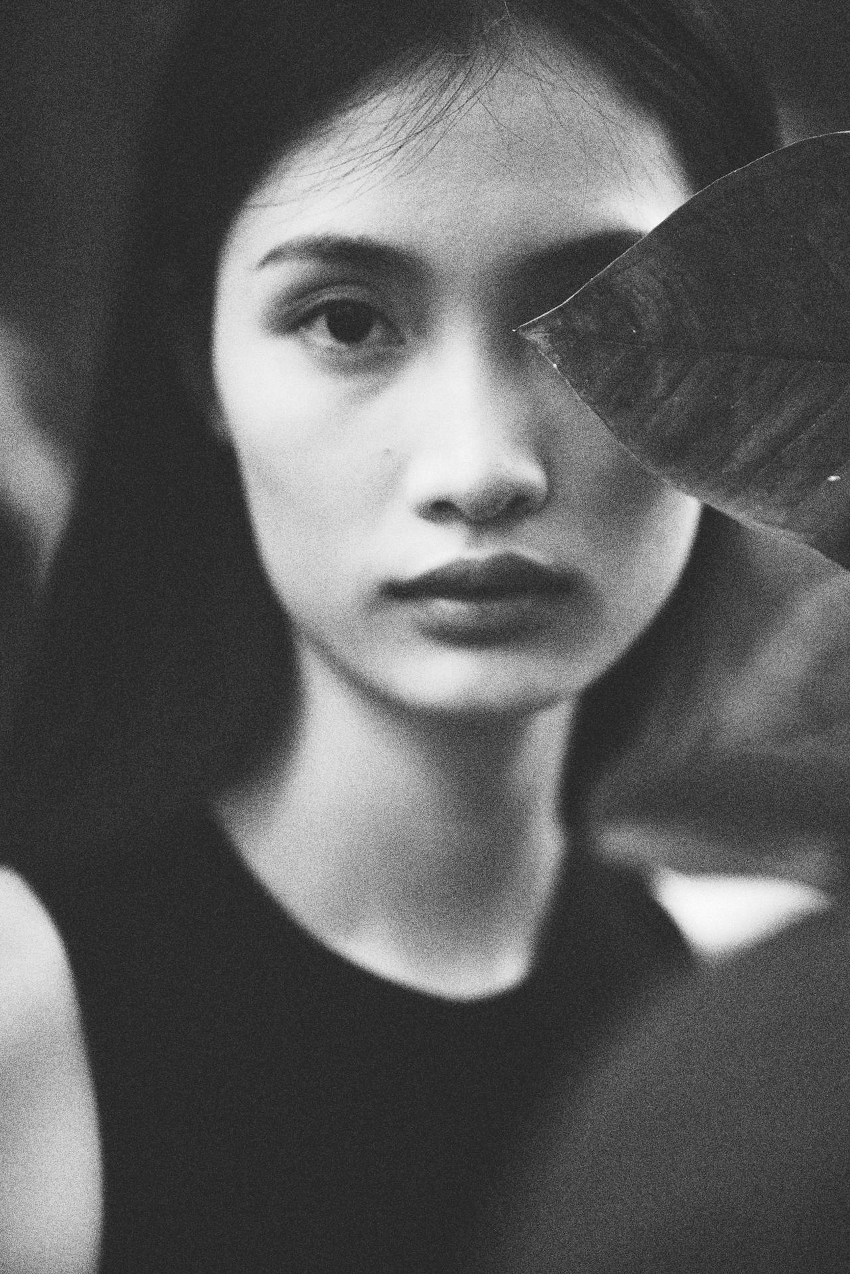 胶片的颗粒质感,把光影、轮廓和眼神里的故事都放大了。有的照片里,她枕着手望向镜头,眼底藏着未说出口的情绪;有的照片里,她倚在栏杆上仰头,发丝在光影里变成了流动的线条;还有的照片里,一片叶子挡住半张脸,只剩眼神直抵人心。