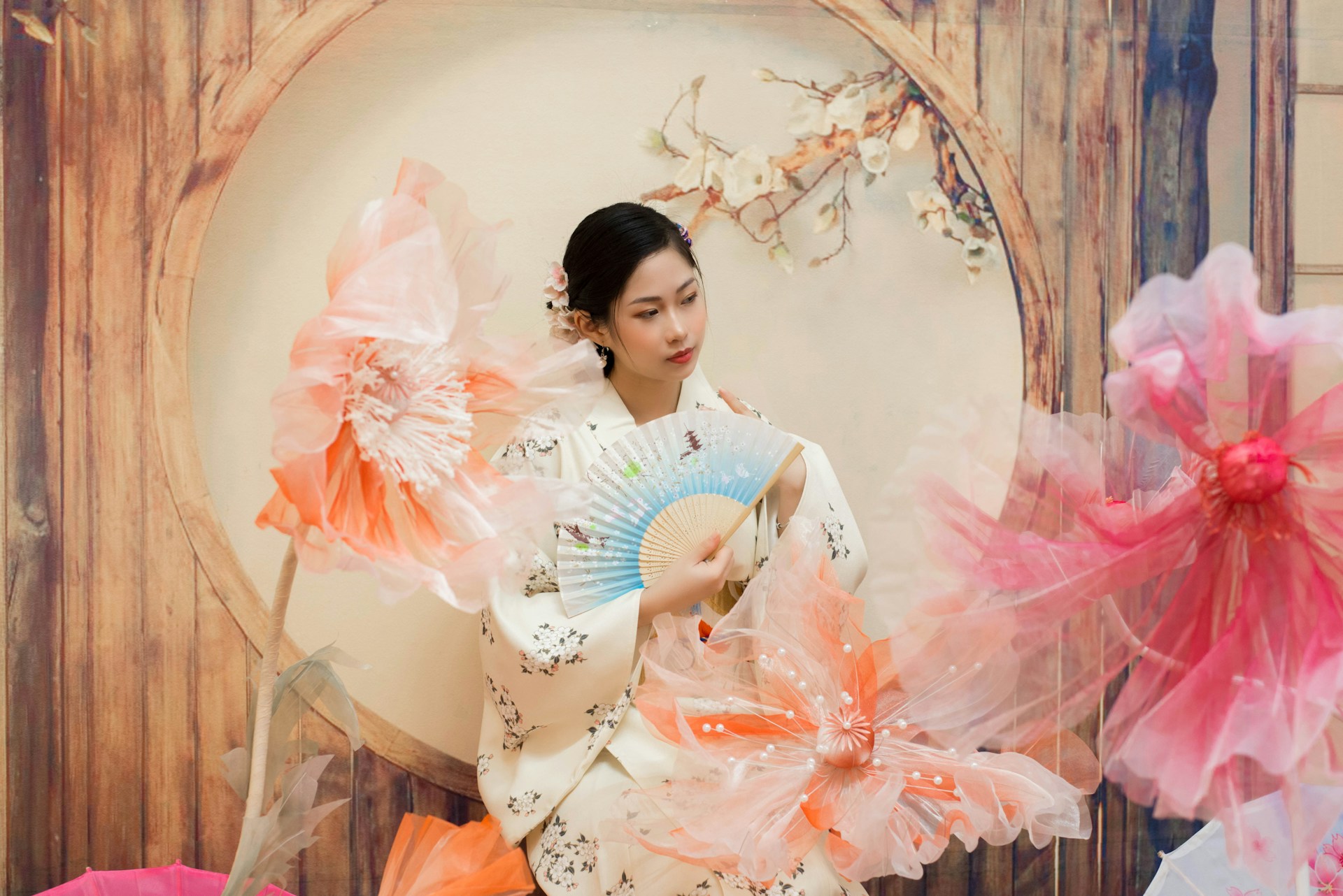 暖调的柔光里,一身米白色和服温柔又雅致,细碎的樱花纹样在衣间静静绽放,发间簪着的粉花,为这素雅的造型添上一抹灵动。