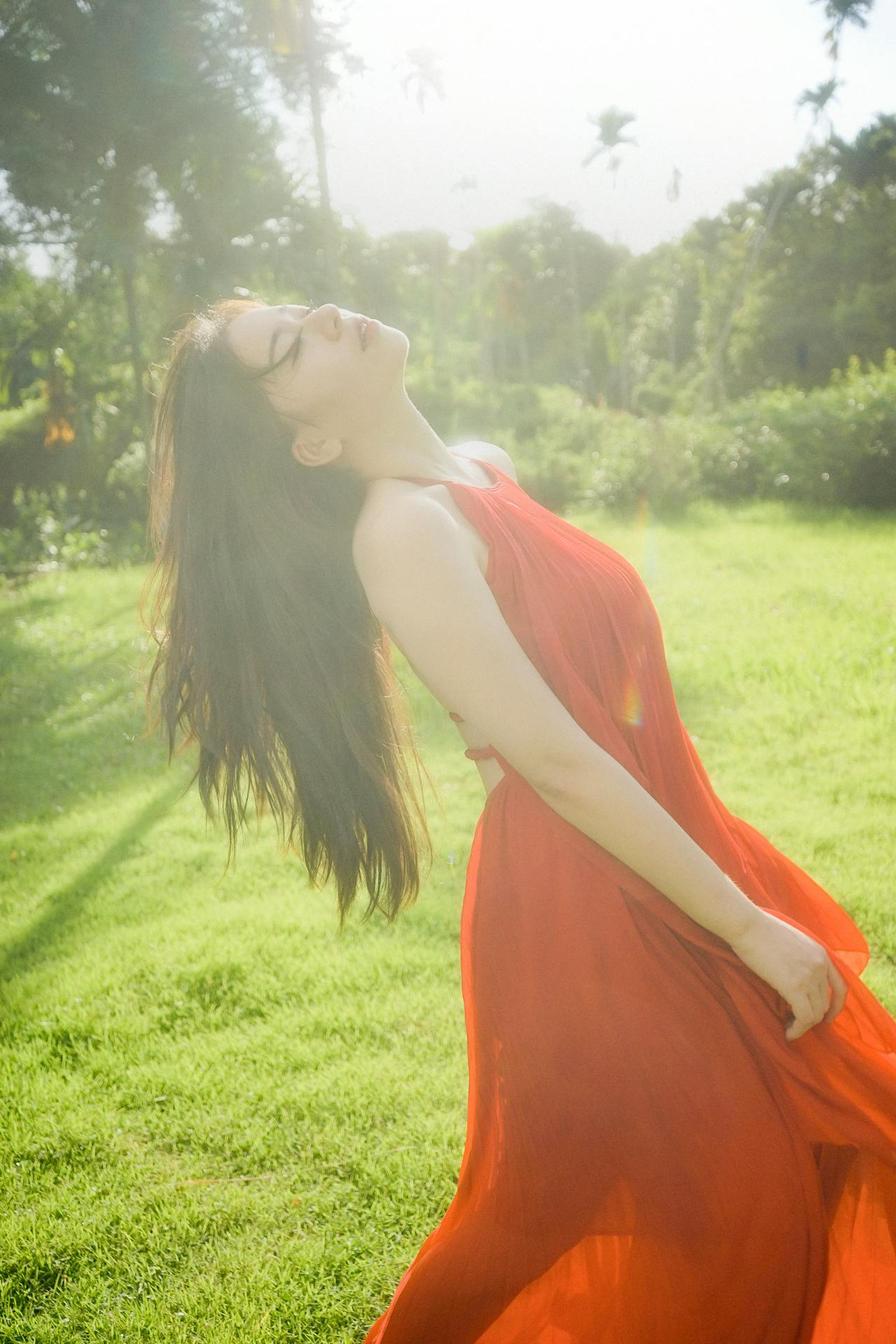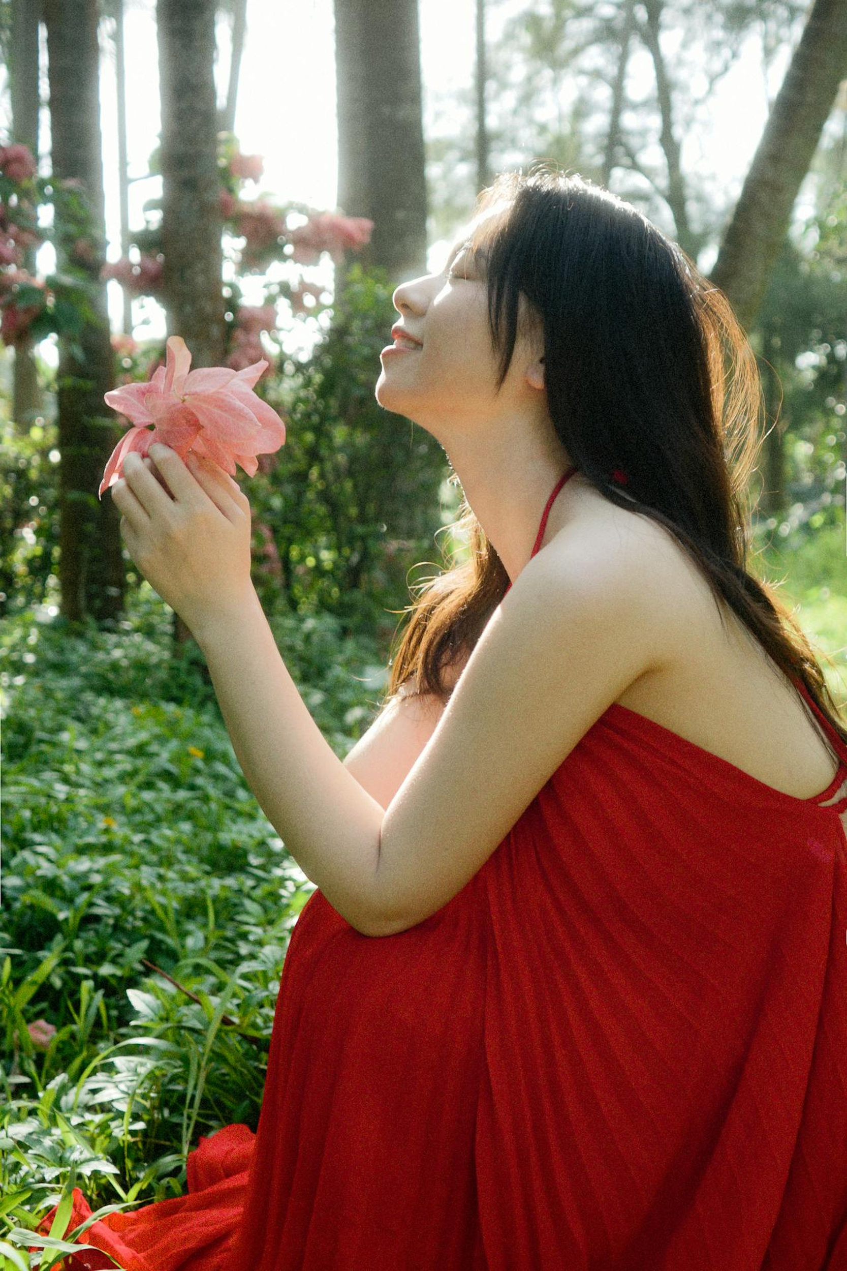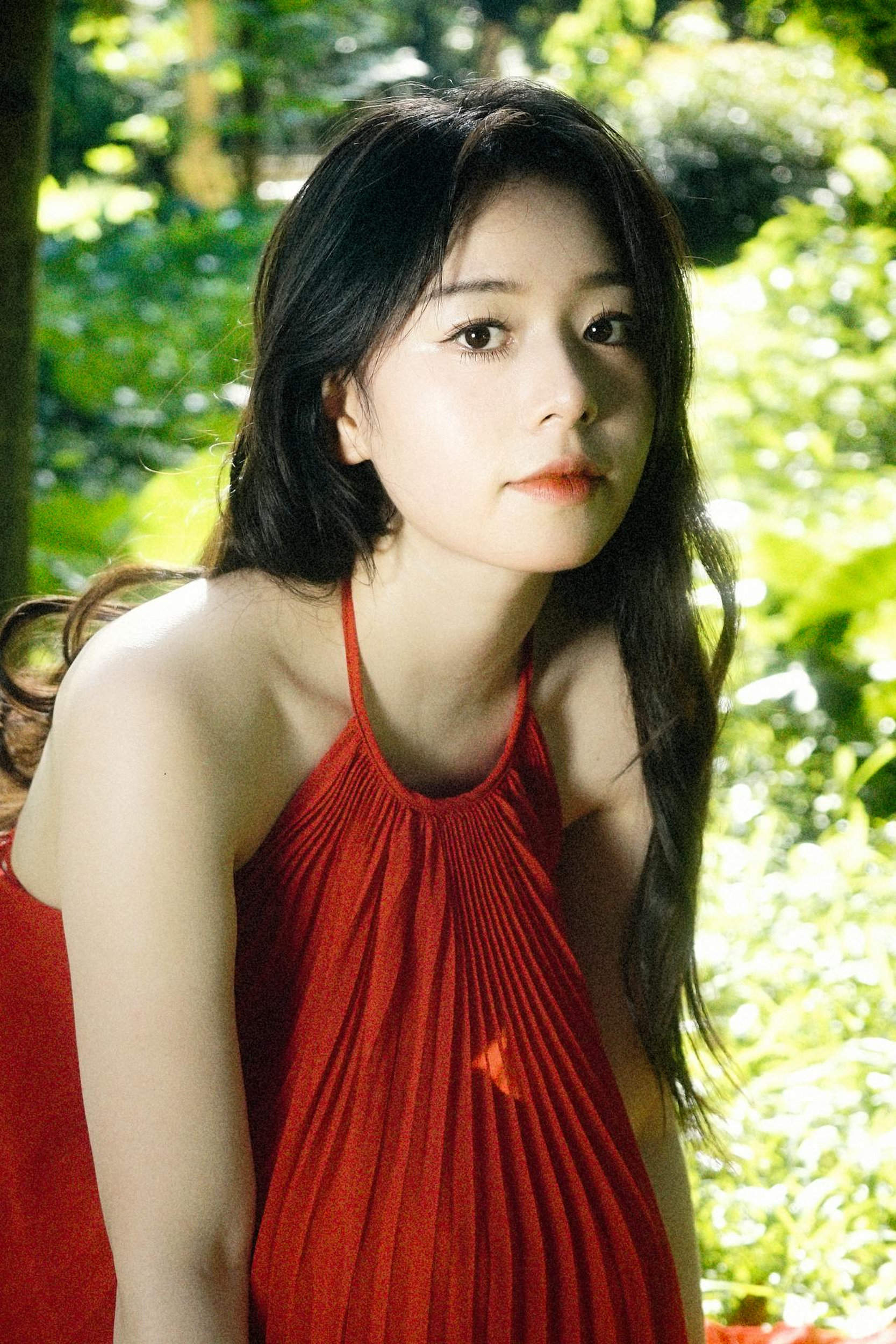 明媚的阳光穿过树叶,洒在草地上,也洒在她的红裙上。她赤脚在草坪上旋转,裙摆和发丝一起飞扬,像一团跳动的火焰;她捧着花,闭眼微笑,阳光在她的脸上镀上一层温柔的光晕;她倚在林间,眼里带着笑意,连空气都跟着变得清甜起来。