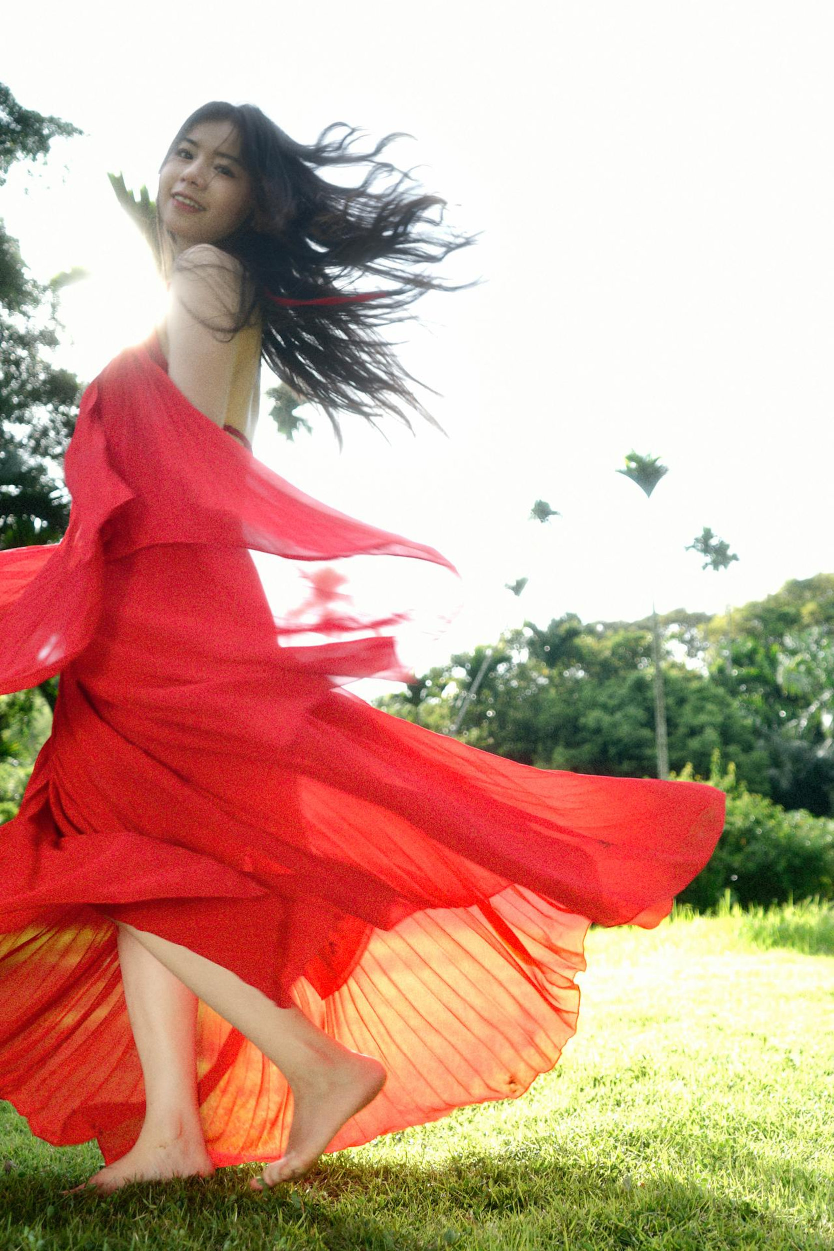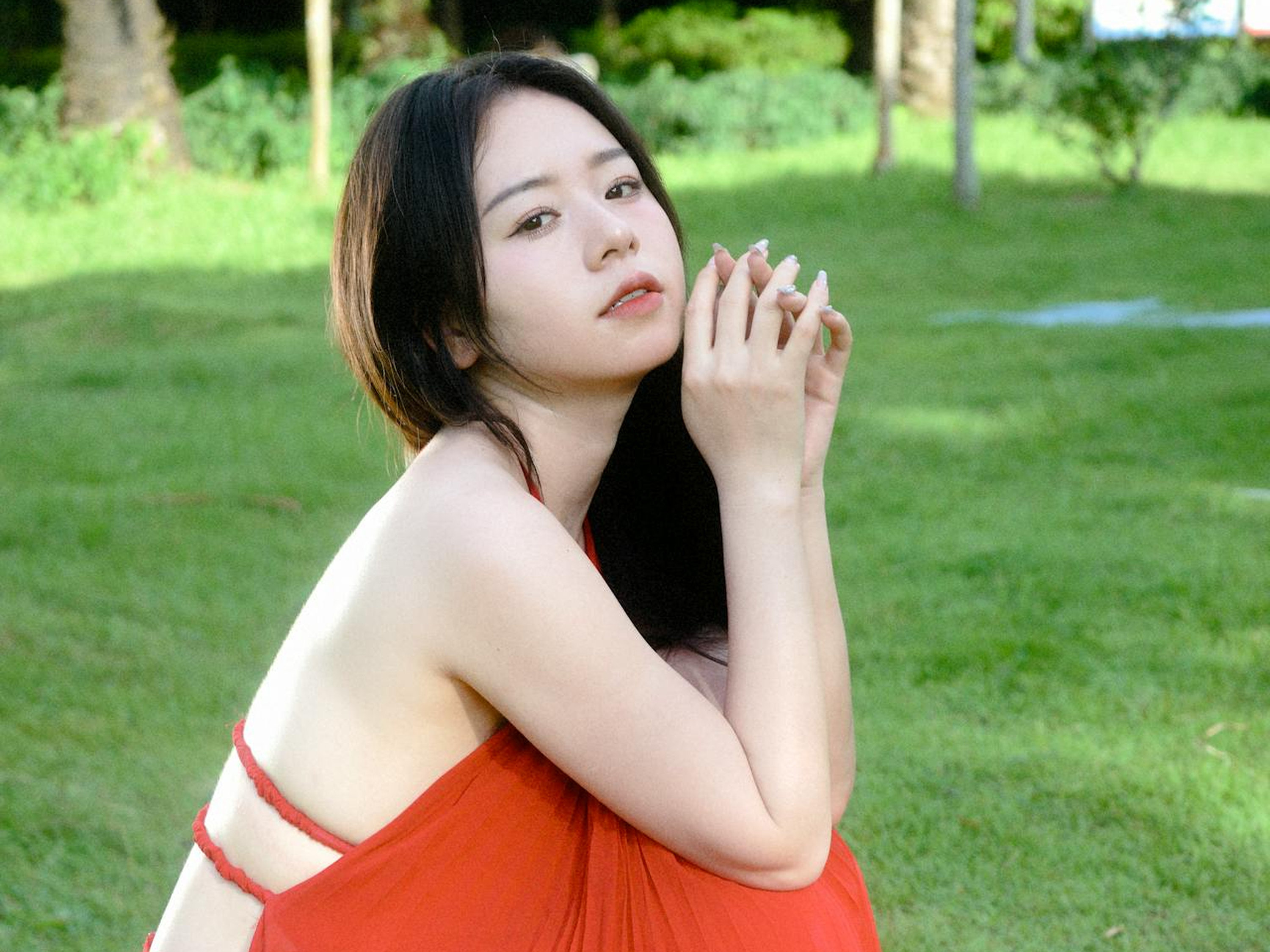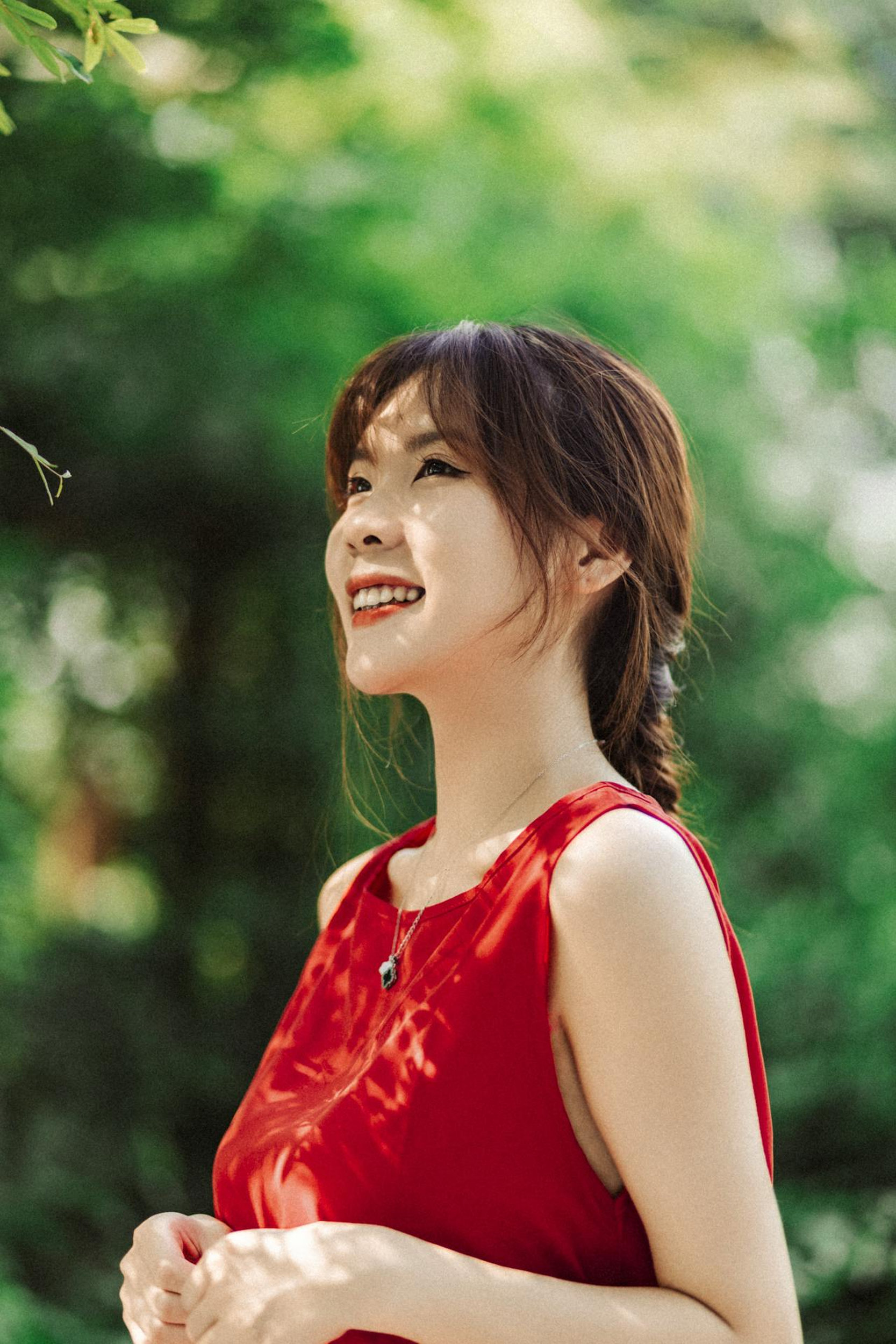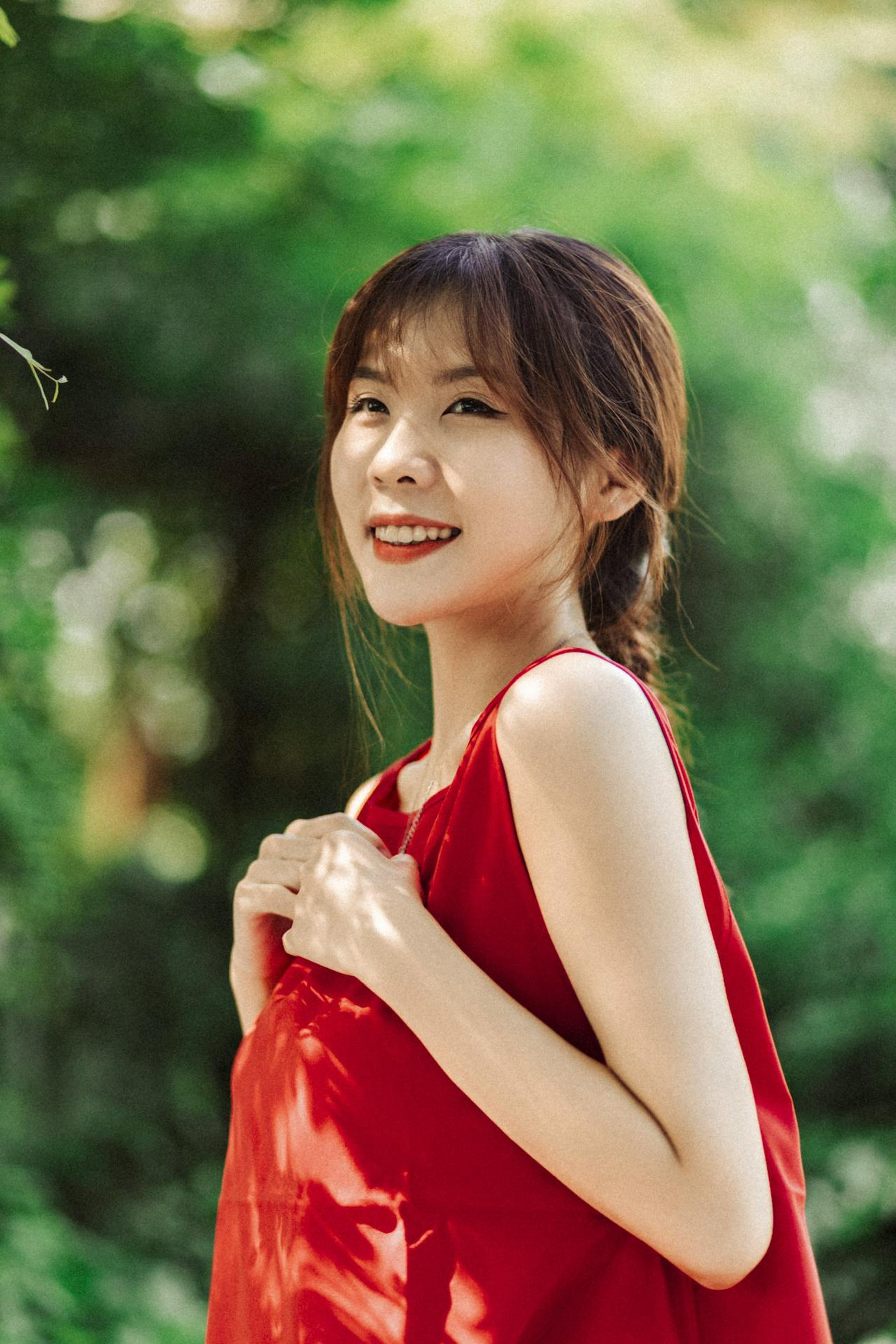 明媚的阳光穿过树叶,洒在草地上,也洒在她的红裙上。她赤脚在草坪上旋转,裙摆和发丝一起飞扬,像一团跳动的火焰;她捧着花,闭眼微笑,阳光在她的脸上镀上一层温柔的光晕;她倚在林间,眼里带着笑意,连空气都跟着变得清甜起来。