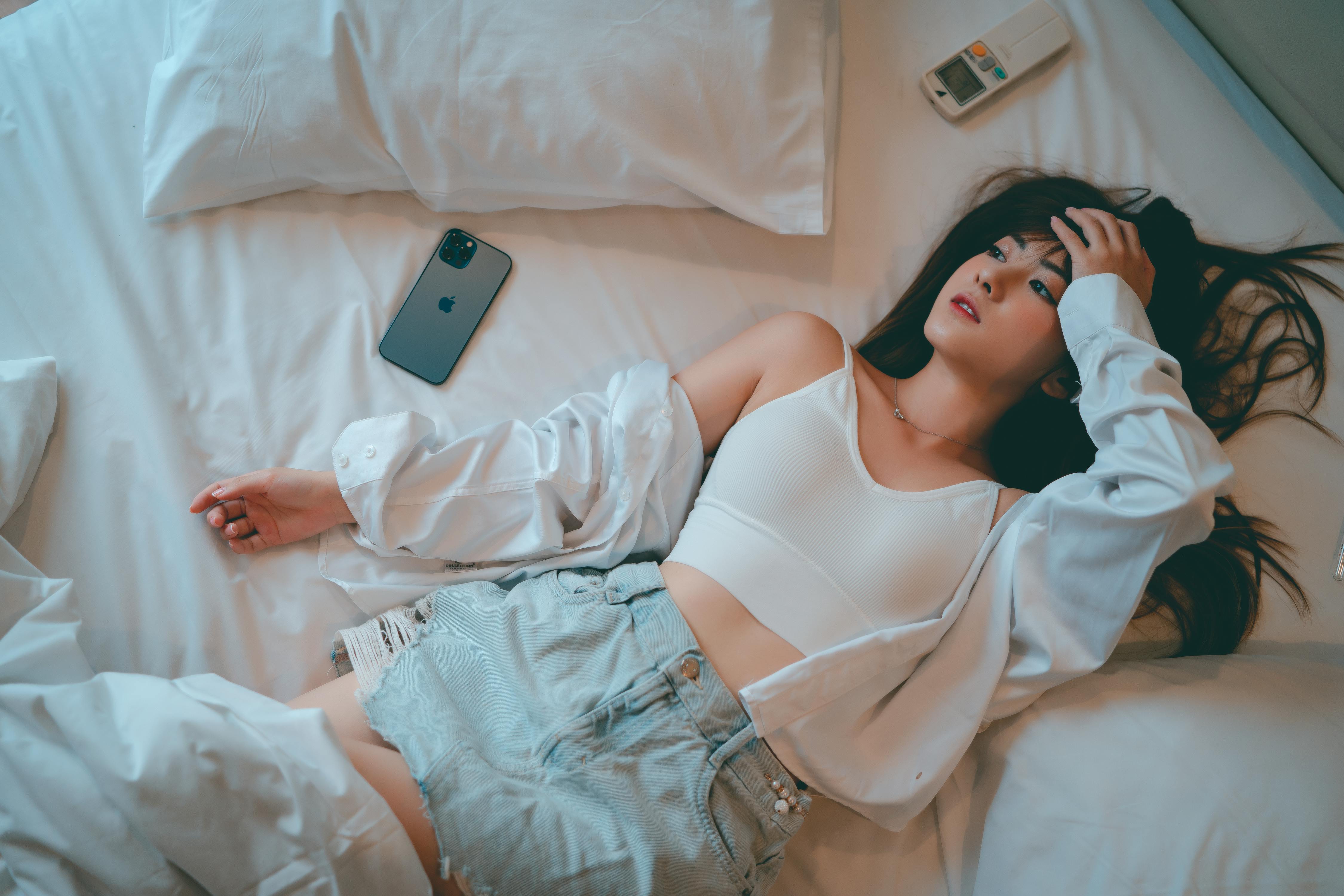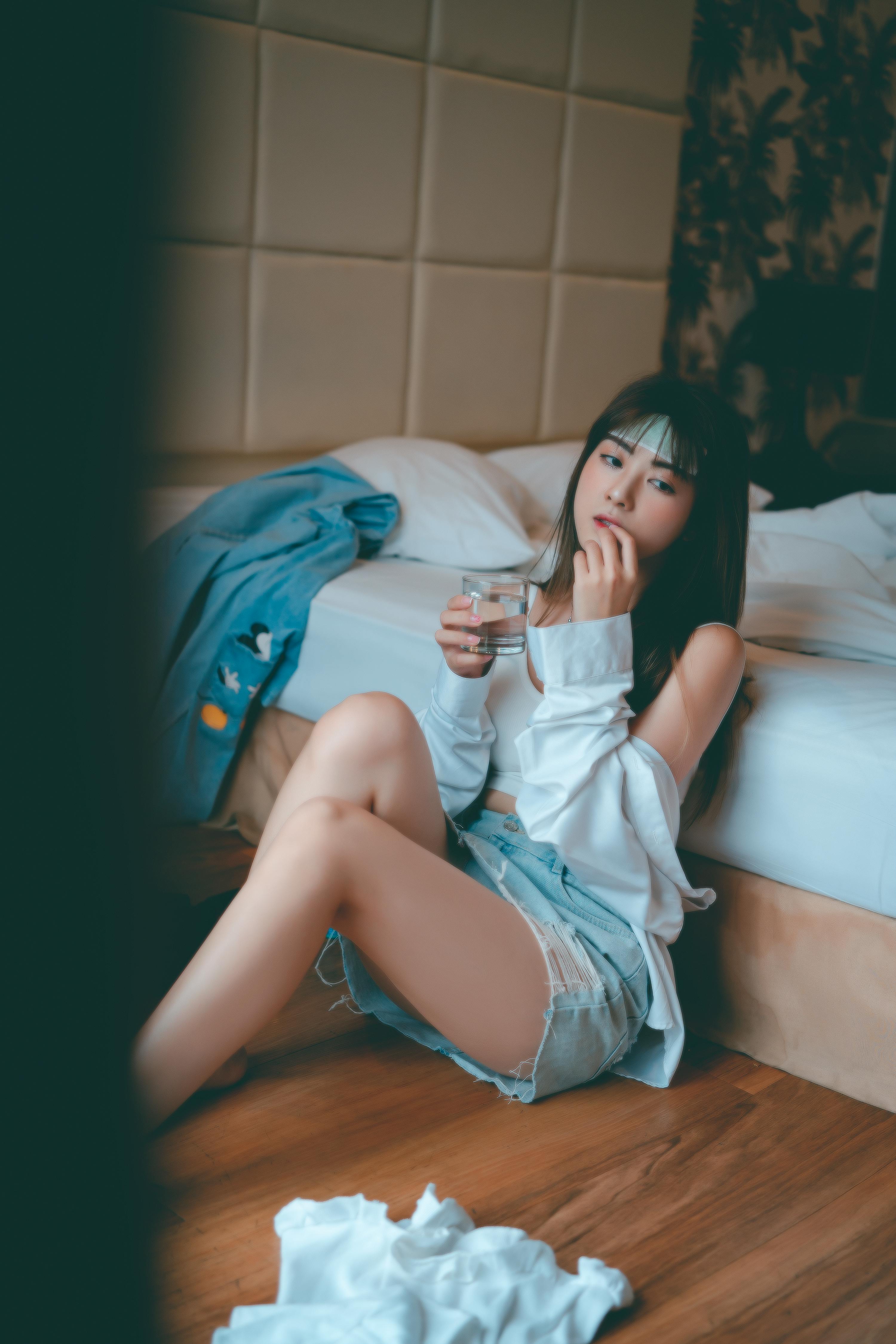 暖调的光线漫过卧室,木色地板、软白床品,连随意搭在床沿的牛仔外套,都透着松弛的居家气息。一身简约白吊带搭配浅蓝牛仔短裤,白衬衫随意搭在肩头,随性又带着一丝慵懒的性感,像刚从一场温柔的午后小憩里醒来。