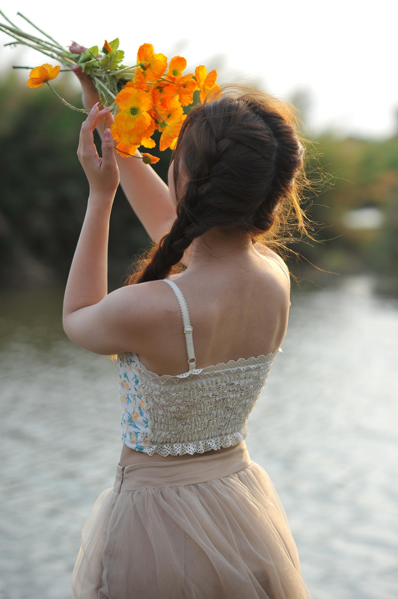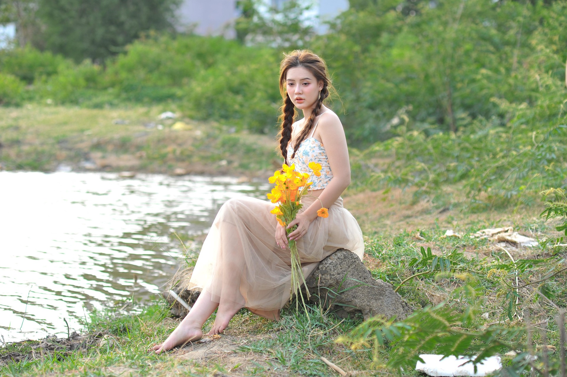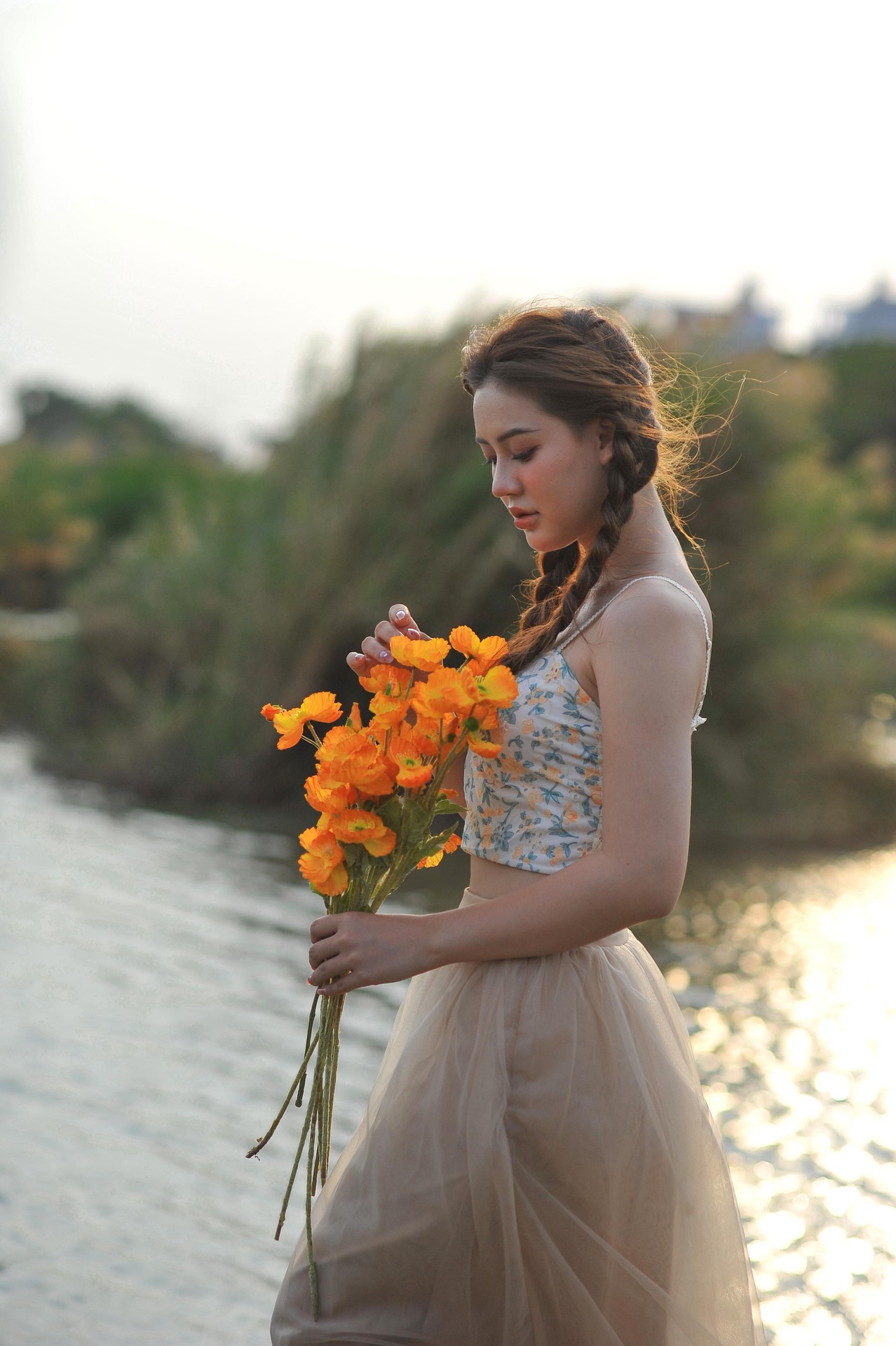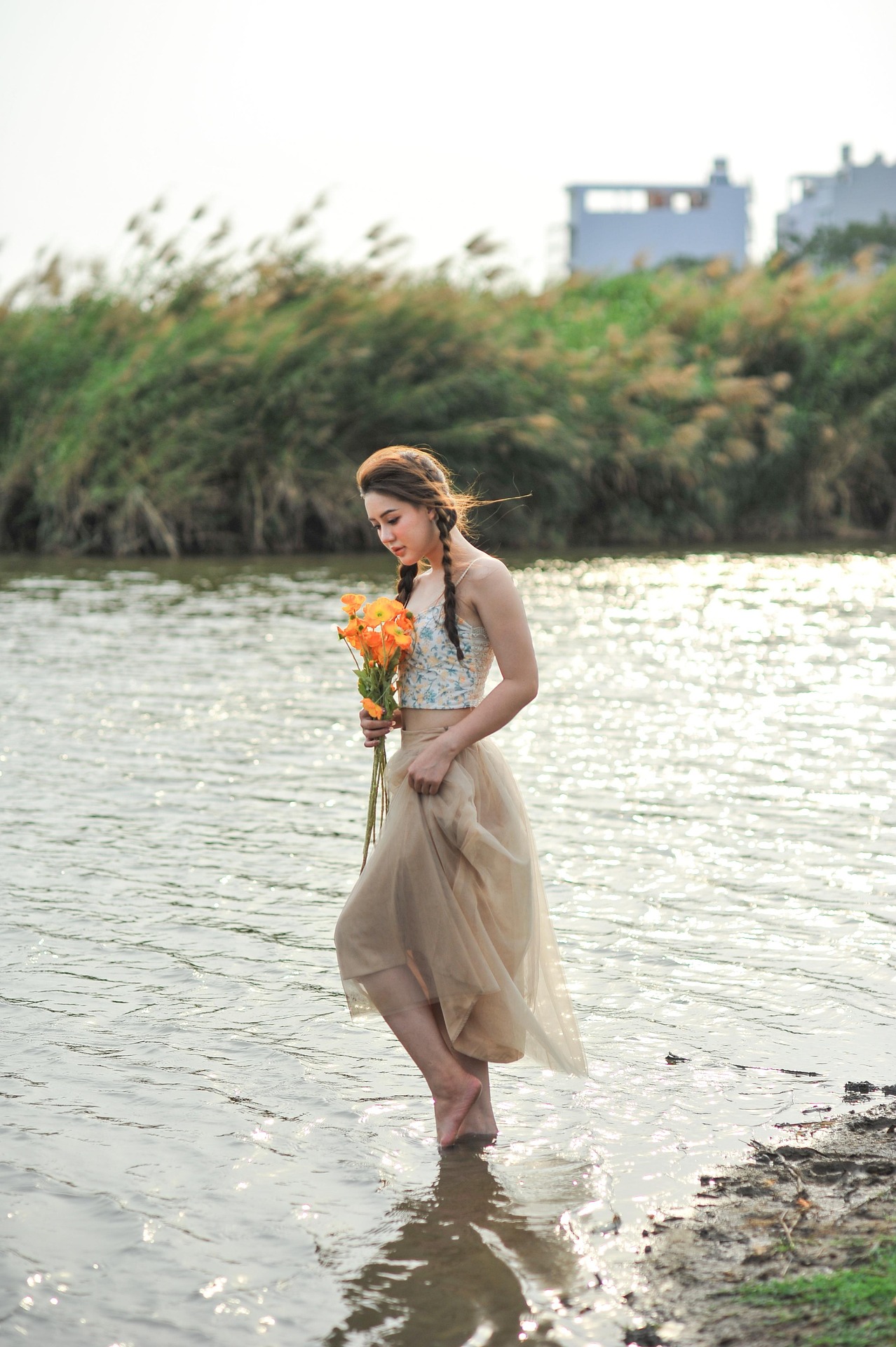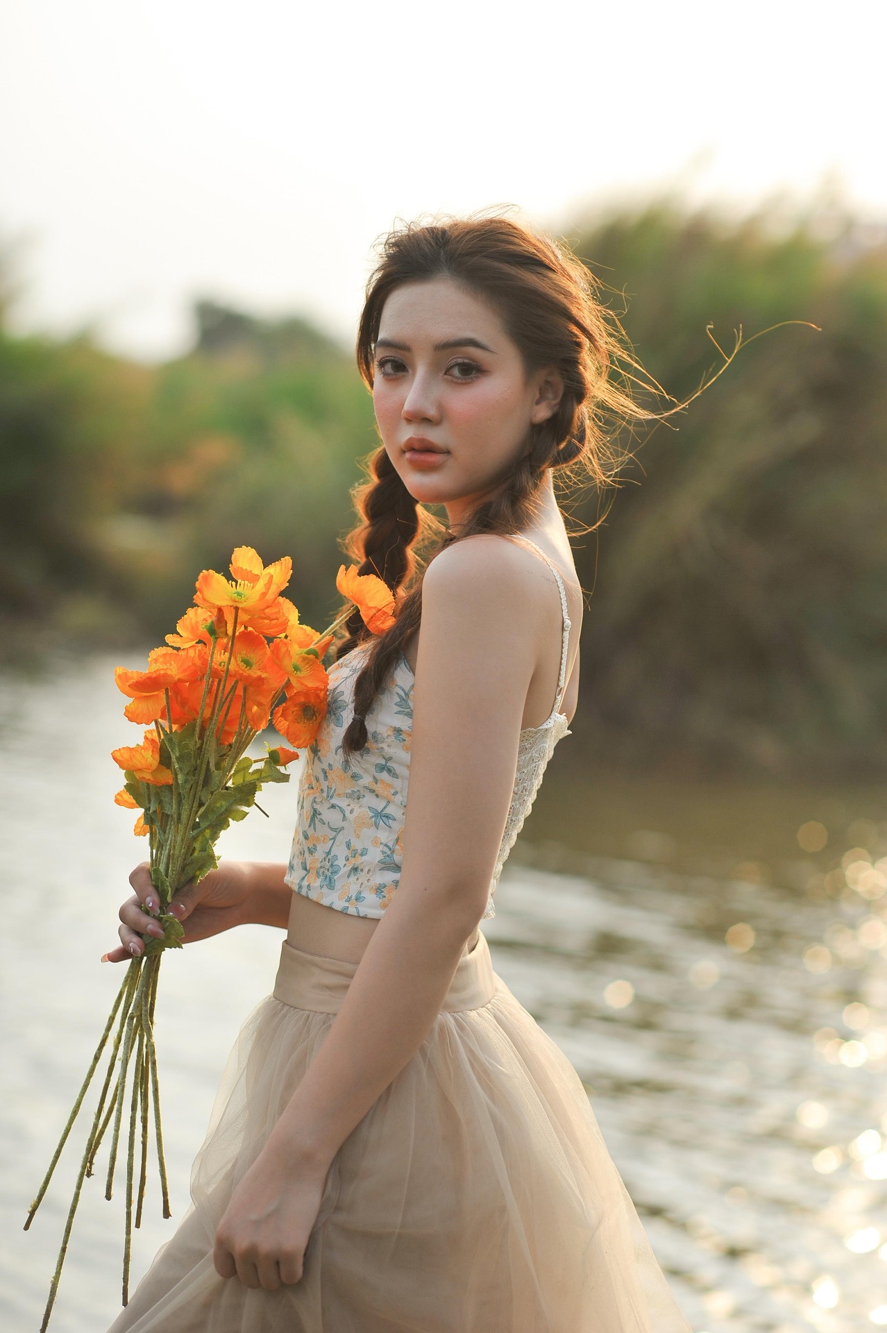少女梳着灵动的麻花长辫,碎花吊带搭配轻盈裸色纱裙,赤脚踩在浅浅水岸边,裙摆随微风轻轻晃动。手中一束明艳暖橘色小花,像攥住了一整个傍晚的阳光,鲜亮又明媚。