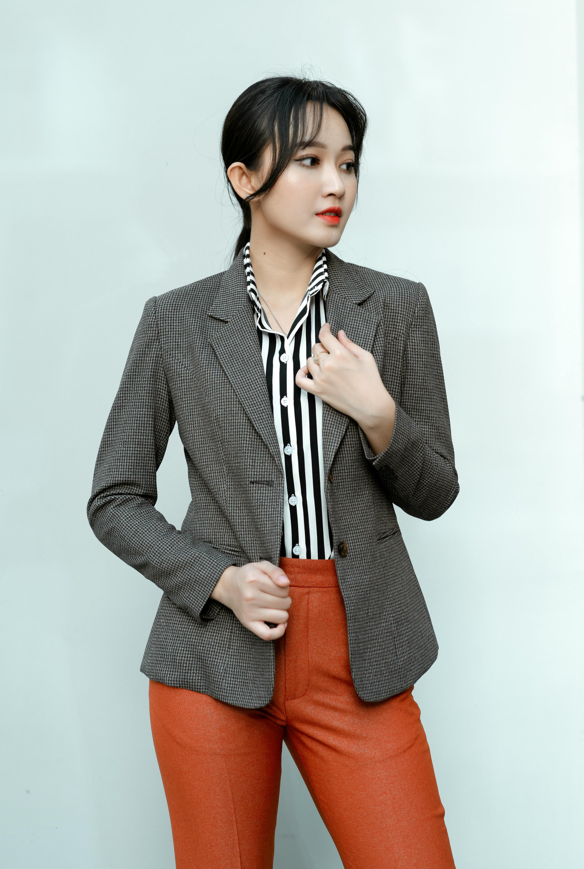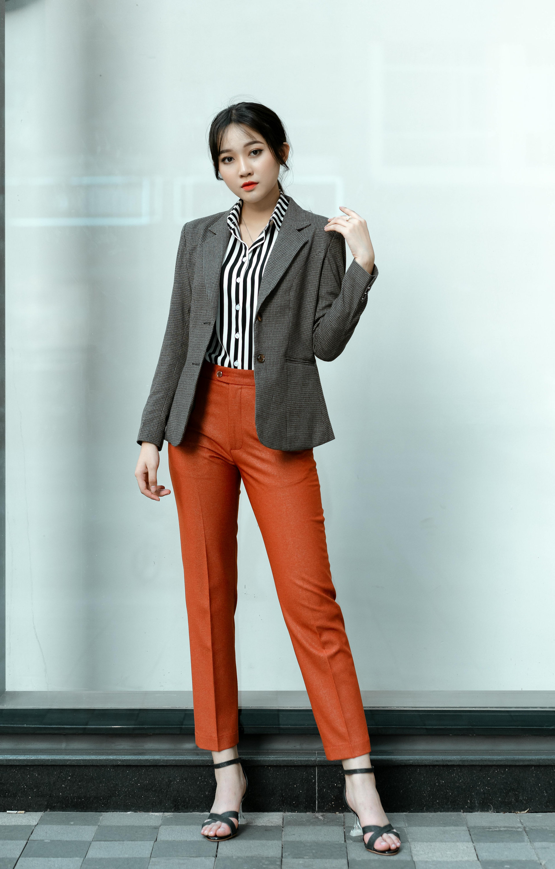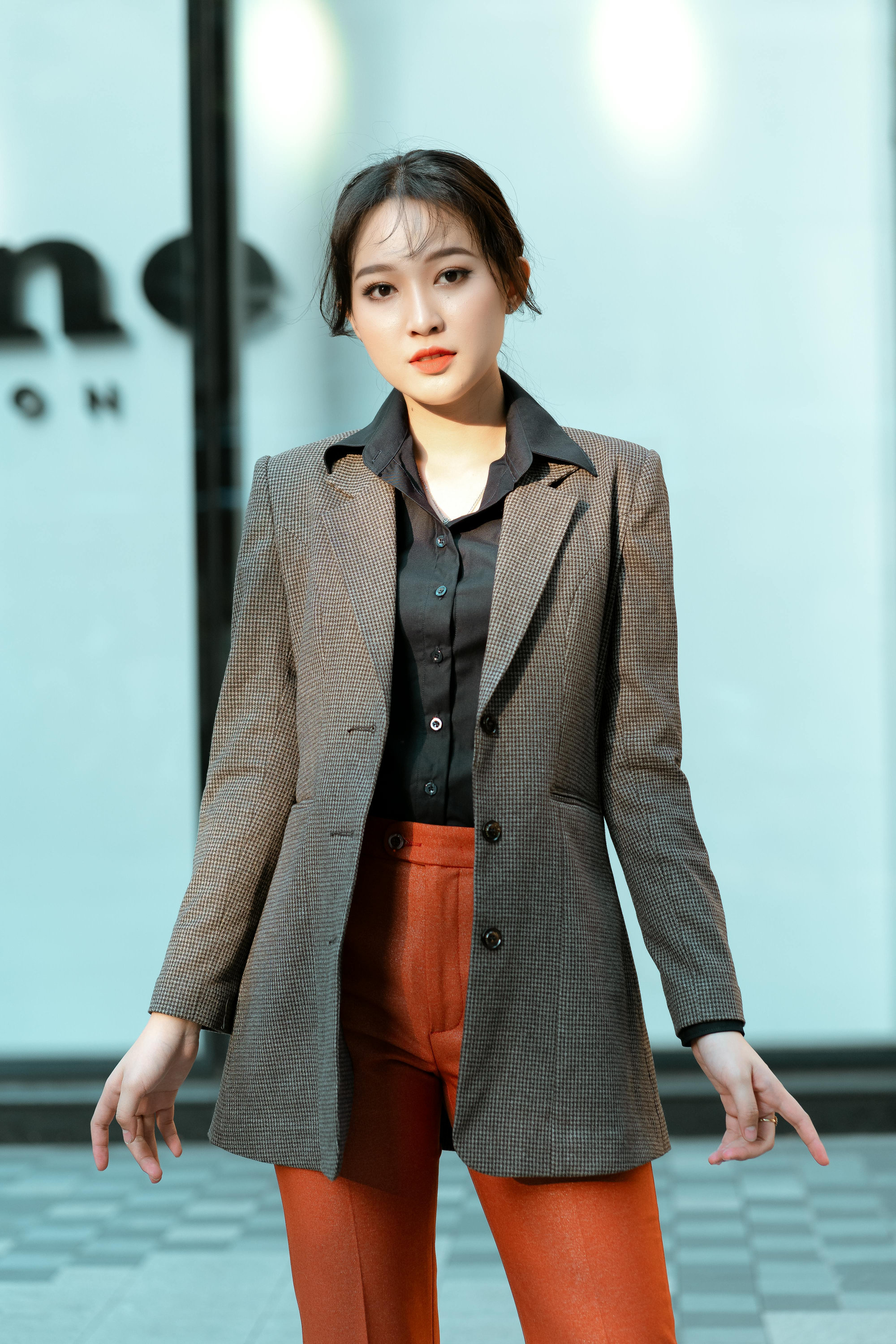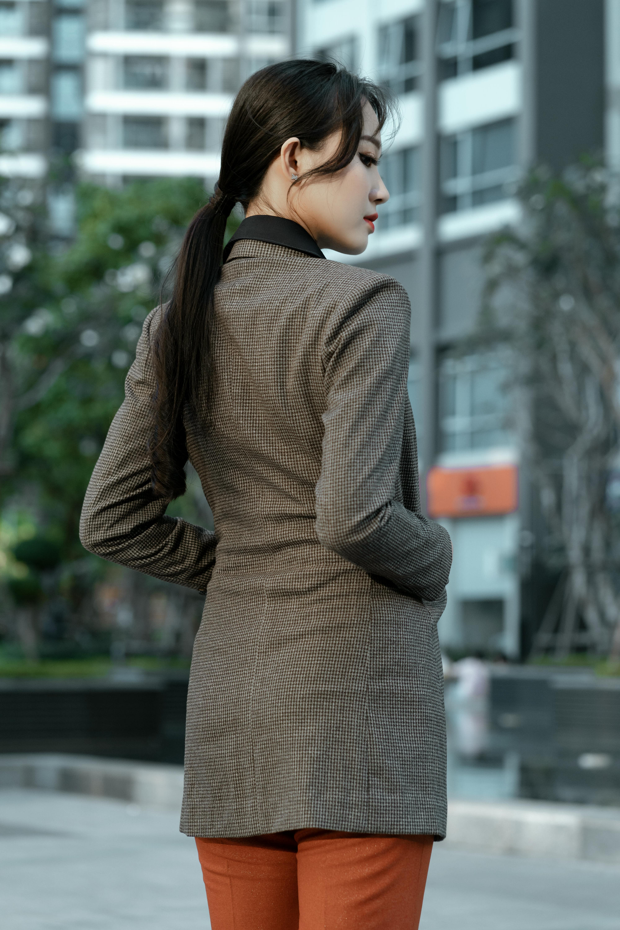 站在城市楼宇之间,光影落在挺括的面料上,每一个转身、回眸、抬手的姿态,都透着从容笃定的气场。可正式、可松弛,既能 hold 住职场里的专业场合,也能轻松适配街头随性街拍。