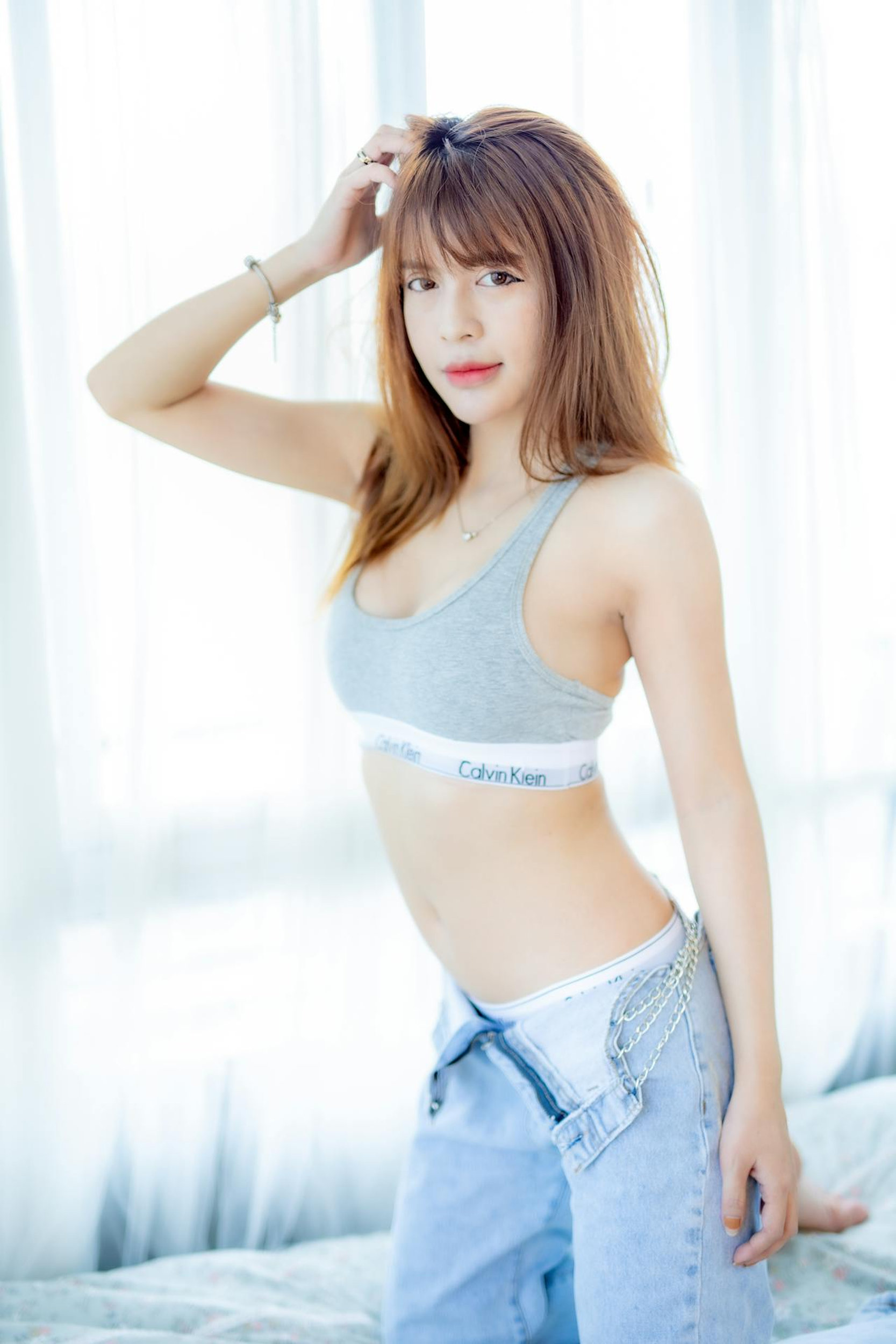她们穿着简约的运动内衣和牛仔裤,或是清爽的体操服,在洒满阳光的房间里,和柔软的床、抱枕、沙发为伴。有的趴在碎花床单上,眼神里带着一丝慵懒的故事感;有的抱着枕头,像软乎乎的棉花糖一样甜;有的靠在沙发上,光影勾勒出流畅的线条,温柔又灵动。