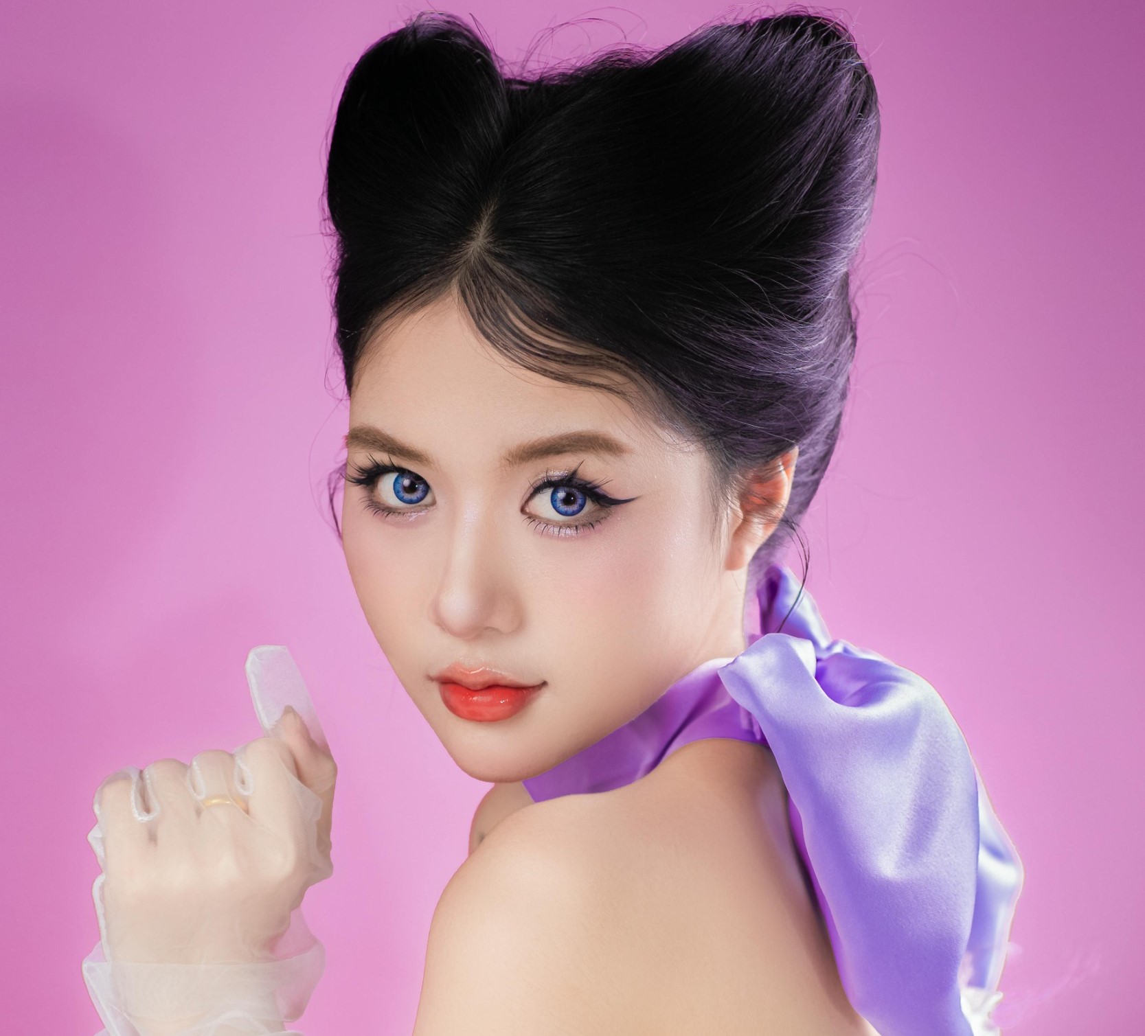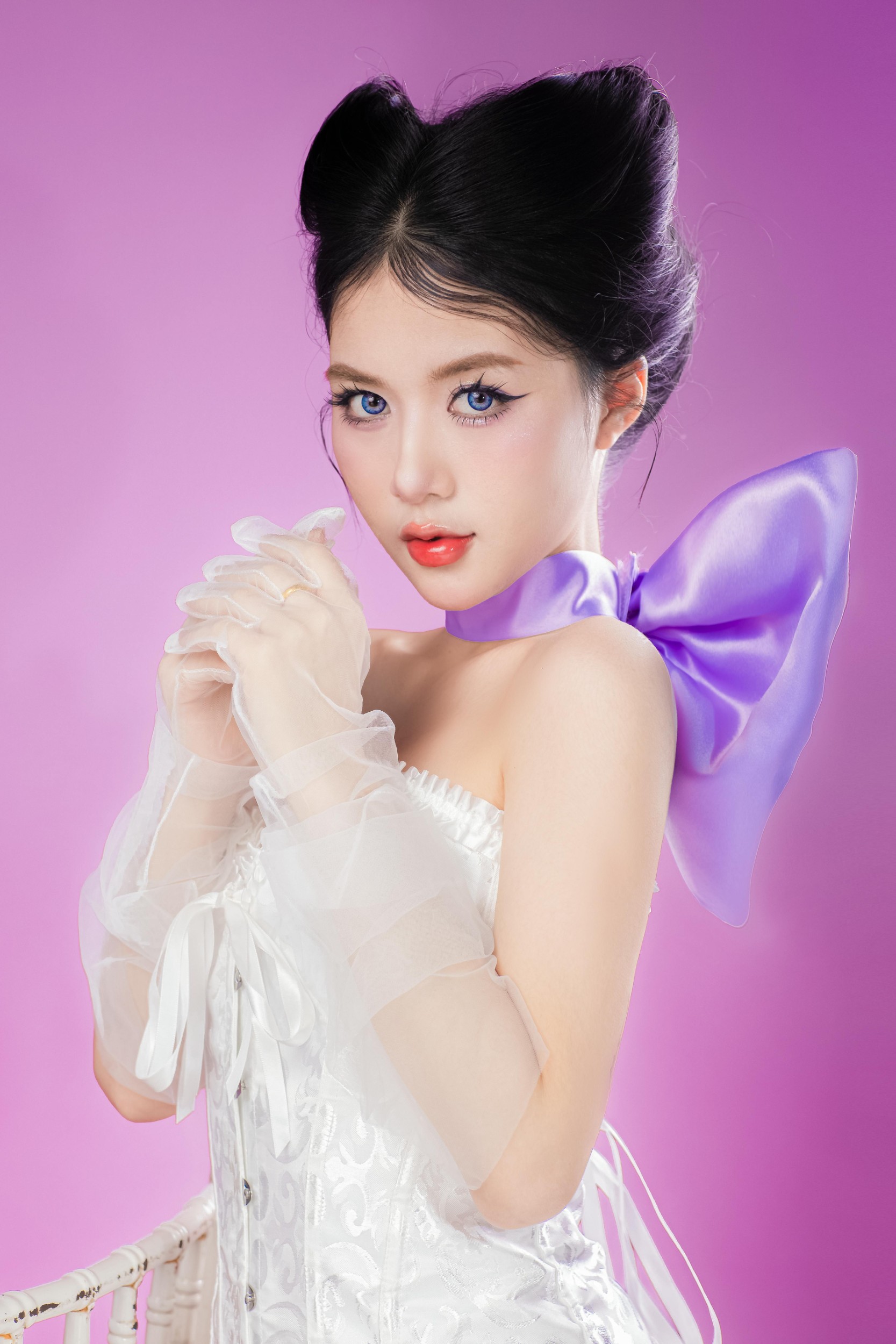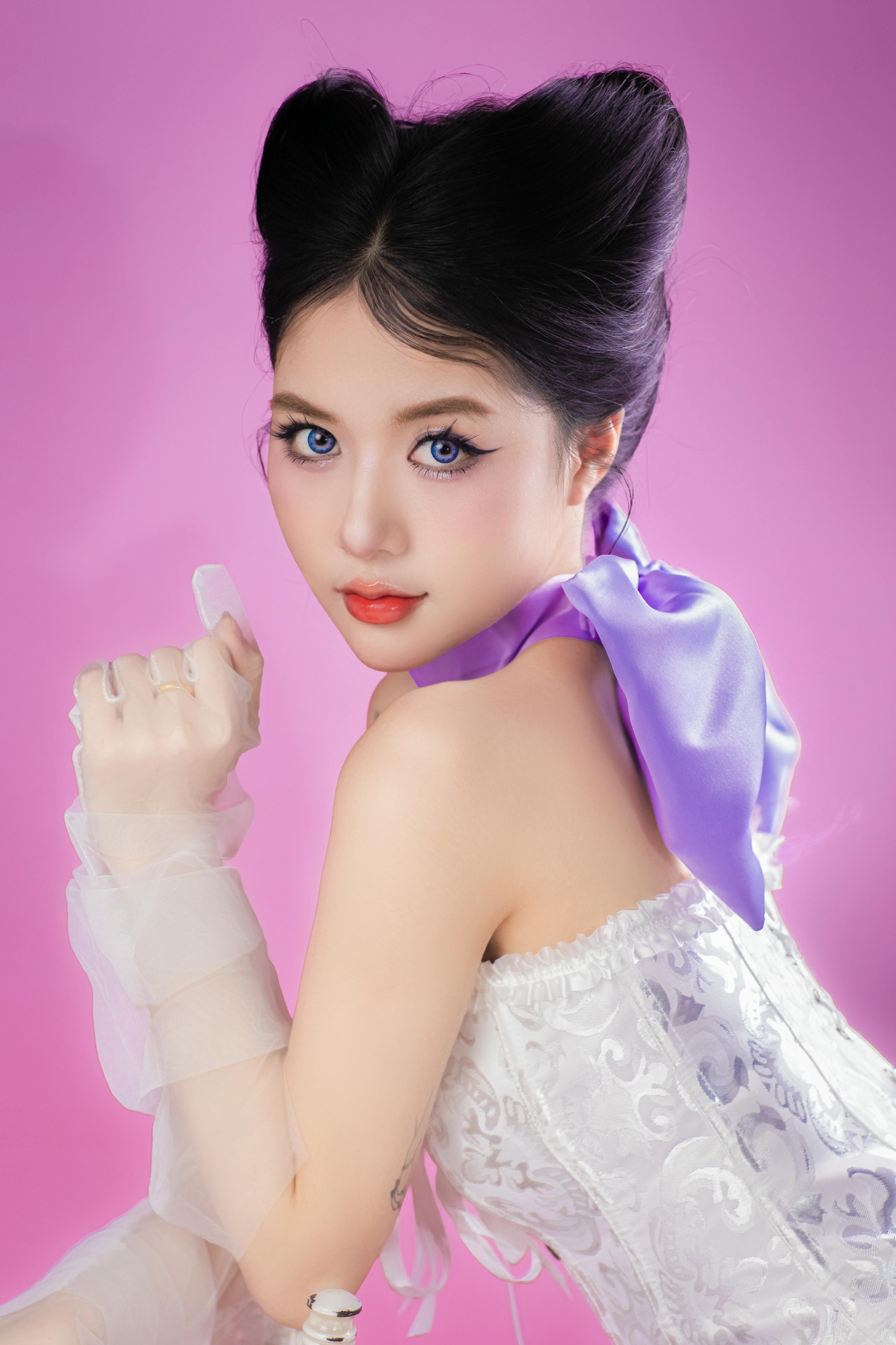 她手持精致镜子,指尖轻触唇瓣,或是捧着甜甜圈,眼尾上扬的眼线与亮片眼妆,让眼神灵动又勾人。整套造型在甜美元素中融入了酷感,像从童话里走出来的公主,又带着一丝不驯的猫系气质,在粉紫调的光影里,甜度与气场同时在线,让人一眼心动。