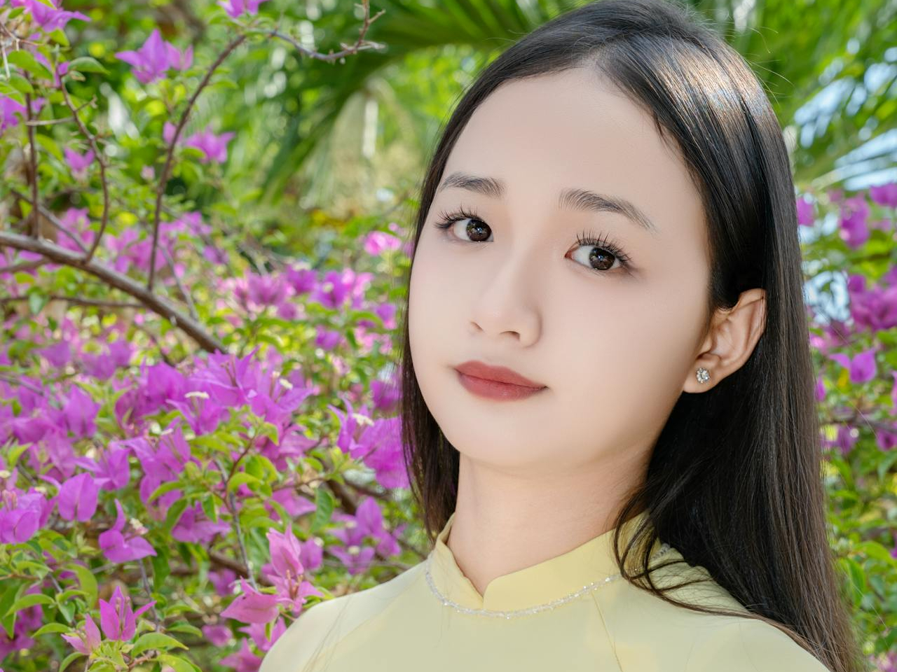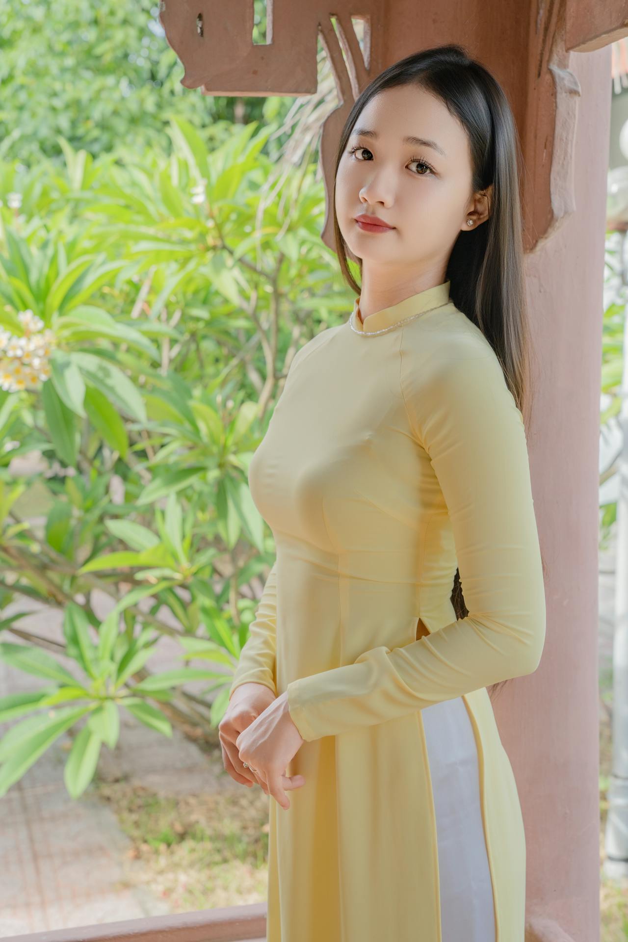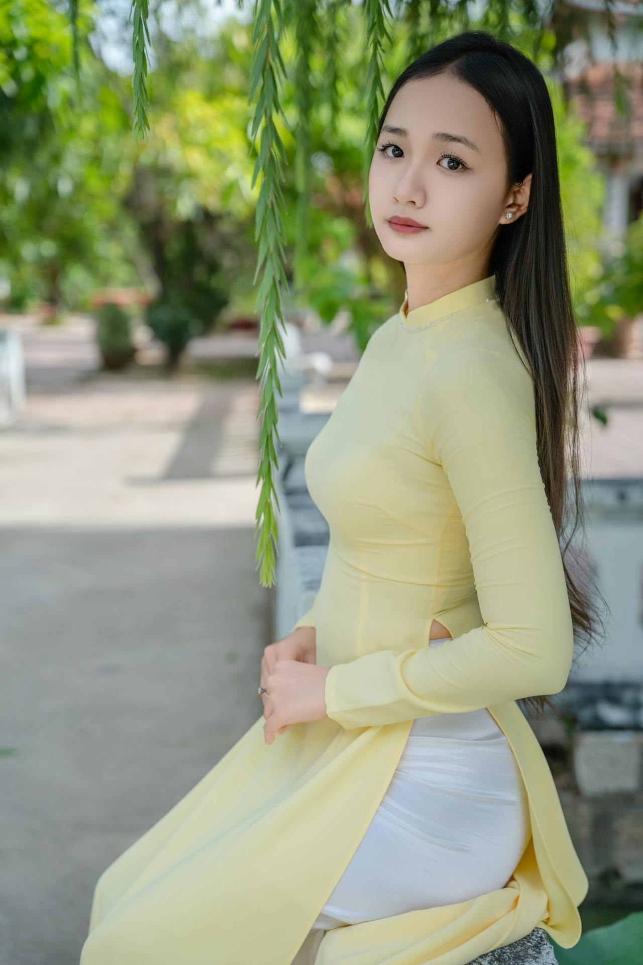 她穿着鹅黄色的奥黛,修身的剪裁勾勒出优雅的线条,领口的细钻在阳光下闪着细碎的光。背景里,三角梅开得热烈,垂柳的枝条随风轻晃,庭院里的绿植与古建筑相映成趣。她的眉眼温柔,动作娴静,像一幅从旧时光里走出来的画,自带温婉又清新的气质。