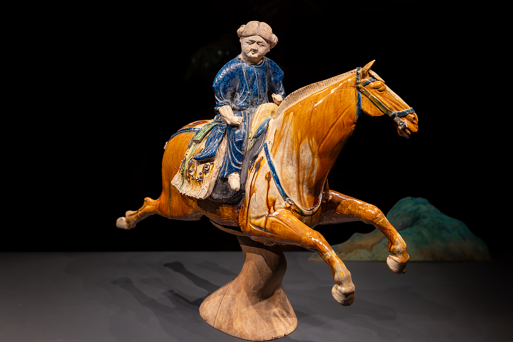 如果说黑釉马藏着盛唐的沉稳,那这匹三彩腾空马,就装下了整个大唐的意气风发。它出土于长安故地的唐代墓葬,是唐三彩中绝无仅有的稀世珍品。骏马四蹄腾空,昂首飞驰,马尾飞扬,浑身都透着一往无前的力量,马背上的少年胡服加身,回眸远眺,满眼都是自信与坦荡。它定格了盛唐最动人的瞬间,有丝绸之路带来的开阔眼界,有胡汉交融的鲜活风情,更有大唐子民不惧远方、奔赴山海的精气神。这不是一匹普通的陶马,而是一个盛世的缩影,让每一个看见它的人,都忍不住心生向往,爱上那个光芒万丈的大唐。