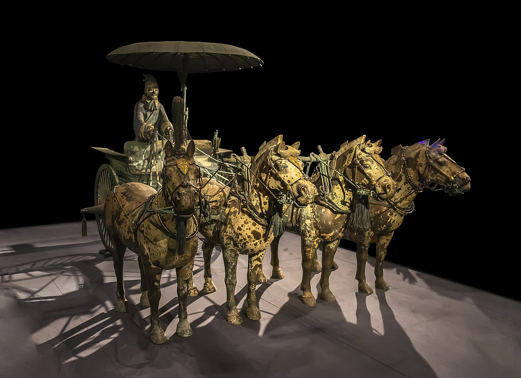 两千年多前,当秦始皇横扫六合、一统天下,他把一整个帝国的秩序与威严,都铸进了这驾铜车马之中。它静静沉睡在秦始皇陵西侧的地下,跨越千年时光,终于重见天日。四匹骏马身姿挺拔,步调规整,每一根缰绳、每一处结构都精准严谨,如同一个运转有序的国度,容不得半分错乱。它不只是一件陪葬的器物,更是秦代大一统王朝最生动的缩影,车马合一、上下协同,藏着一个王朝的雄心与法度。站在它面前,你仿佛能听见千年之前的马蹄声,穿越历史风沙,清晰地落在眼前,让你瞬间读懂,何为大秦帝国的磅礴气象。