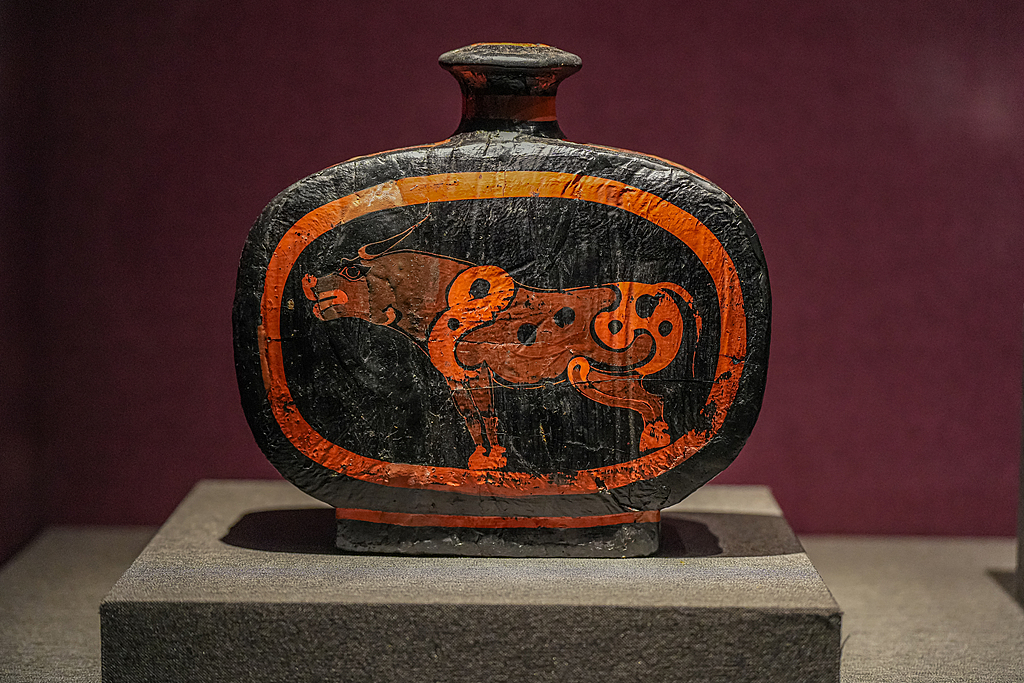 这只小小的漆扁壶,装下了两千多年前,秦人对远方与人生的全部向往。它出土于湖北云梦睡虎地的秦代墓葬,是当年墓主人朝夕相伴的随身器物。漆黑的壶身之上,用灵动的笔触,绘下了奔腾的骏马、沉稳的雄牛,还有振翅高飞的飞鸟。马代表一往无前的速度,牛代表踏实安稳的底气,鸟代表志在四方的胸襟,三者相融,便是古人最朴素也最动人的祝愿:行稳致远,前程万里。它没有惊天动地的故事,却把最温柔的人间期许,封存在漆器之中,让千年之后的我们,依然能感受到,跨越时光的温暖与力量。
