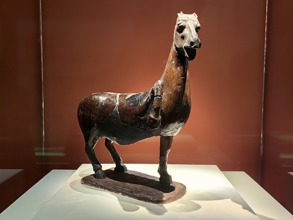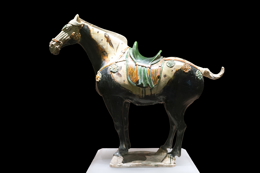这是一匹自带盛唐气场的神驹,藏着一个王朝最自信的模样。它出土于神都洛阳的唐代墓葬,是盛唐工艺与审美的巅峰之作。通体乌黑亮泽的釉色,搭配头部、马蹄处的白斑,如同踏雪而来的神骏,身姿挺拔,气势沉稳,内敛却又自带锋芒。盛唐时期,丝绸之路畅通无阻,西域的良马源源不断进入中原,爱马、尚马,是整个时代的风潮。马不再只是战马,更是国力强盛、开放包容的象征,是财富、气度与格局的体现。站在它面前,你仿佛能看见万国来朝的盛唐长安,感受到那个时代独有的磅礴底气与盛世风华。