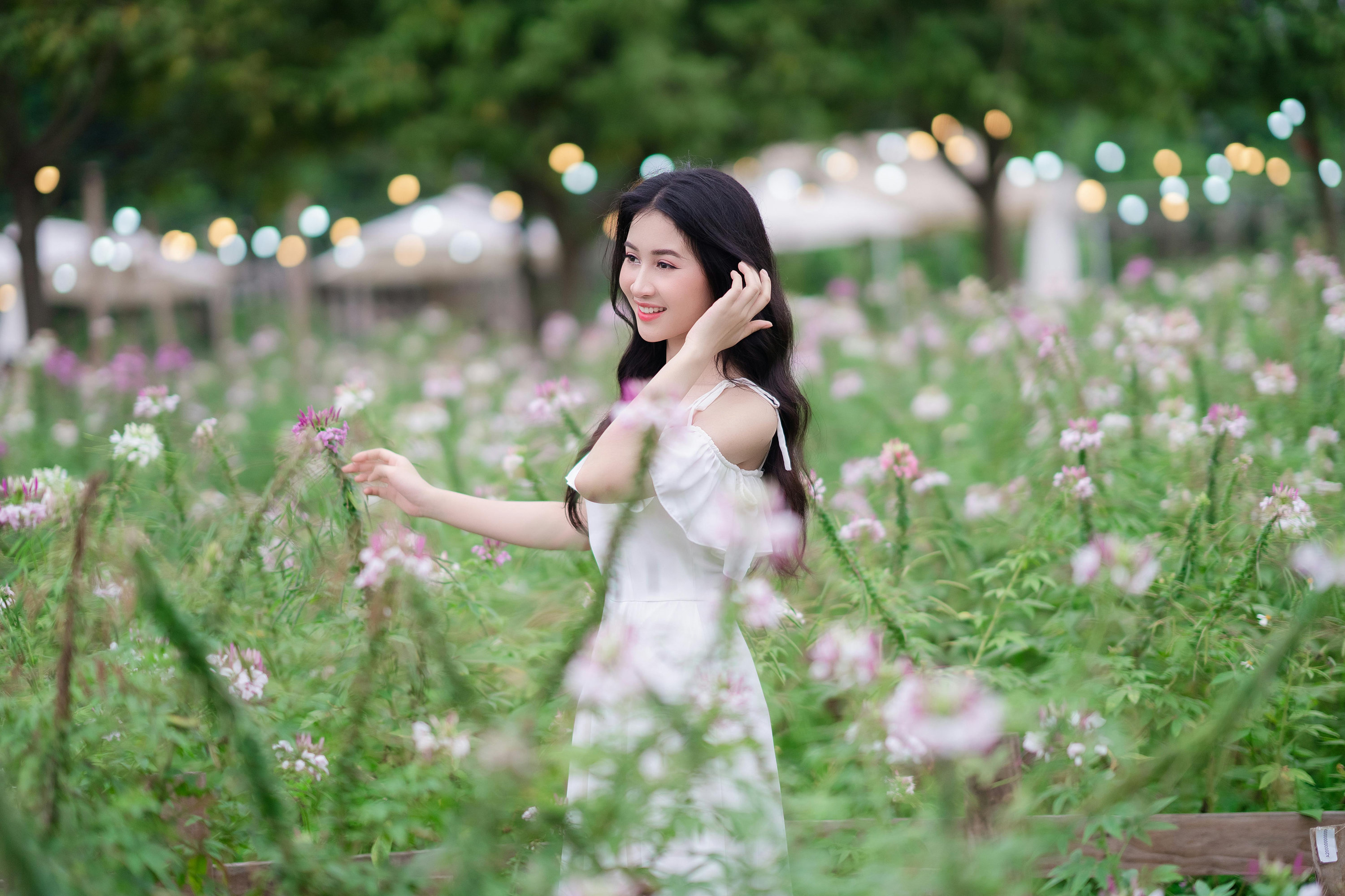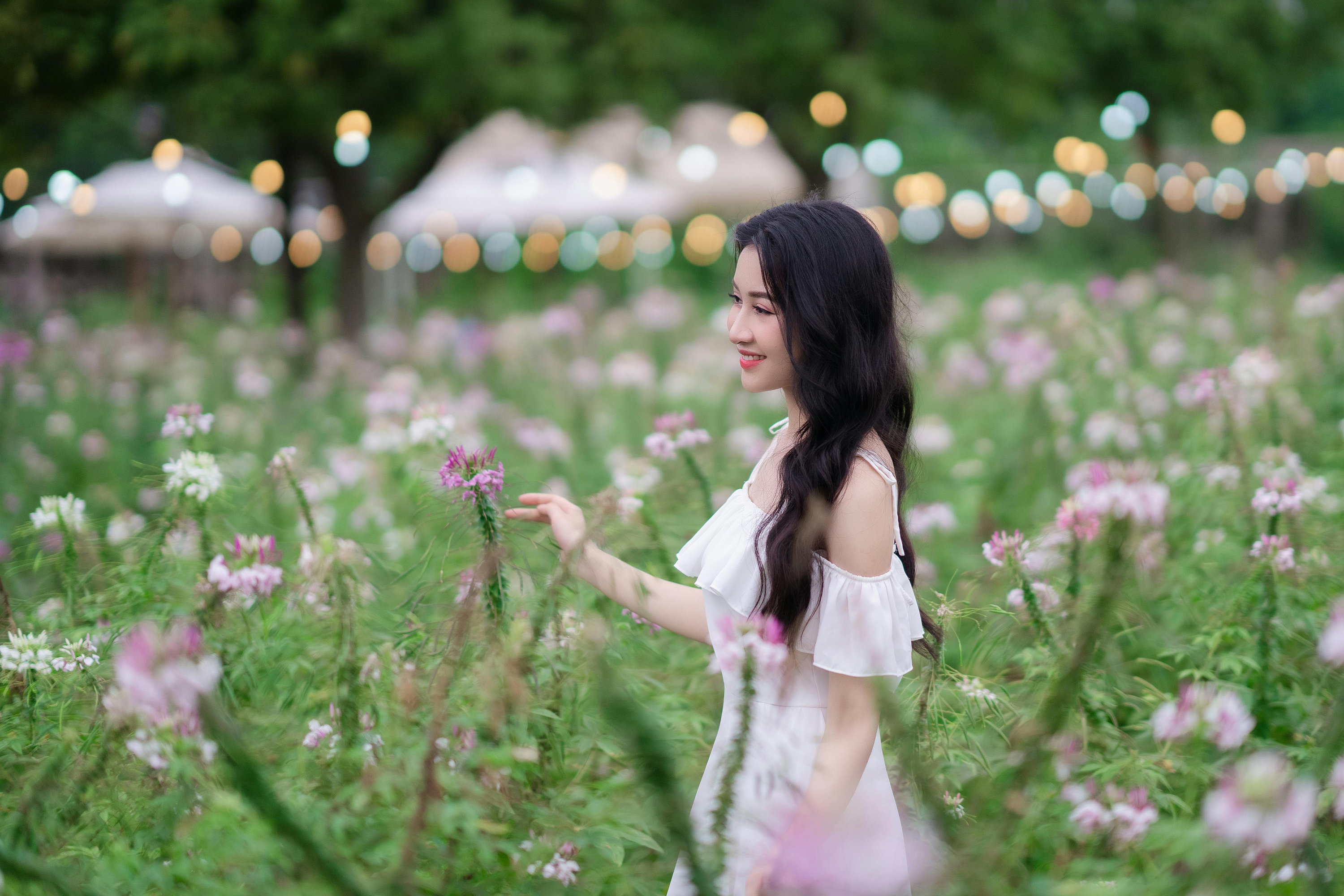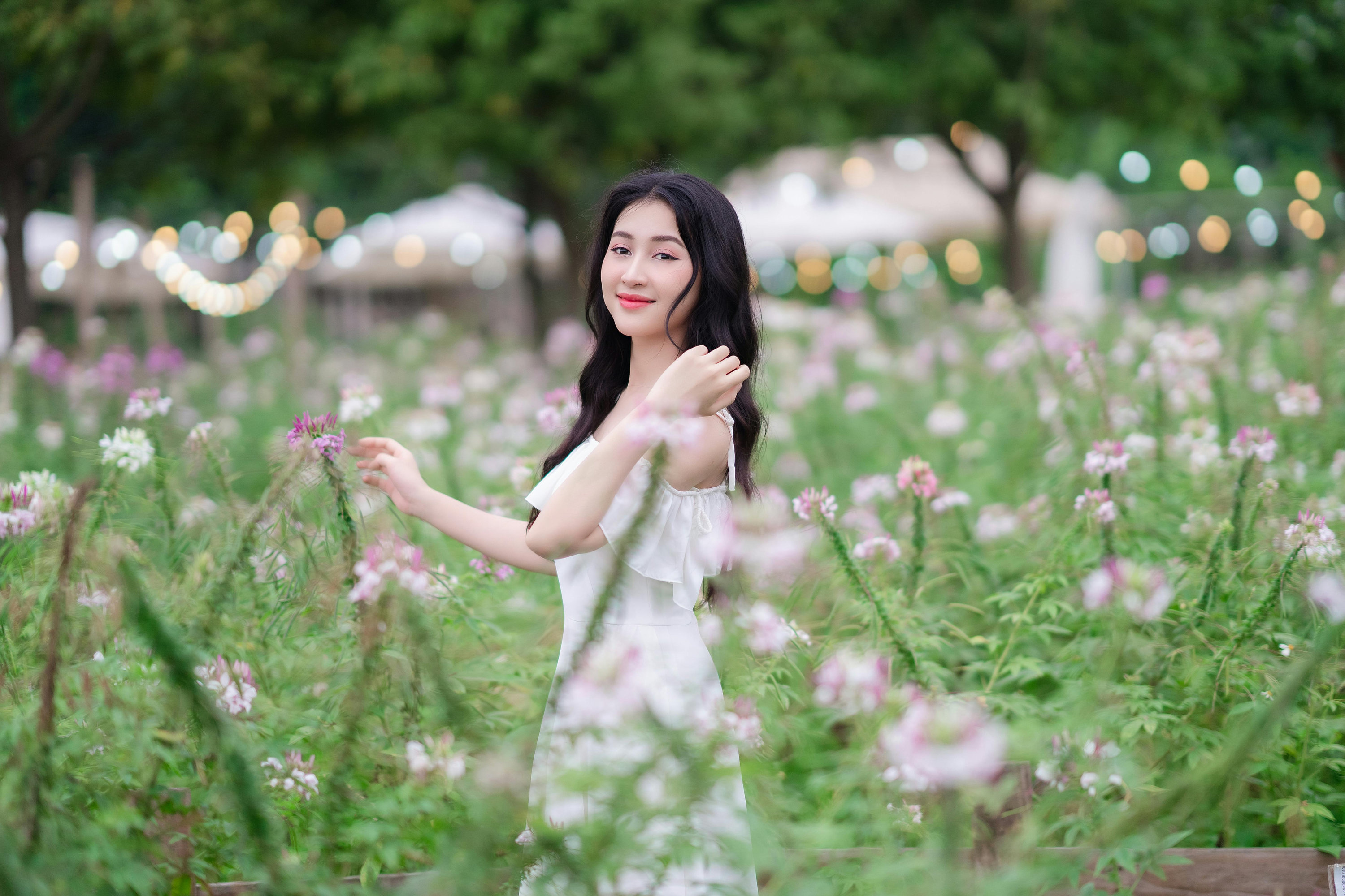她穿着干净的露肩白裙,站在粉白相间的醉蝶花丛中,长发被风轻轻吹动,笑容像夏日的阳光一样明亮。背景里,成片的花海与绿意盎然的树木,还有远处的暖黄灯串,为画面镀上了一层朦胧的柔光。她或轻触花瓣,或回眸微笑,或整理发丝,眉眼间都透着少女的灵动与温柔,仿佛从童话里走出来的女主角。