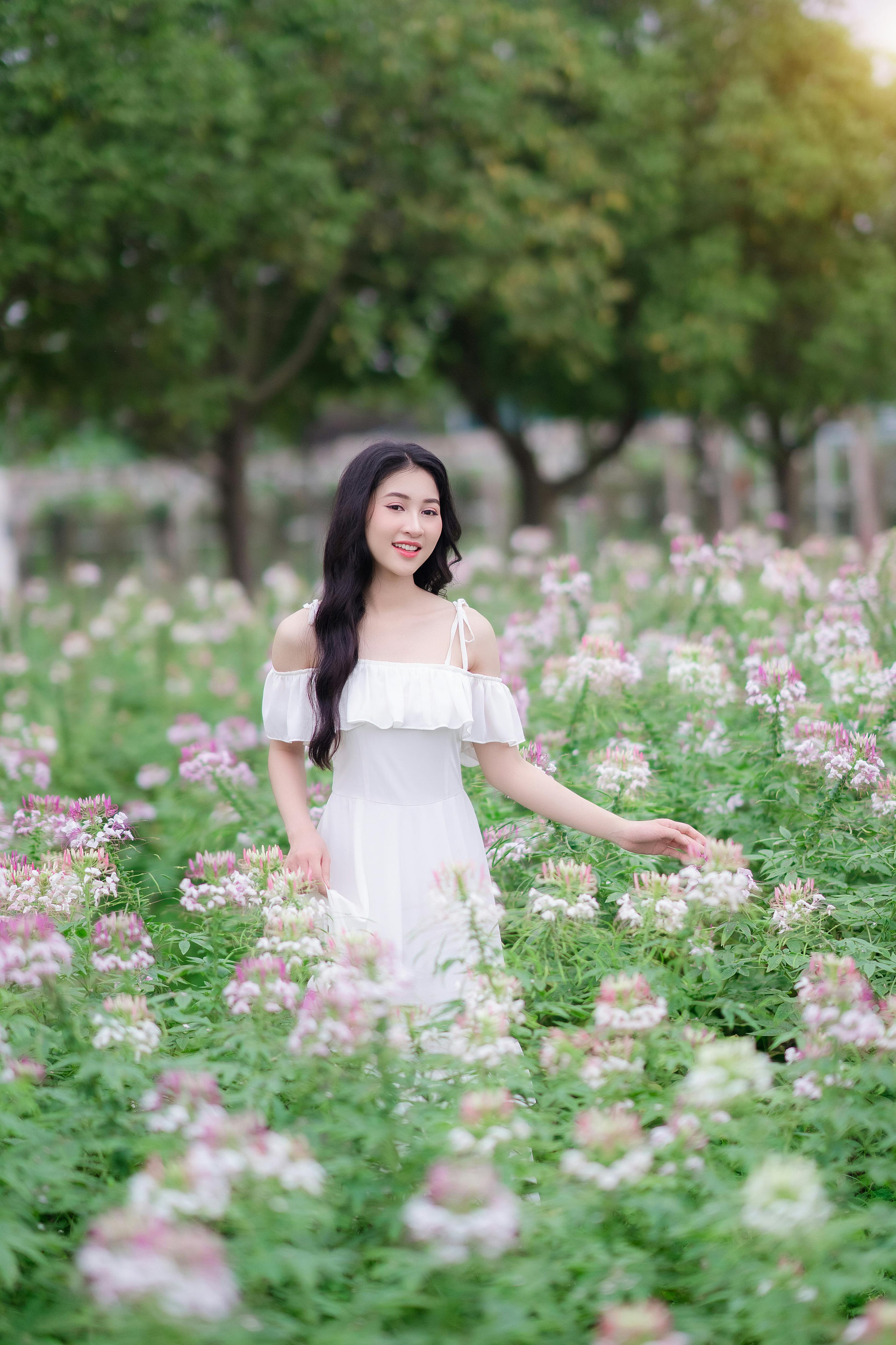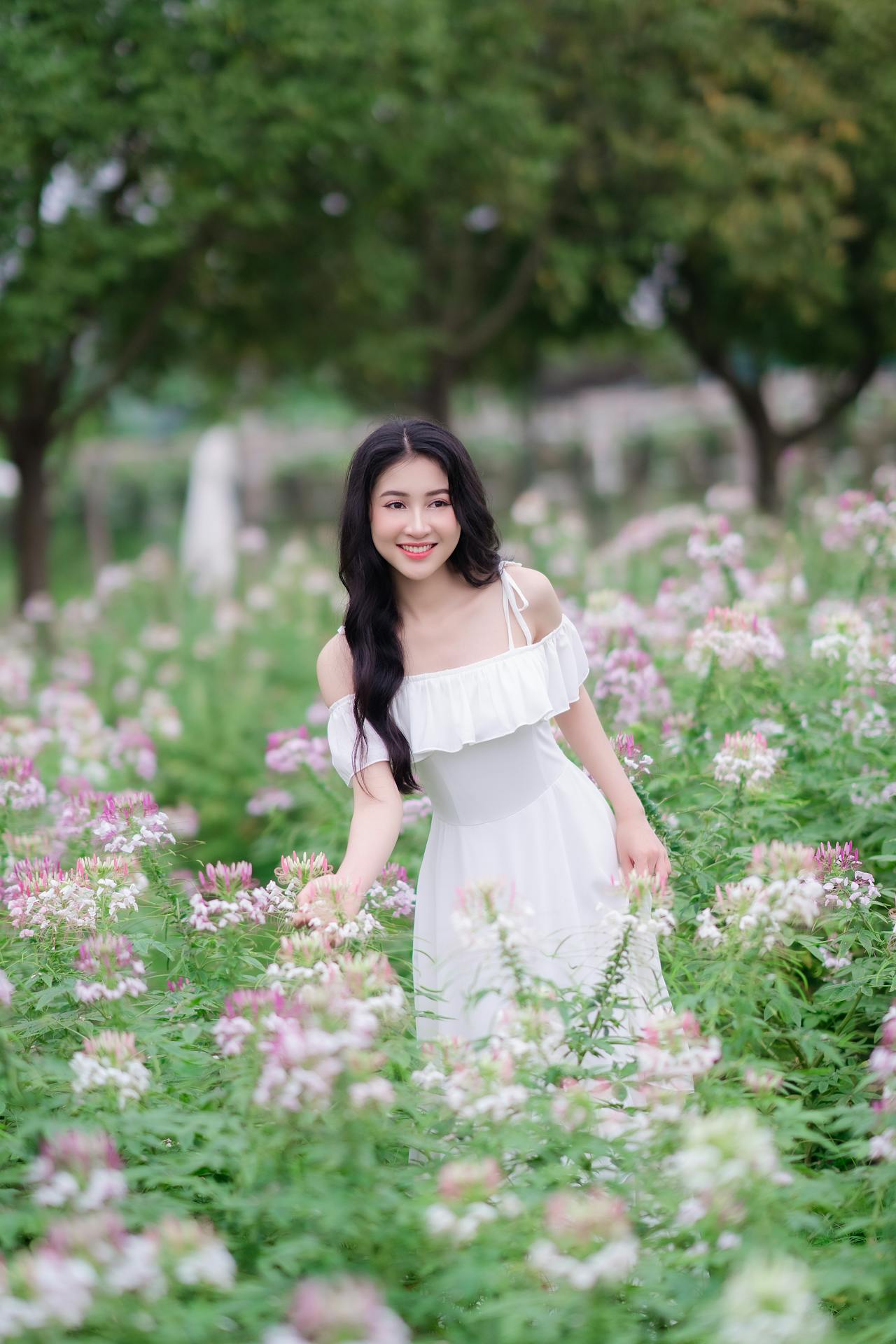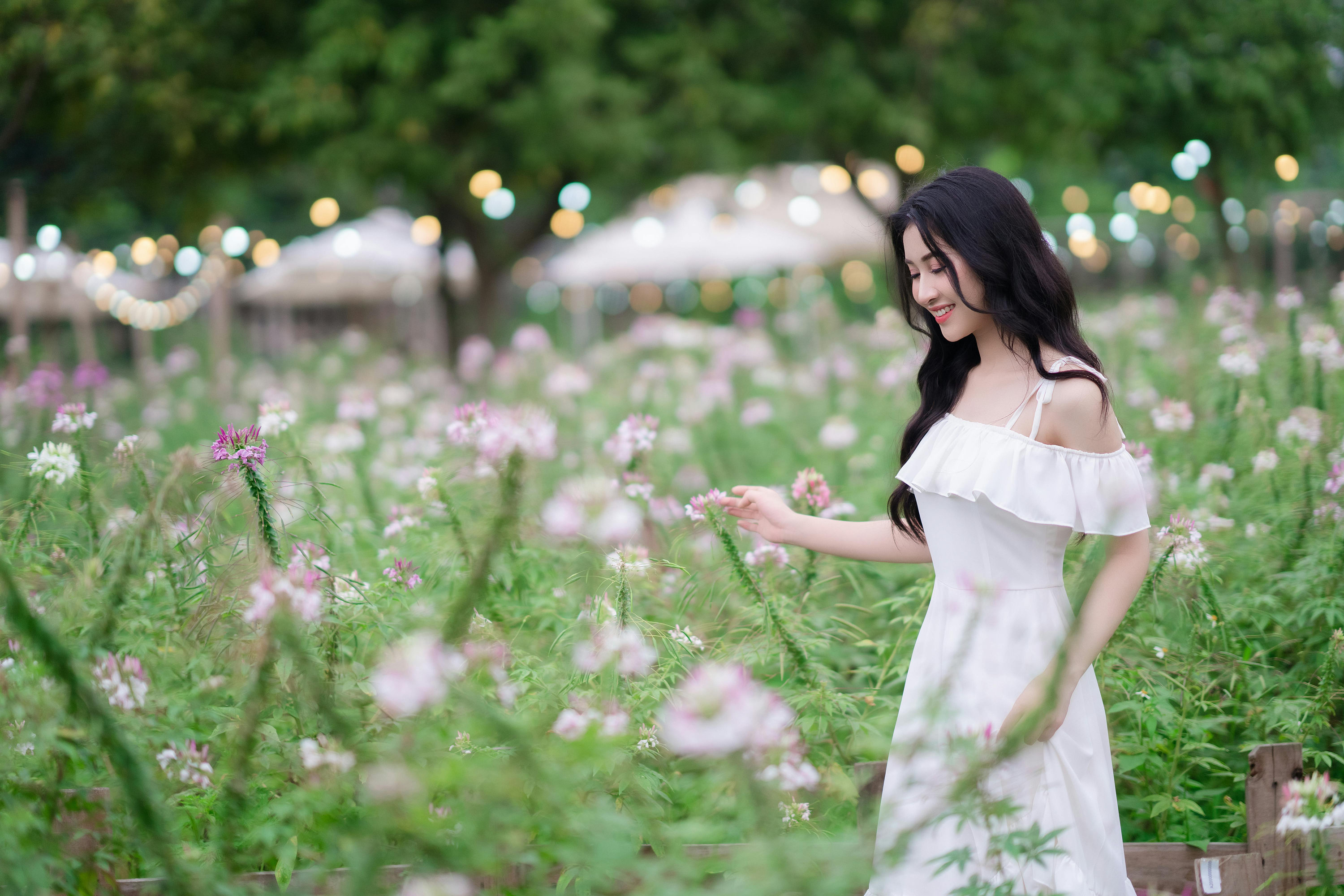 她穿着干净的露肩白裙,站在粉白相间的醉蝶花丛中,长发被风轻轻吹动,笑容像夏日的阳光一样明亮。背景里,成片的花海与绿意盎然的树木,还有远处的暖黄灯串,为画面镀上了一层朦胧的柔光。她或轻触花瓣,或回眸微笑,或整理发丝,眉眼间都透着少女的灵动与温柔,仿佛从童话里走出来的女主角。