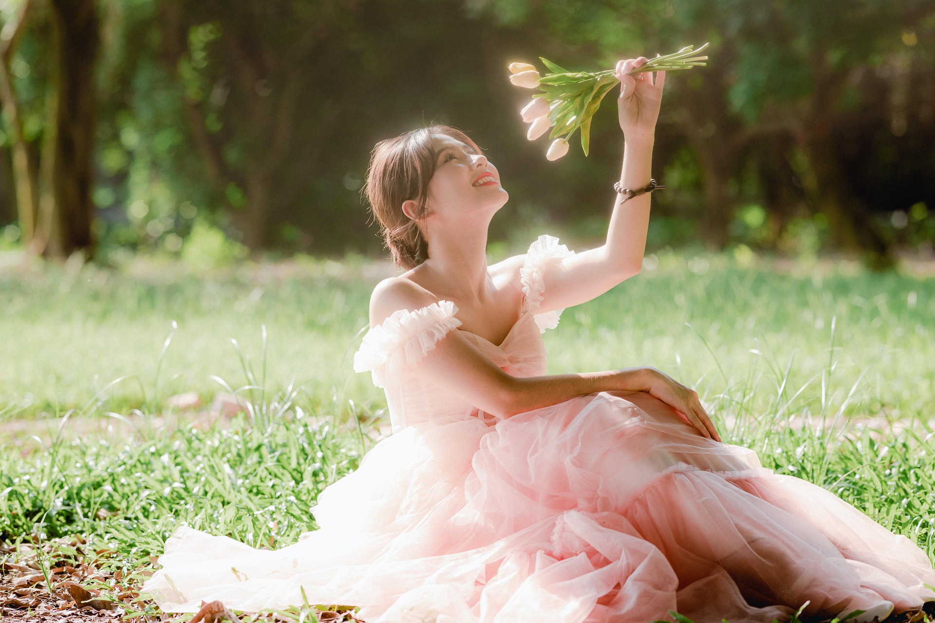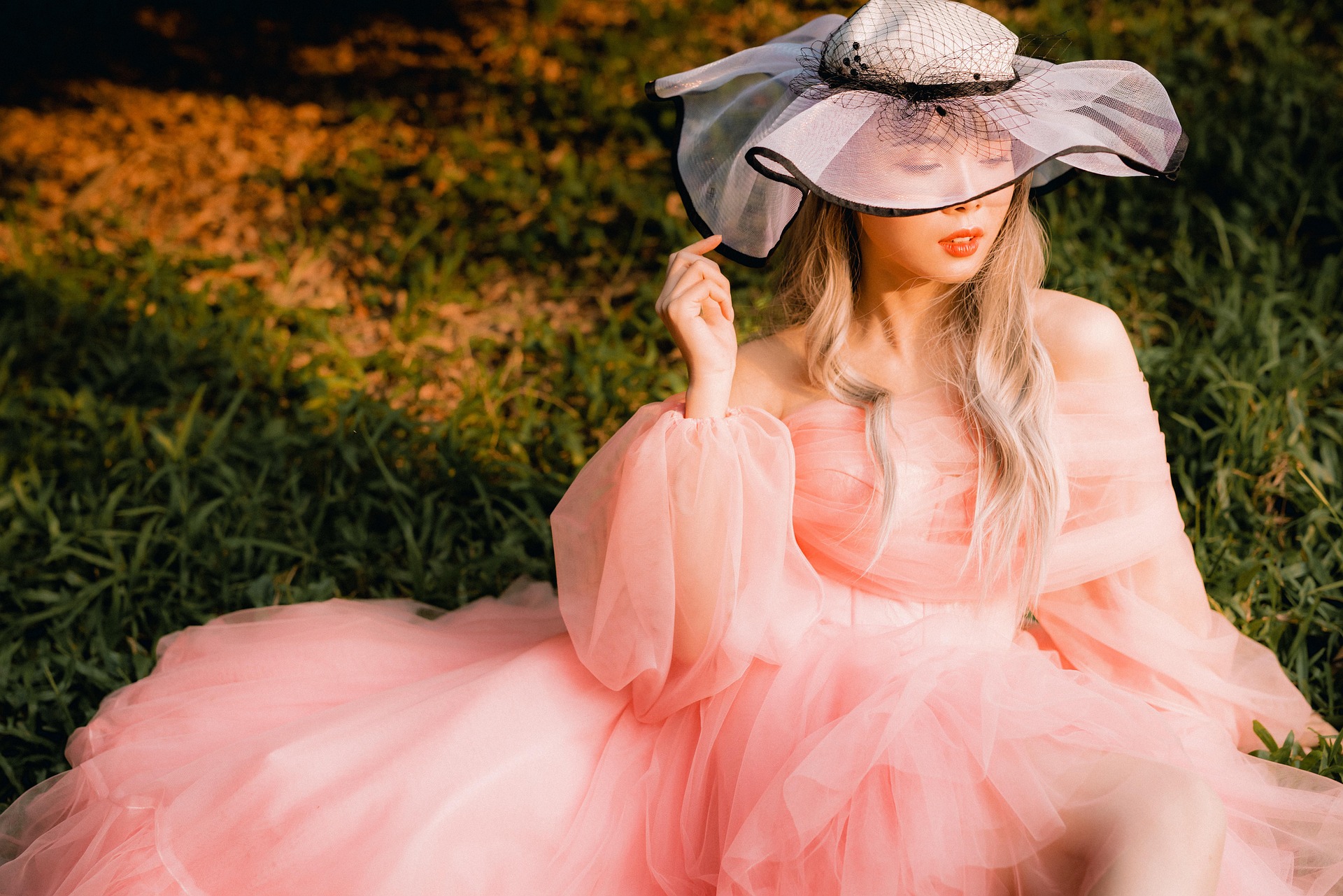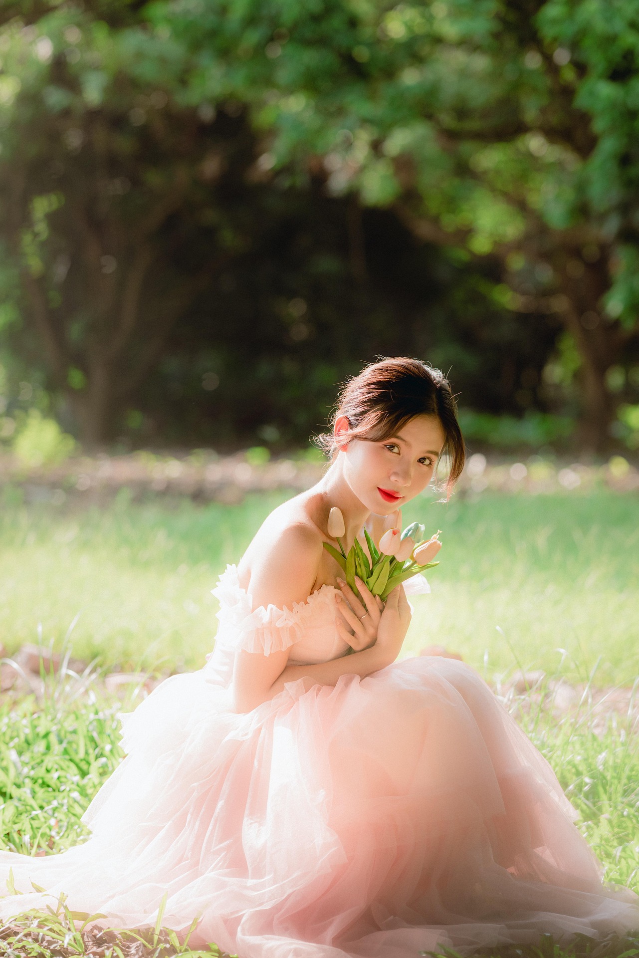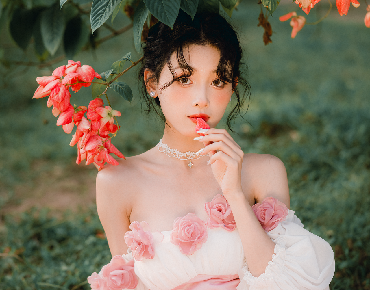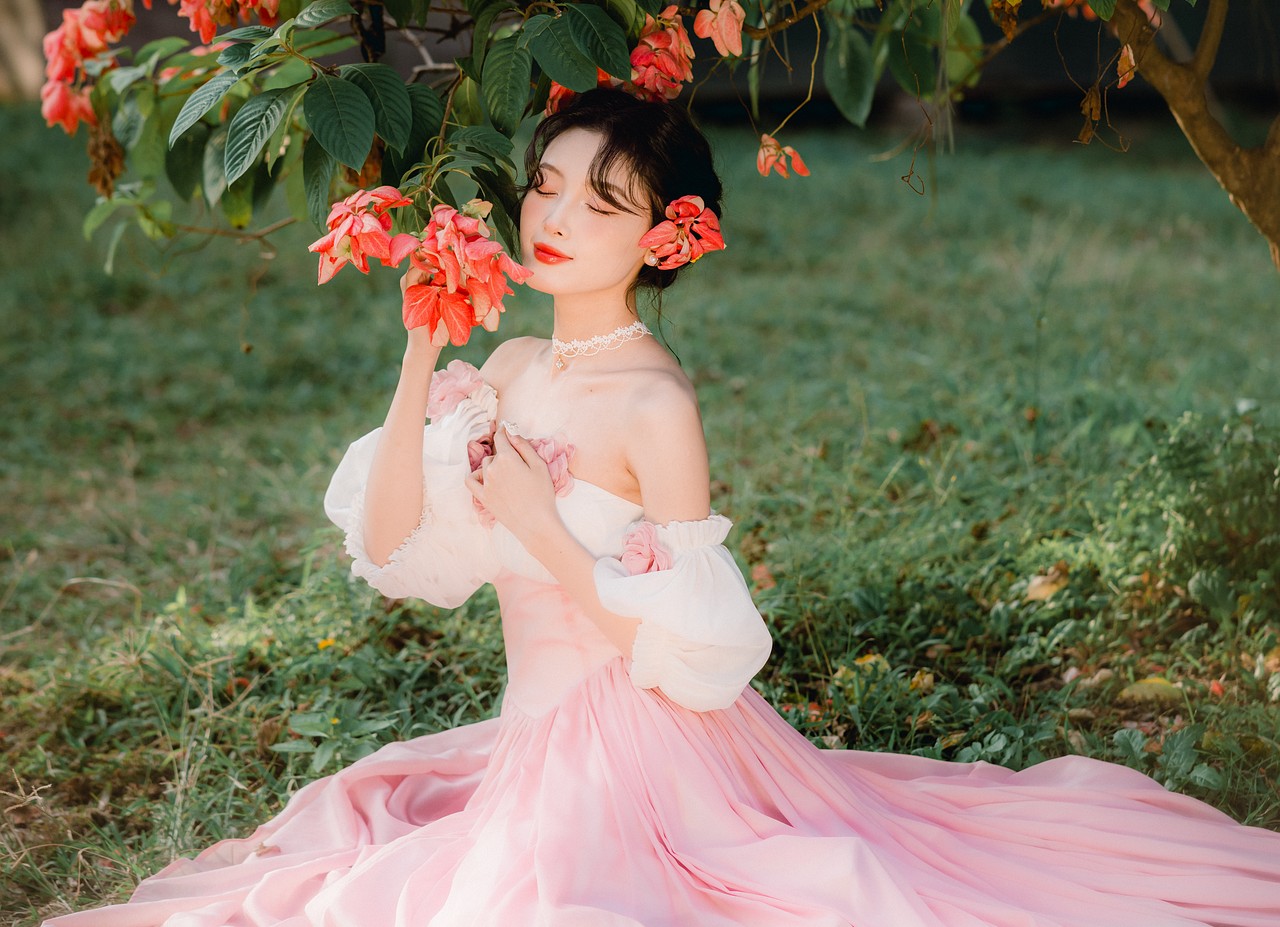 阳光穿过树叶的缝隙,在她的发梢、脸颊和裙摆上织出一层朦胧的光晕,连风都慢了下来,悄悄掀起她的裙角,也吹乱了她鬓边的碎发。她戴着缀满小花的草帽,手里提着装满鲜花的竹篮,像是从 18 世纪的油画里走出来的少女,带着独属于春日的松弛与浪漫。