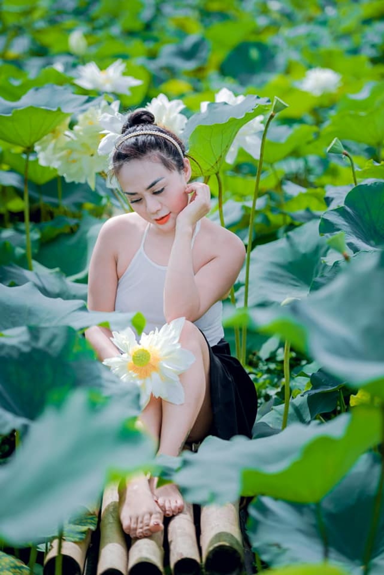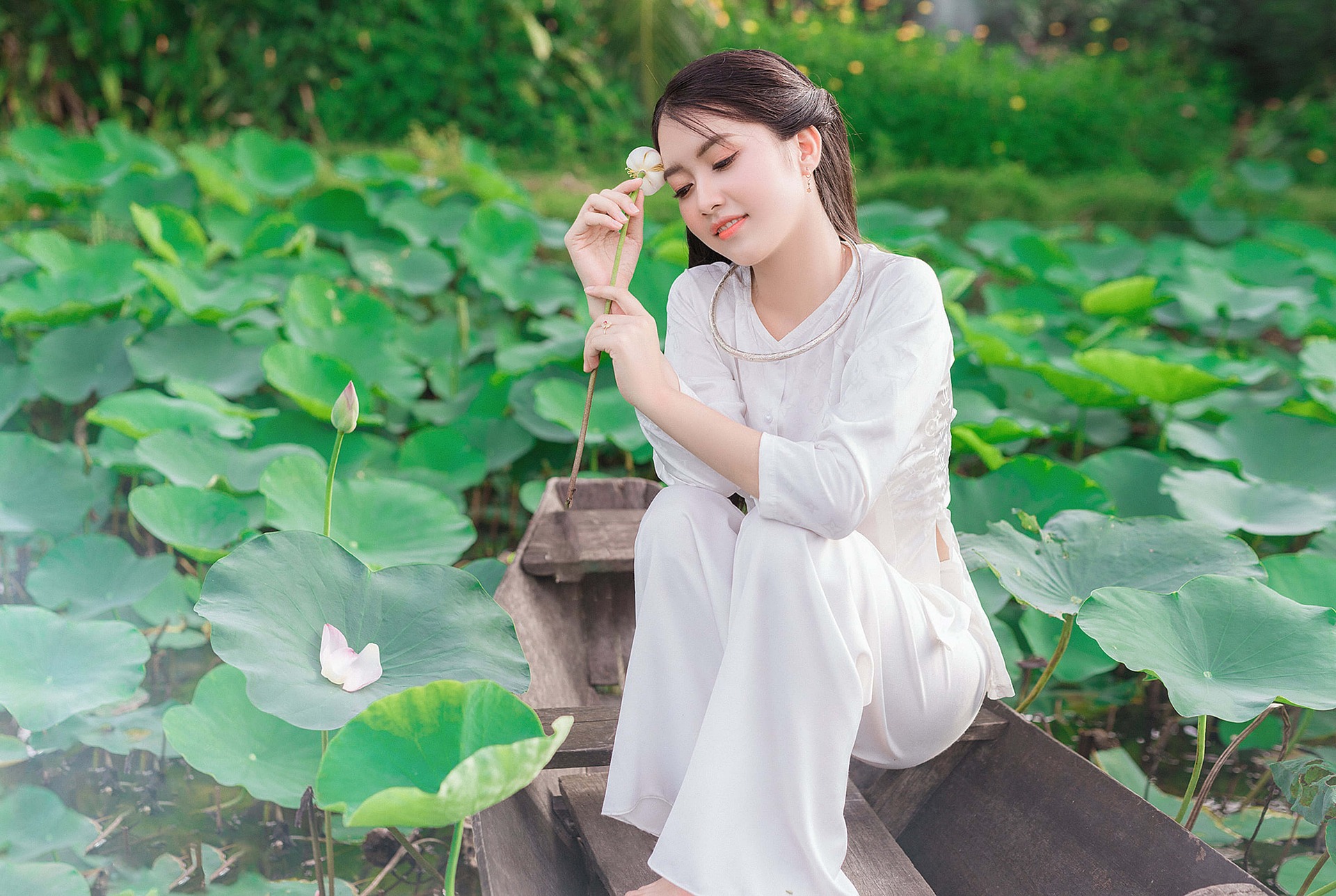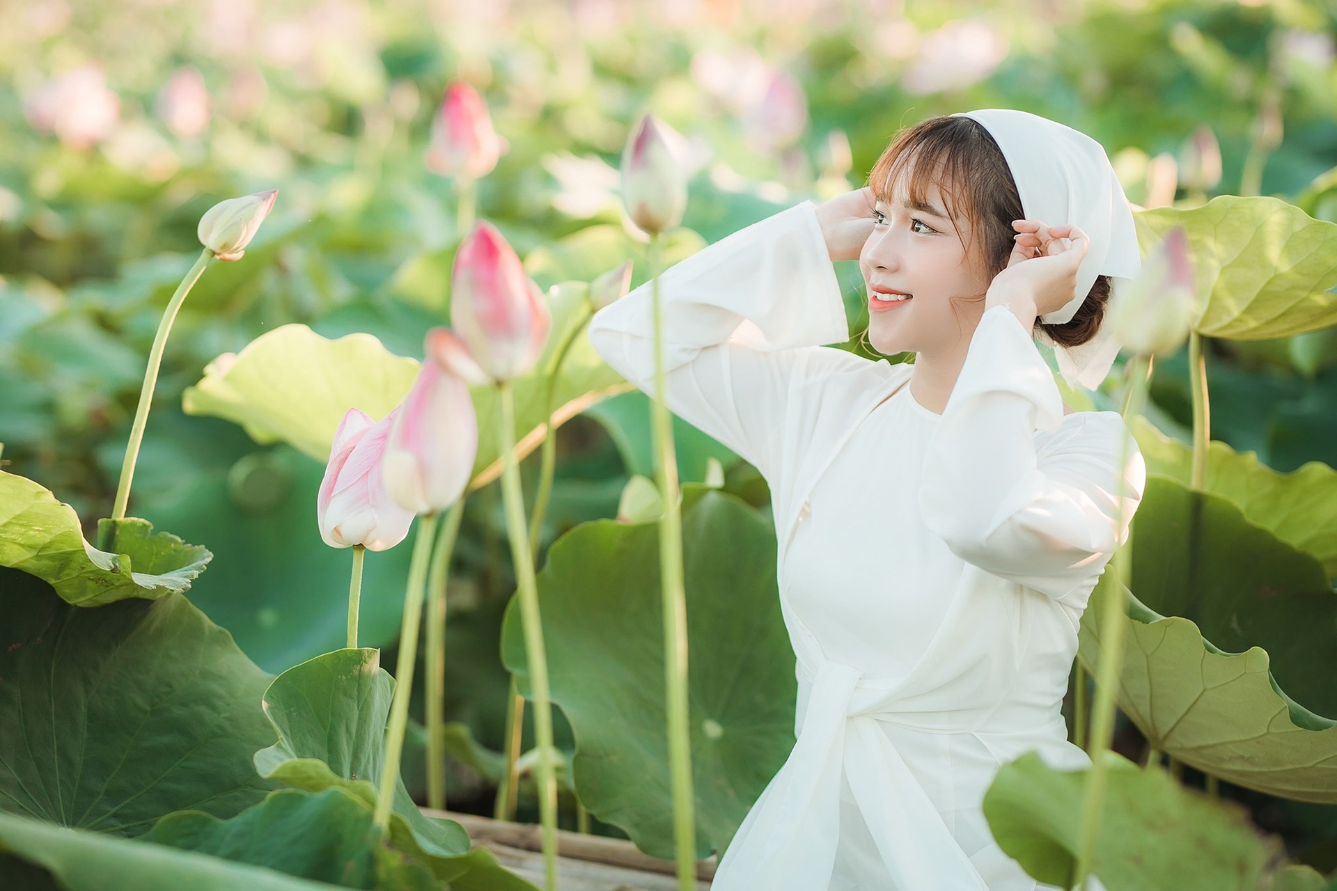有的轻嗅荷香,指尖抚过花瓣;有的端坐船头,任由荷风拂过裙角;有的把荷叶当成小伞,在绿意里扬起温柔的眉眼。白裙与粉荷相映,绿波与光影交织,没有浓烈的色彩,却满是清透又治愈的氛围感。