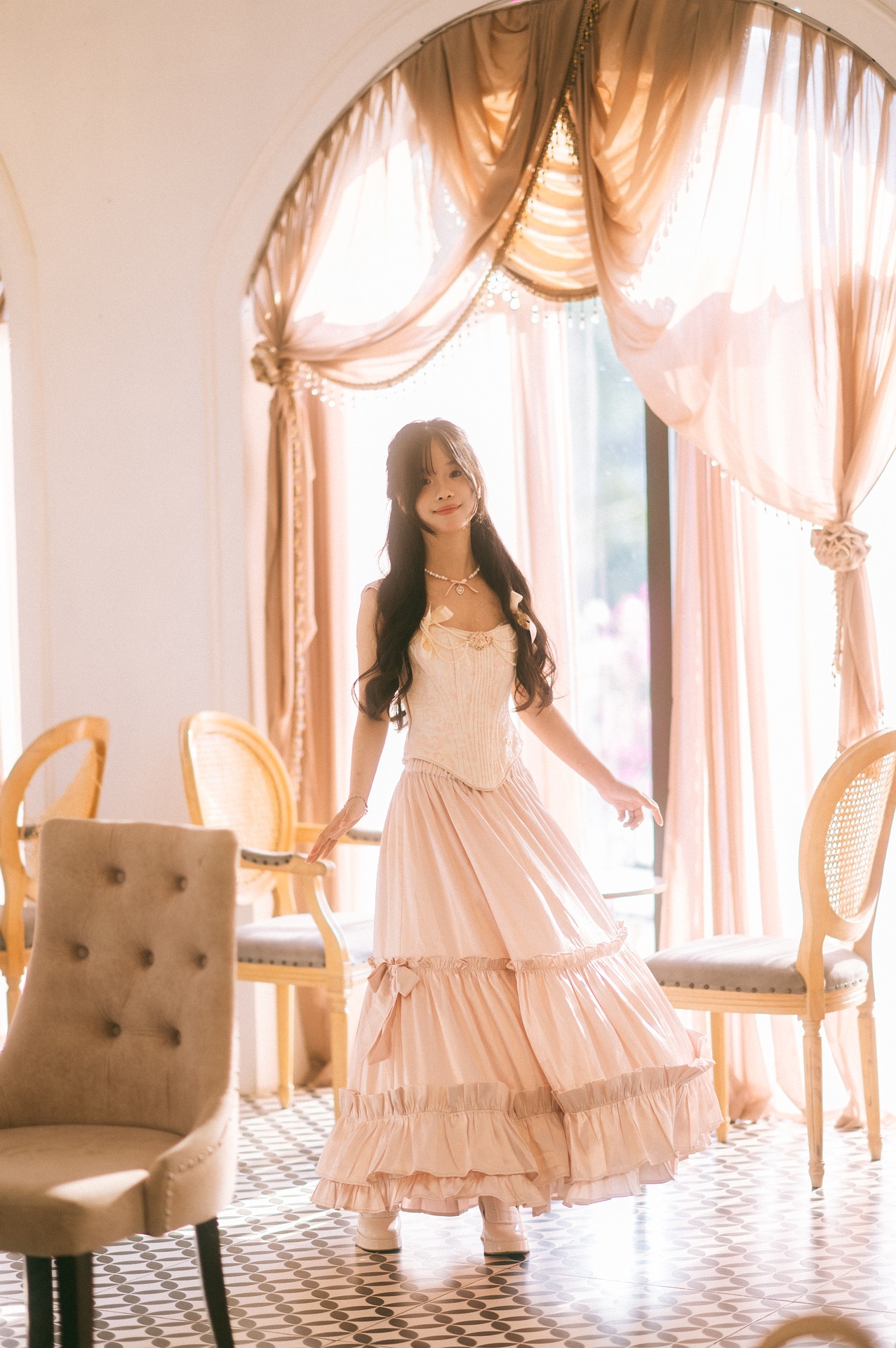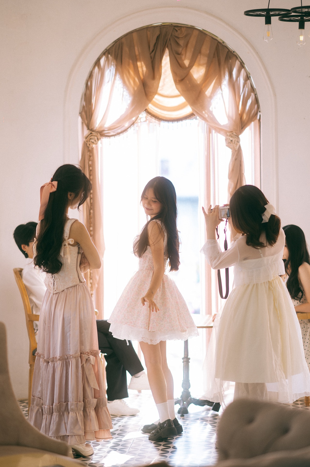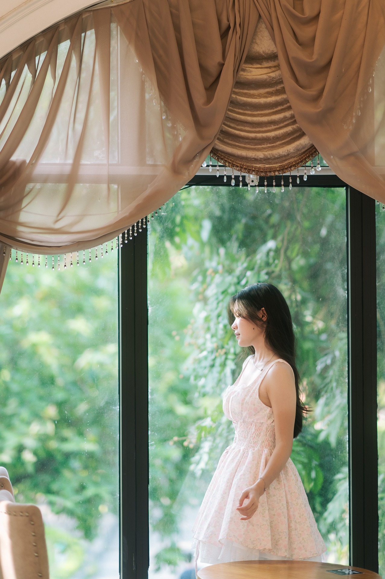 窗外是满目的绿意,窗内是一室的温柔,暖棕色的纱帘垂落,像为这份美好拉上了一层朦胧的幕布。光影在她的发丝上跳跃,连脸颊的小痣都成了恰到好处的点缀,每一个眼神、每一个动作,都像从童话里走出来的温柔片段。