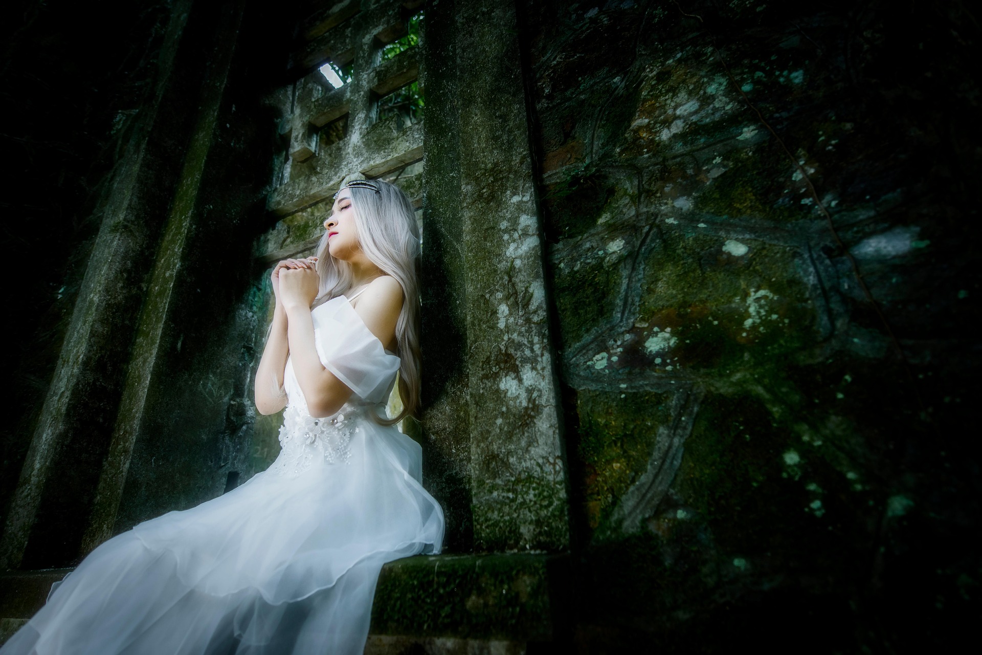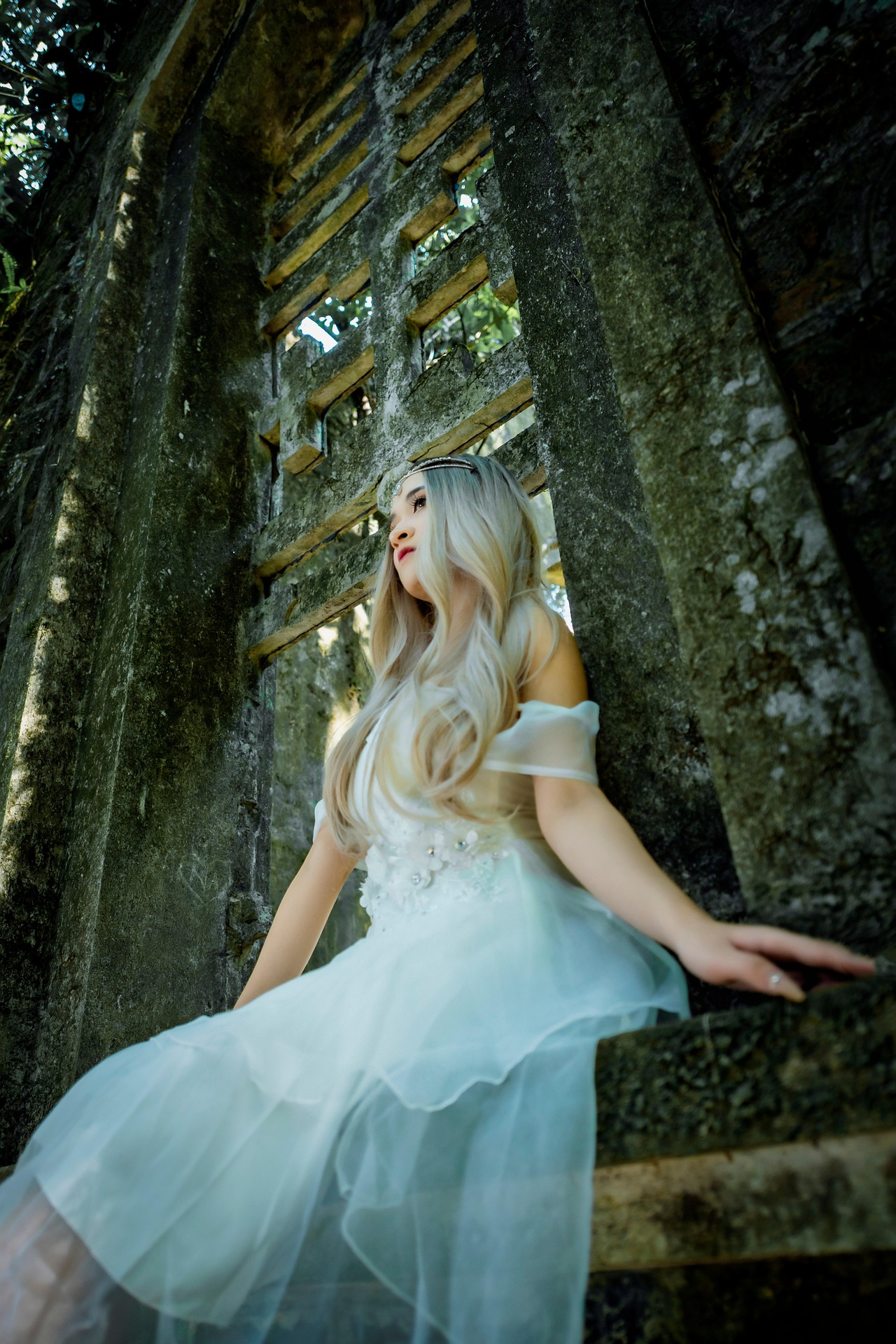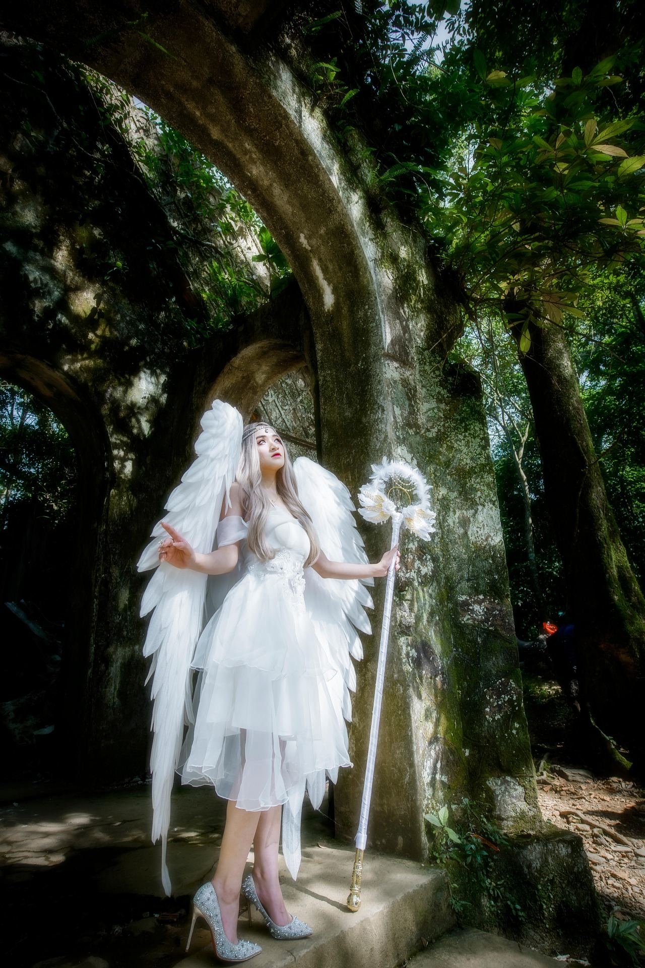 古老的石拱爬满青苔,森林的绿意从缝隙里漫进来,阳光穿过枝叶,在斑驳的石墙上洒下细碎的光斑。她穿着蓬松的白纱裙,身后展开巨大的白色羽翼,像从圣光里走出来的天使,降落在这片被遗忘的秘境里。