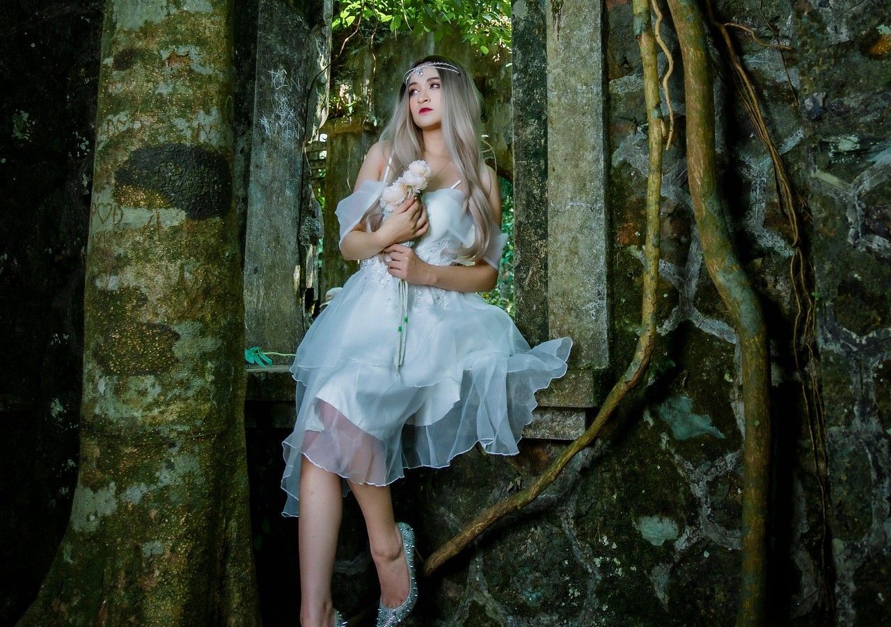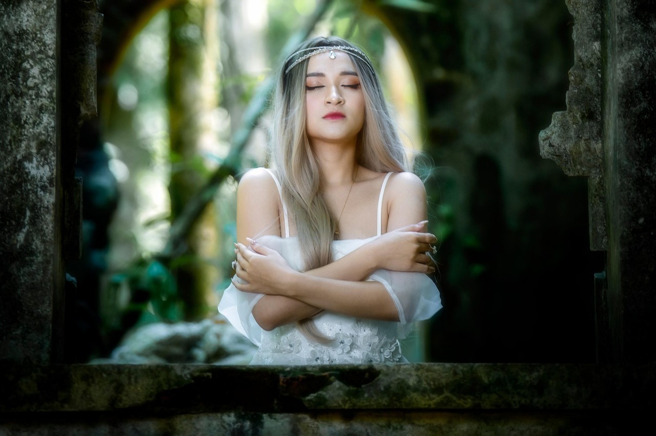 她闭眼轻拥自己,神情平静又带着几分疏离;她手持权杖站在拱门下,羽翼在光影里泛着柔光;她屈膝坐在石阶上,垂眸的瞬间,连风都放慢了脚步。白纱与白羽在斑驳的光影里轻扬,石缝里的绿意与纯白的裙摆碰撞,生出一种破碎又神圣的美感。图片来源:pixabay