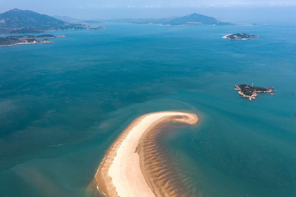海浪与潮汐日积月累堆积沙土,延伸出狭长独特的海岸沙坝。福建泉州塘东村如意沙堤,绵长洁白,如长剑探入深海,造型独特,风光绝美;平潭网红潮汐沙坝随潮涨潮落变幻,退潮时沙洲横贯海面,分割两片海域,一边浪涛翻涌,一边海面平静,形成反差满满的神奇海景。