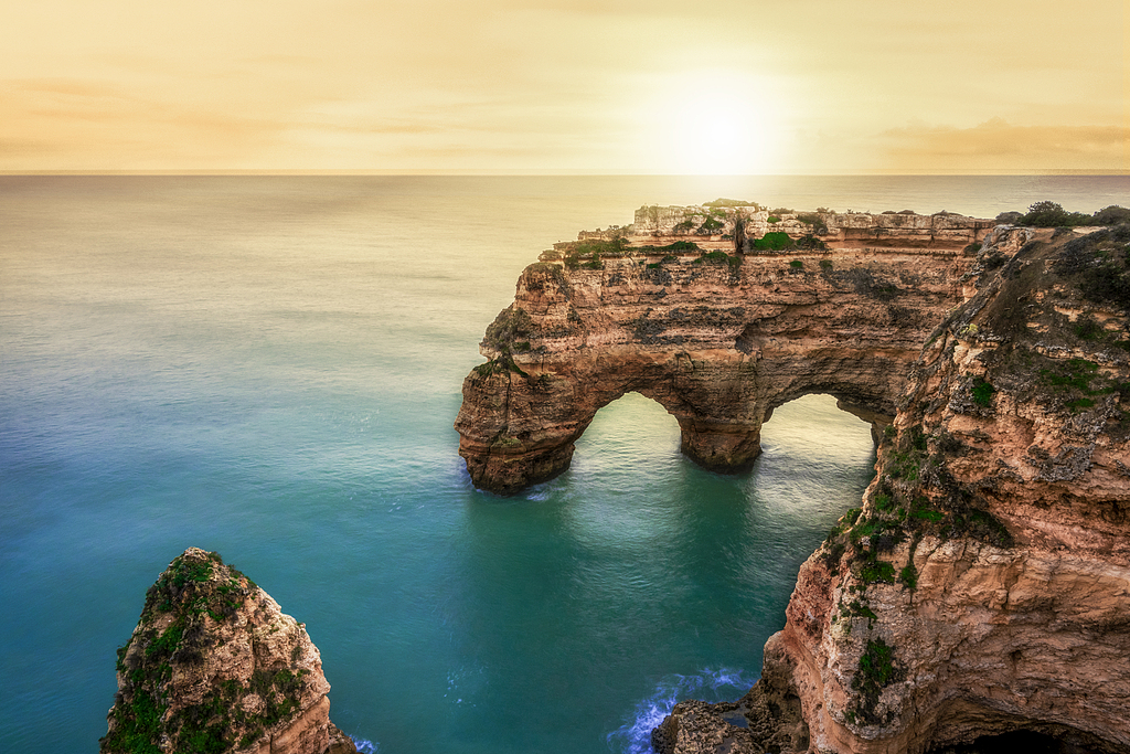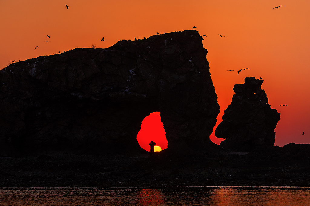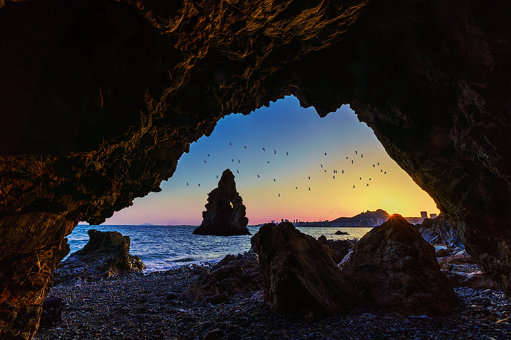 坐落于基岩海岸的海蚀拱,是极为珍稀的海岸景观。岬角两侧长期被海浪冲击侵蚀,天然形成幽深海蚀洞,日久天长,两侧岩洞相互贯通,化作凌空跨海的天然石拱,也被称作海穹。深圳东涌海蚀拱清灵秀美,大连观象岛海蚀拱形似巨象饮水,象形又生动,海风穿拱而过,山海相映,氛围感拉满。