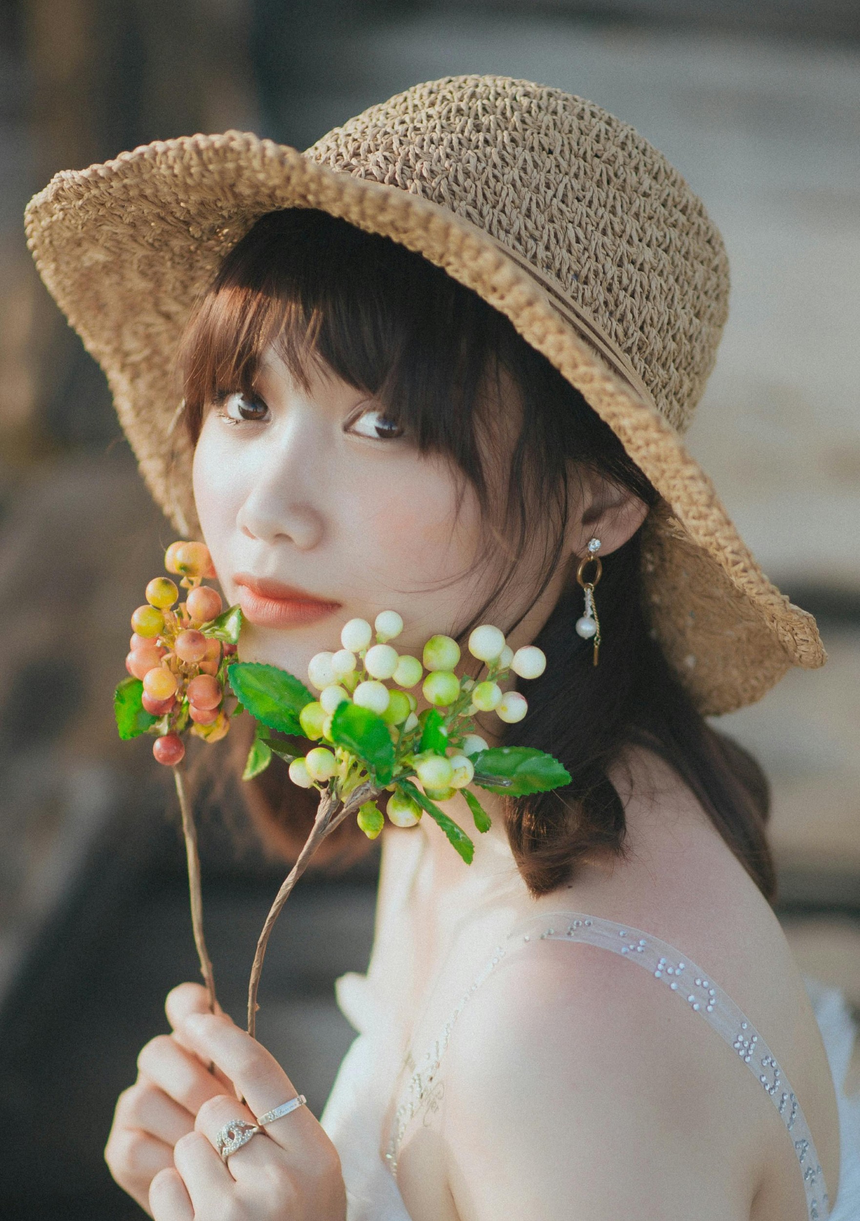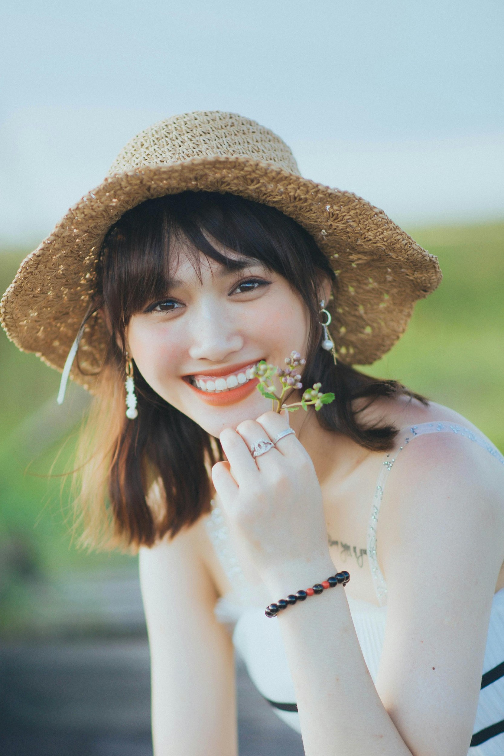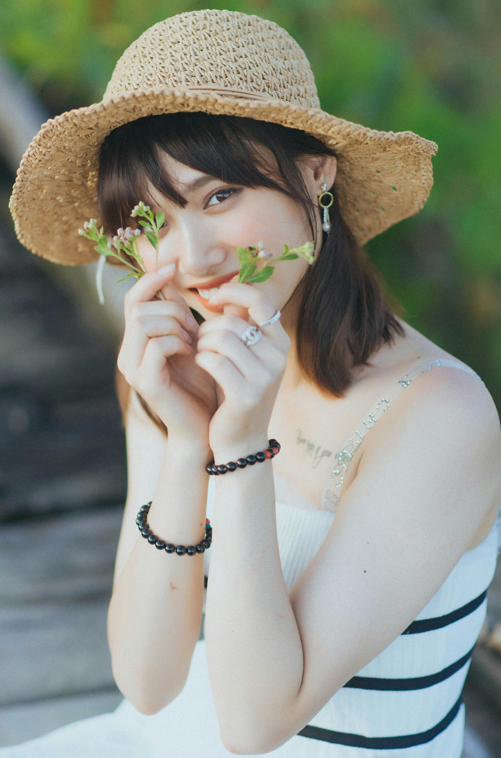 画面里的少女们,戴着不同款式的草帽,穿行在花与绿意之间。有人被三角梅簇拥,笑容比花还灿烂;有人捧着小花,闭眼轻嗅,仿佛把春天捧在了手心。蕾丝、编织、丝带装饰的草帽,搭配浅色系的衣裙,自带法式田园的松弛感,把清新自然的氛围拉满。