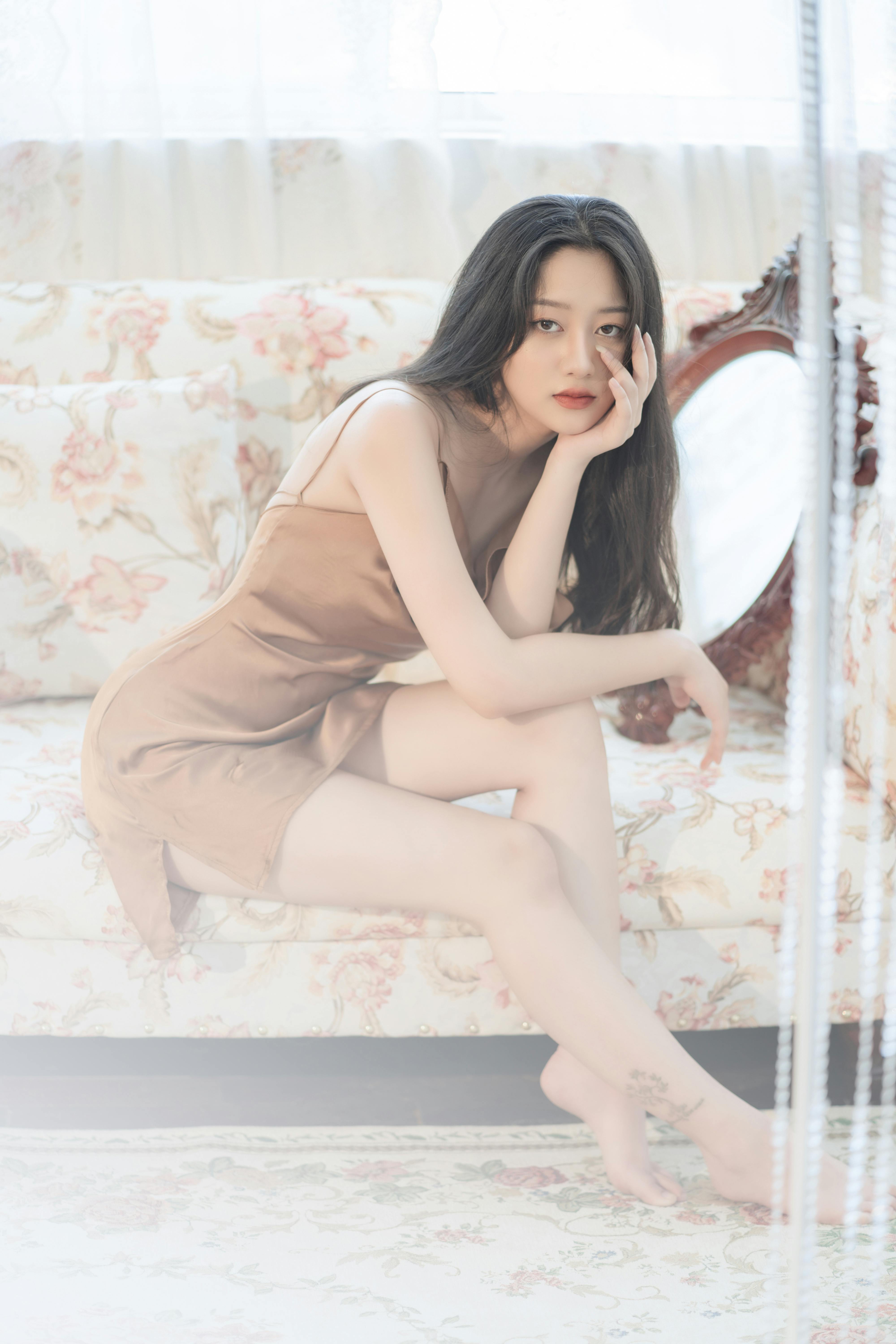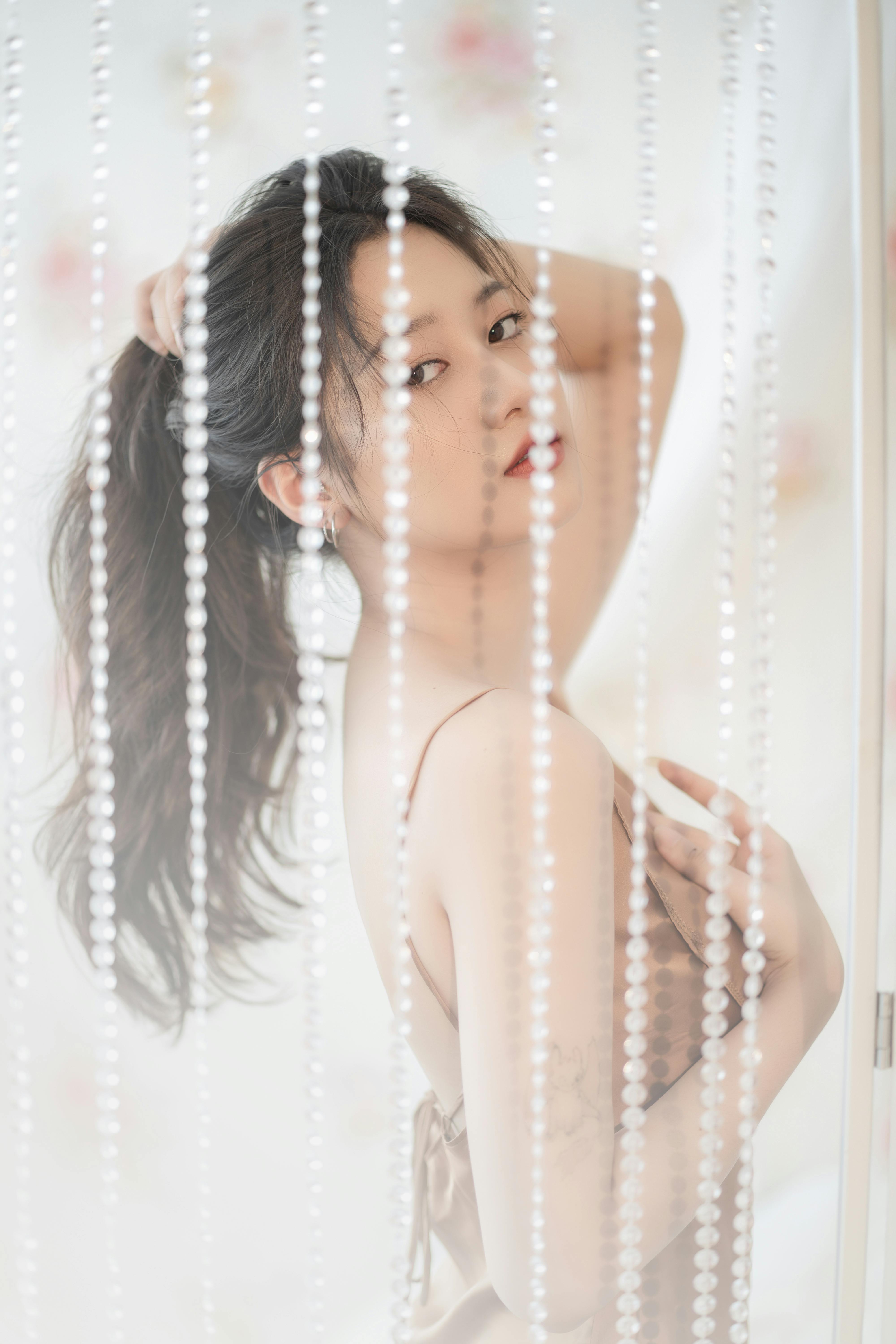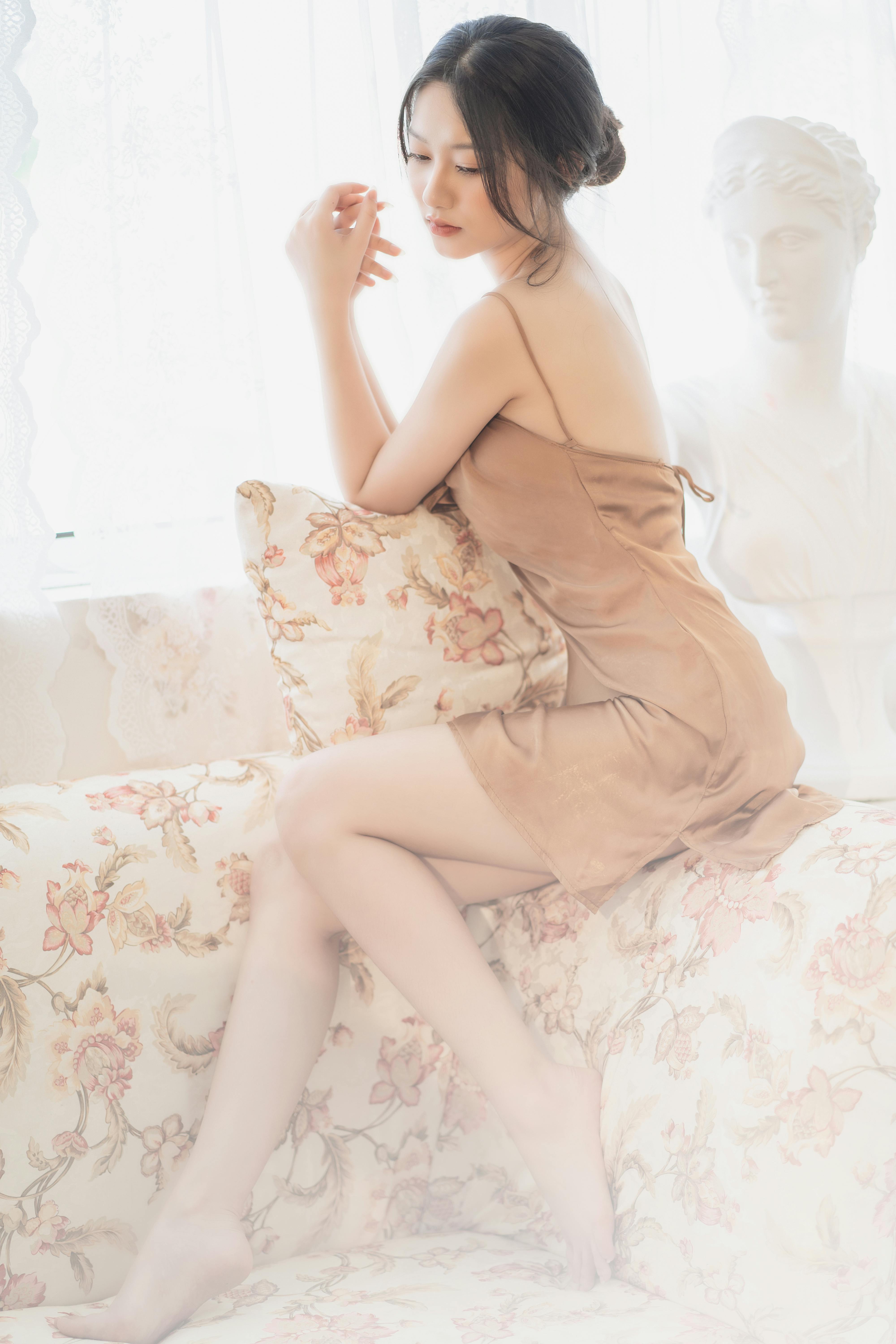少女或蜷在沙发上,发丝被光影镀上金边;或被珠帘半遮半掩,眼神慵懒又迷离;或是手持百合,让花香与温柔一同流淌。丝缎的柔滑与皮肤的细腻在光线下交融,每一个姿态都带着不刻意的松弛感,把午后的慵懒与温柔,都定格成了永恒的瞬间。