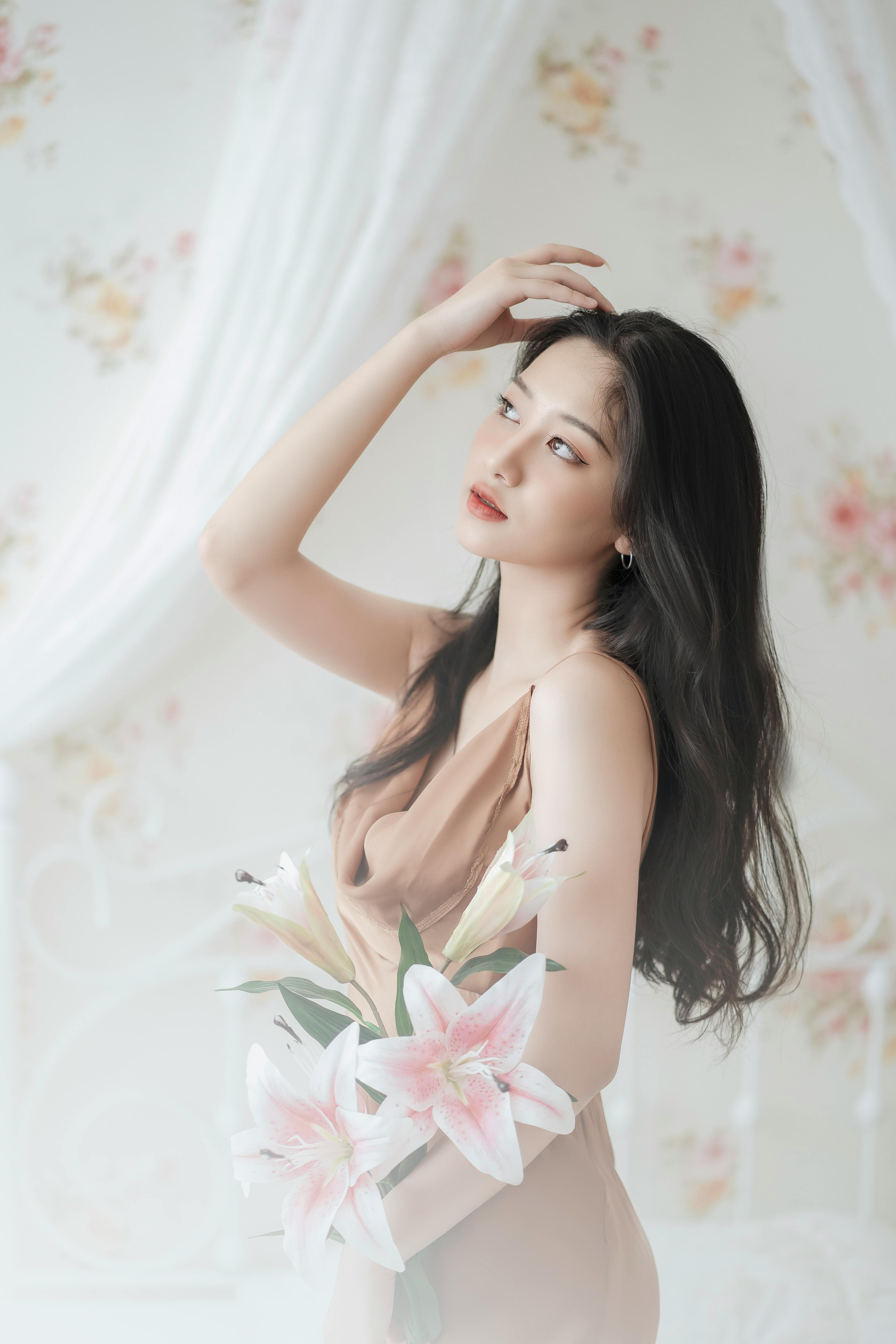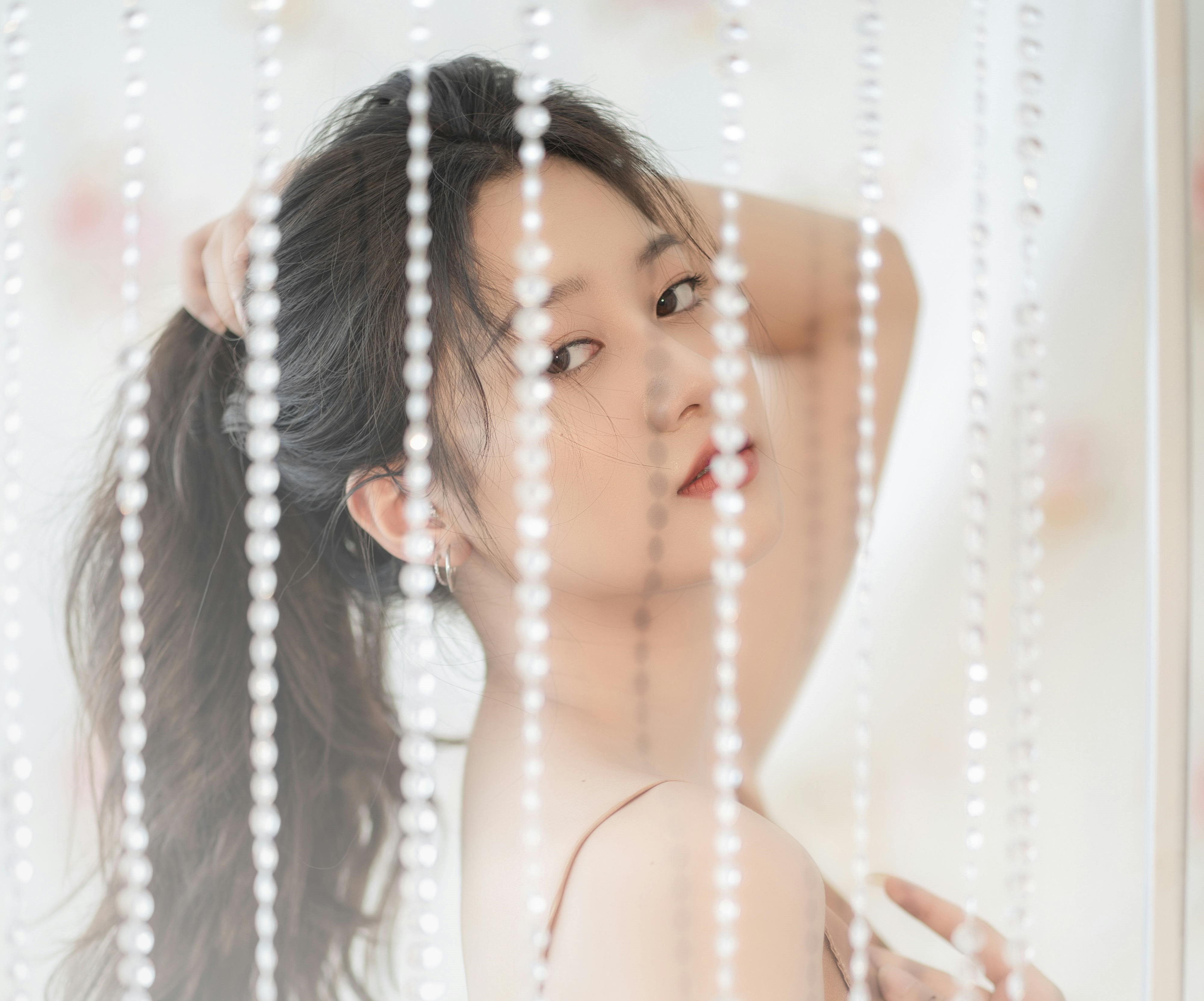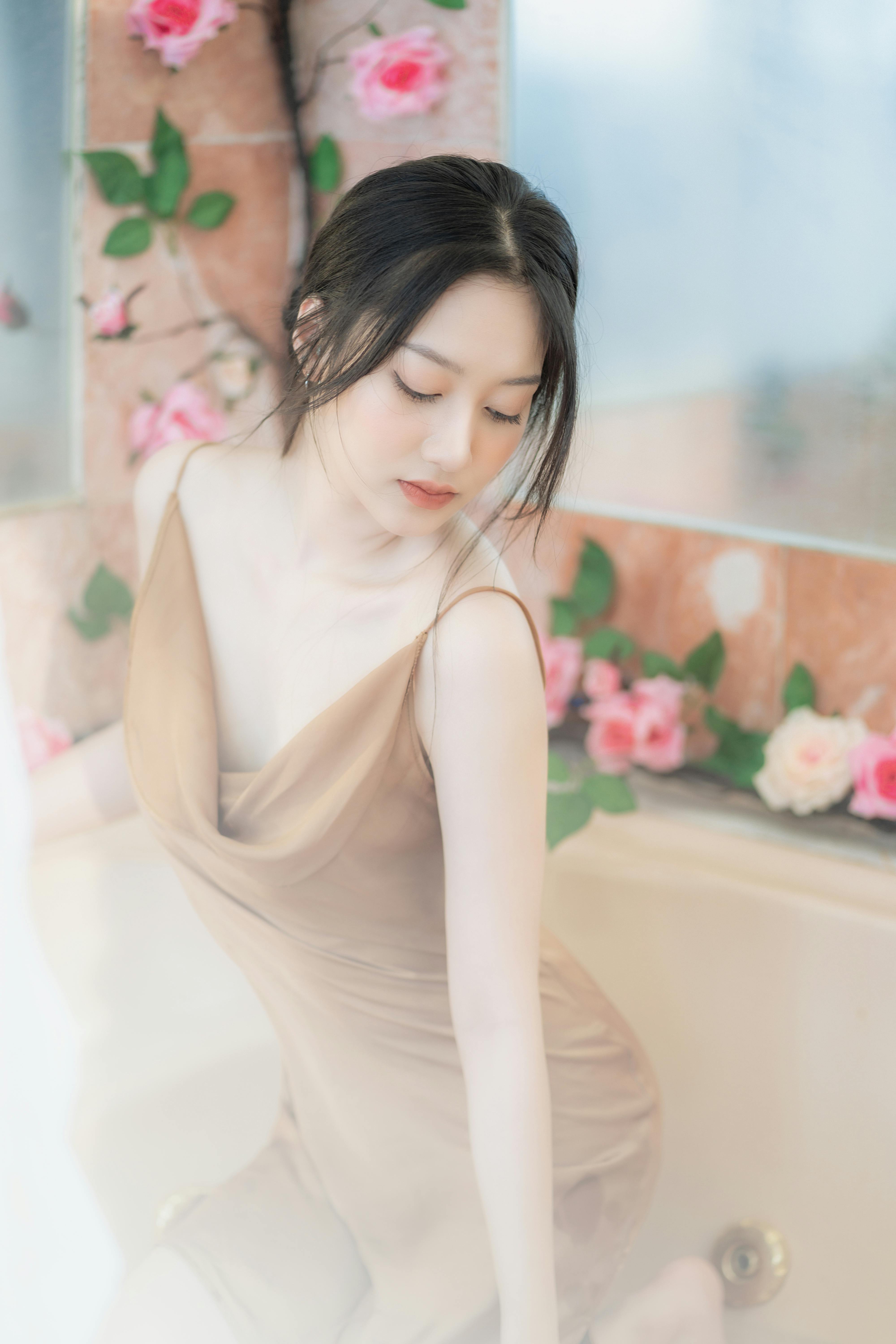 少女或蜷在沙发上,发丝被光影镀上金边;或被珠帘半遮半掩,眼神慵懒又迷离;或是手持百合,让花香与温柔一同流淌。丝缎的柔滑与皮肤的细腻在光线下交融,每一个姿态都带着不刻意的松弛感,把午后的慵懒与温柔,都定格成了永恒的瞬间。