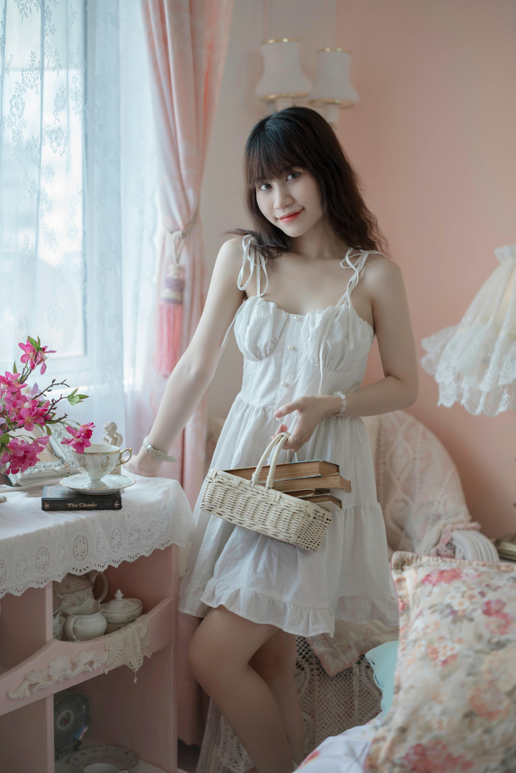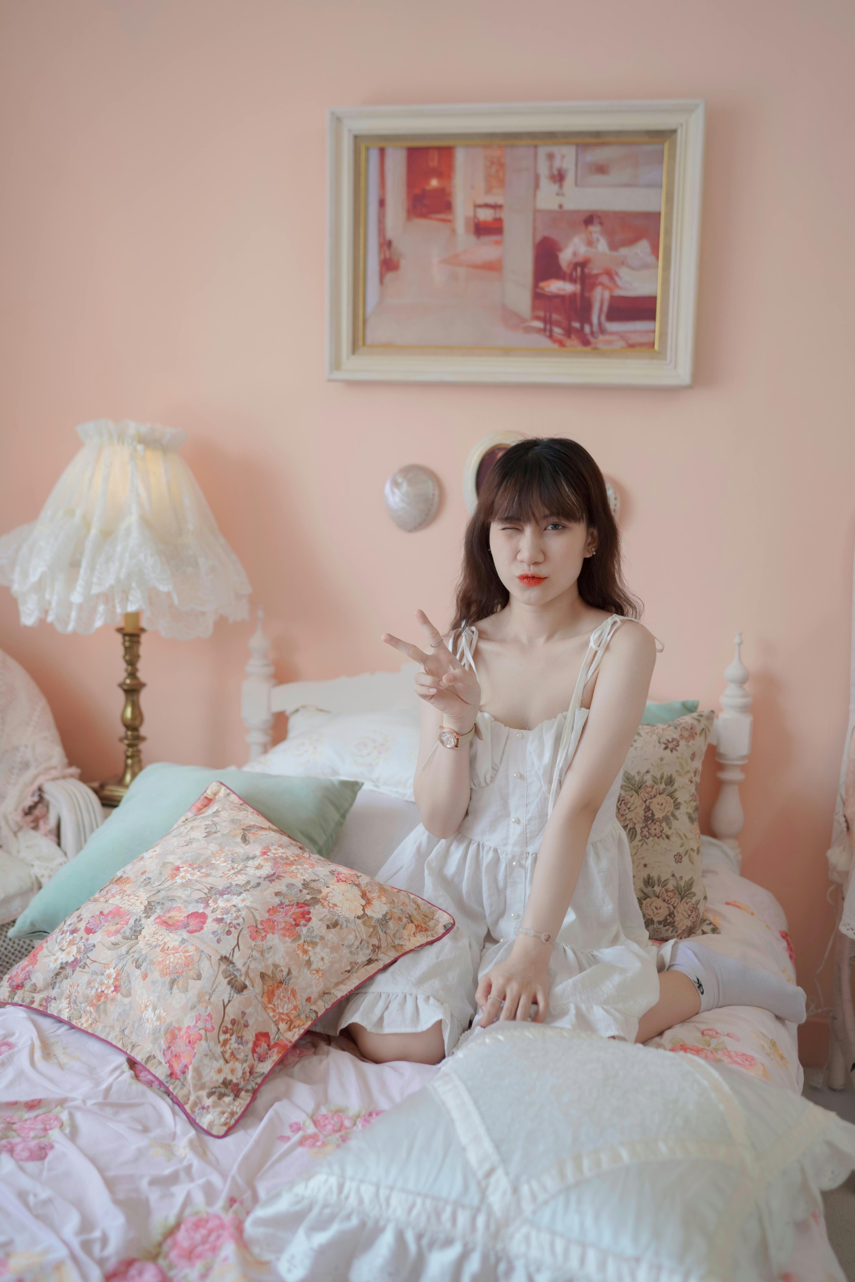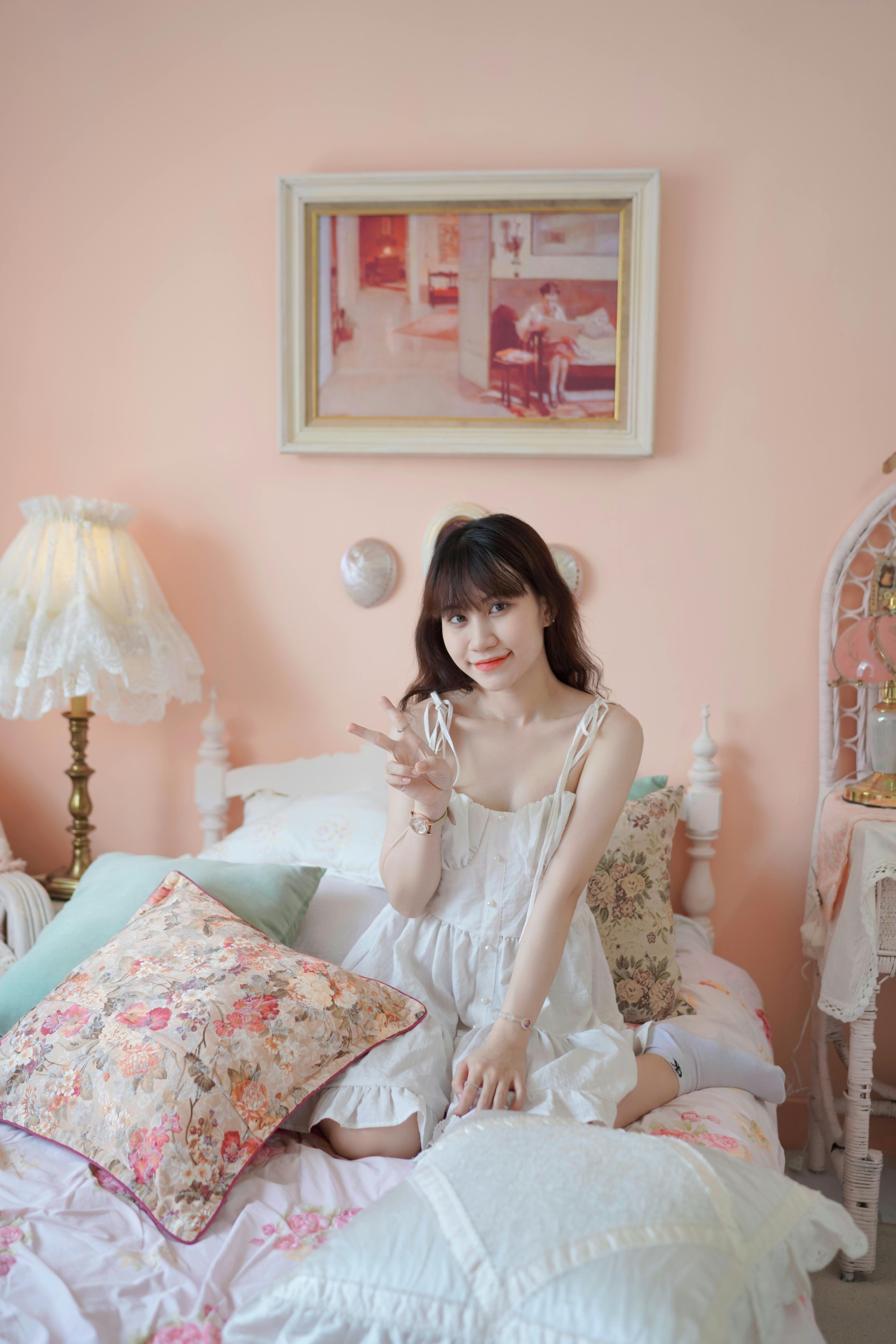 白色吊带裙带着褶皱与蕾丝细节,麻花辫上的小发饰和房间的碎花床品、蕾丝台灯相得益彰,空气里都飘着温柔的气息。她抱着旧书坐在床上,对着镜头比耶、歪头笑,或是趴在枕头上,眼里盛着细碎的光。