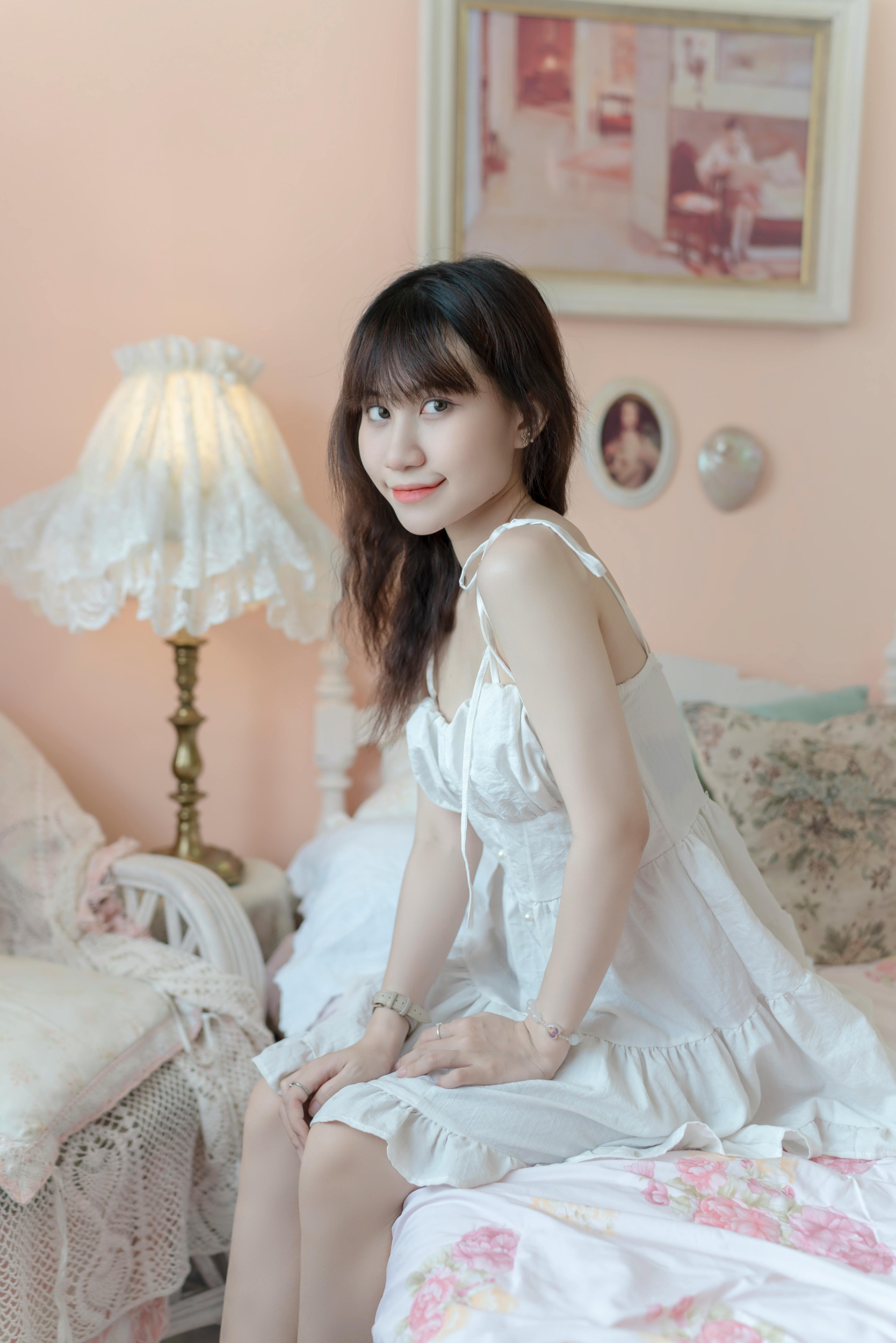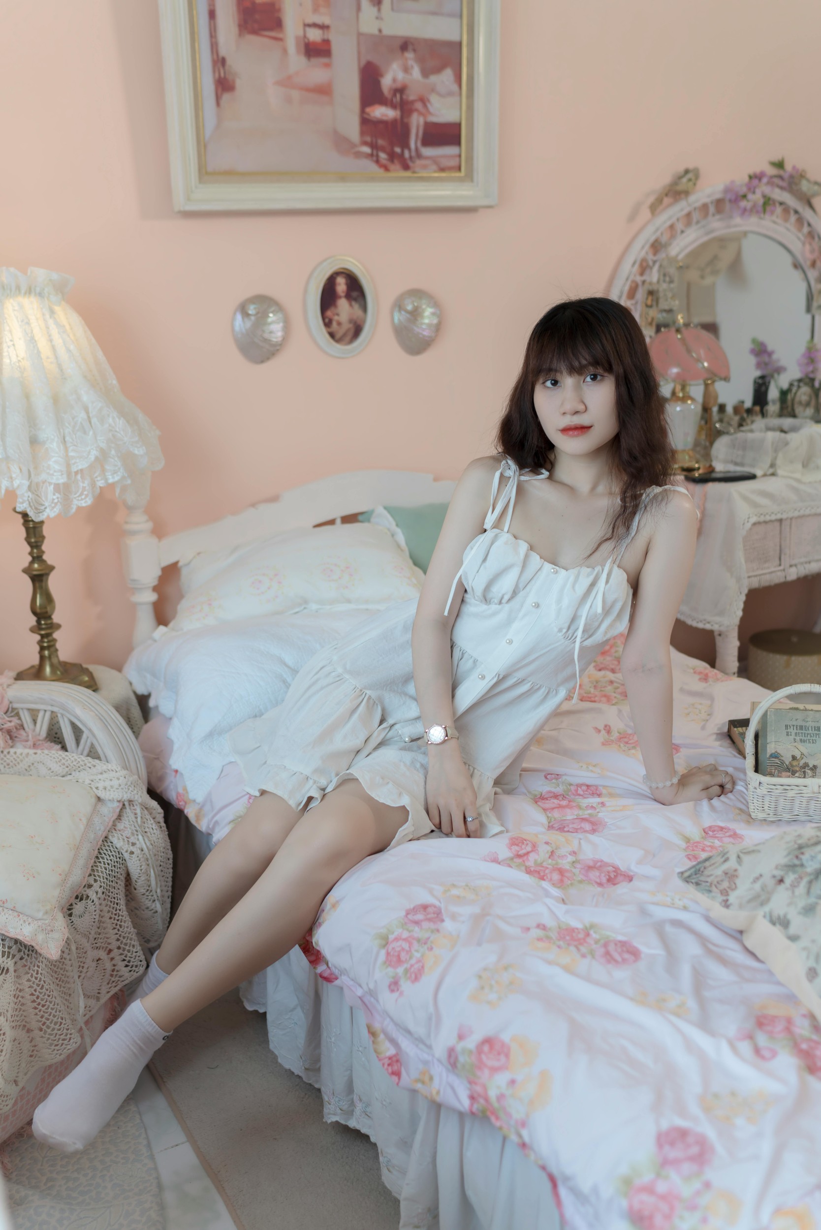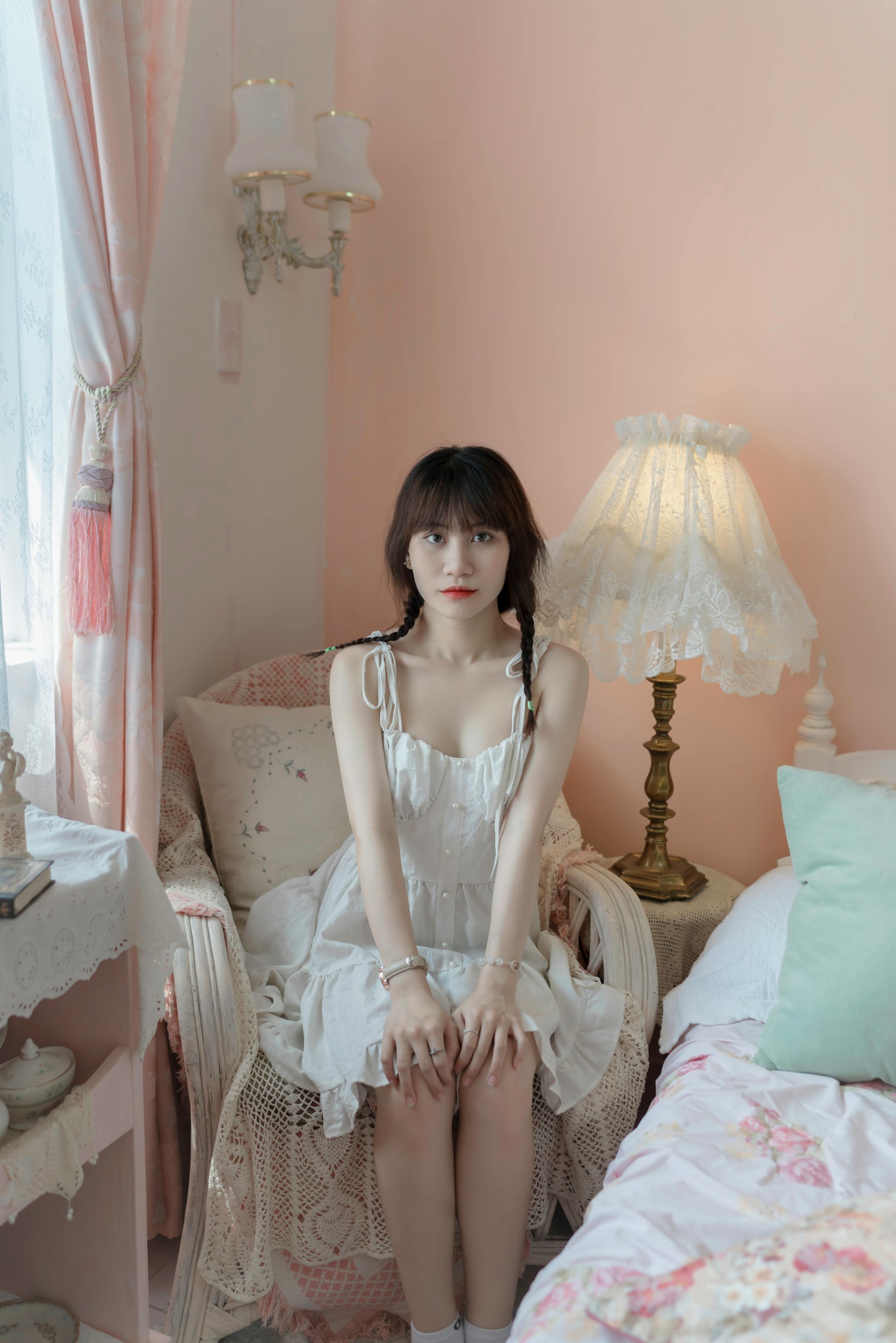 白色吊带裙带着褶皱与蕾丝细节,麻花辫上的小发饰和房间的碎花床品、蕾丝台灯相得益彰,空气里都飘着温柔的气息。她抱着旧书坐在床上,对着镜头比耶、歪头笑,或是趴在枕头上,眼里盛着细碎的光。