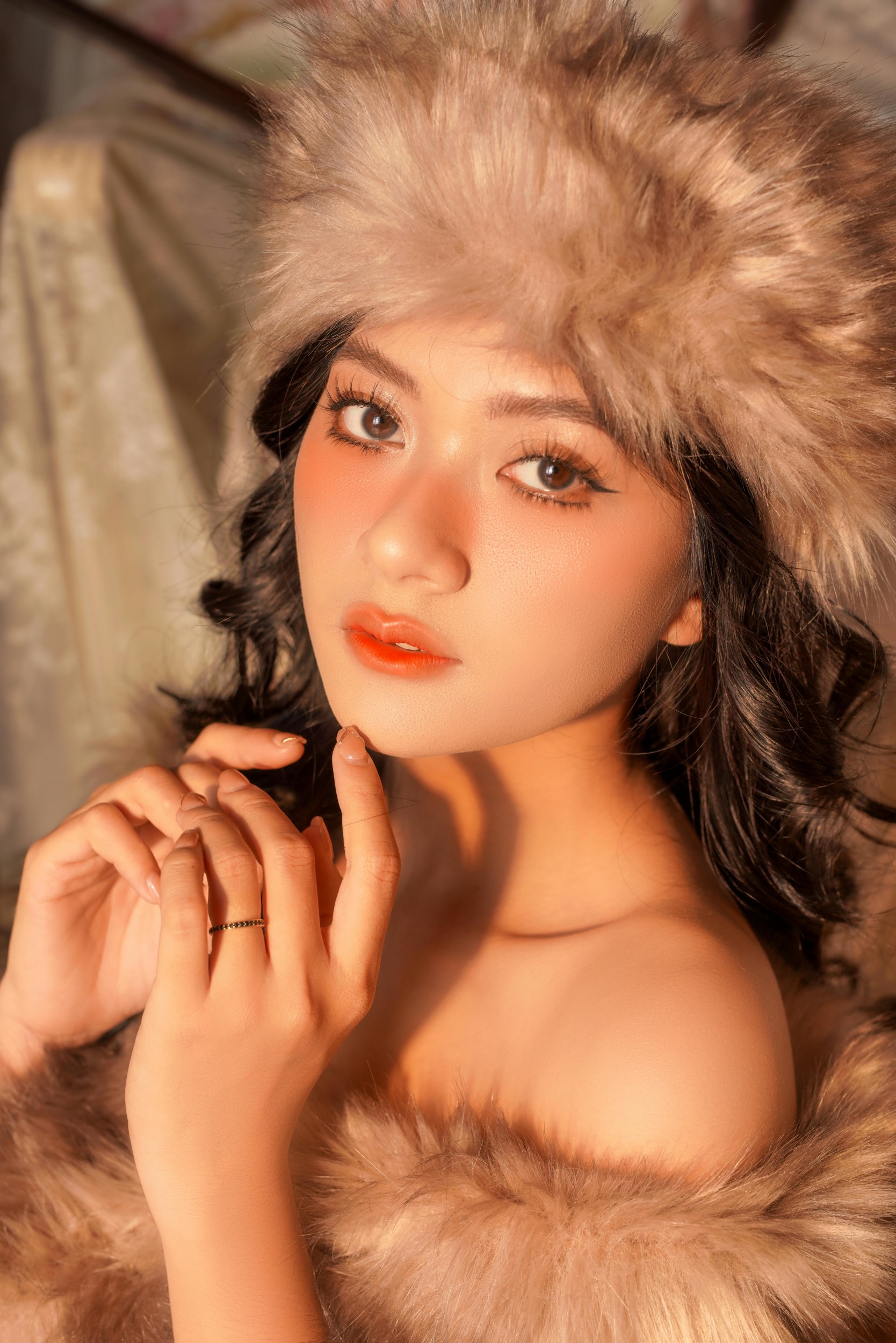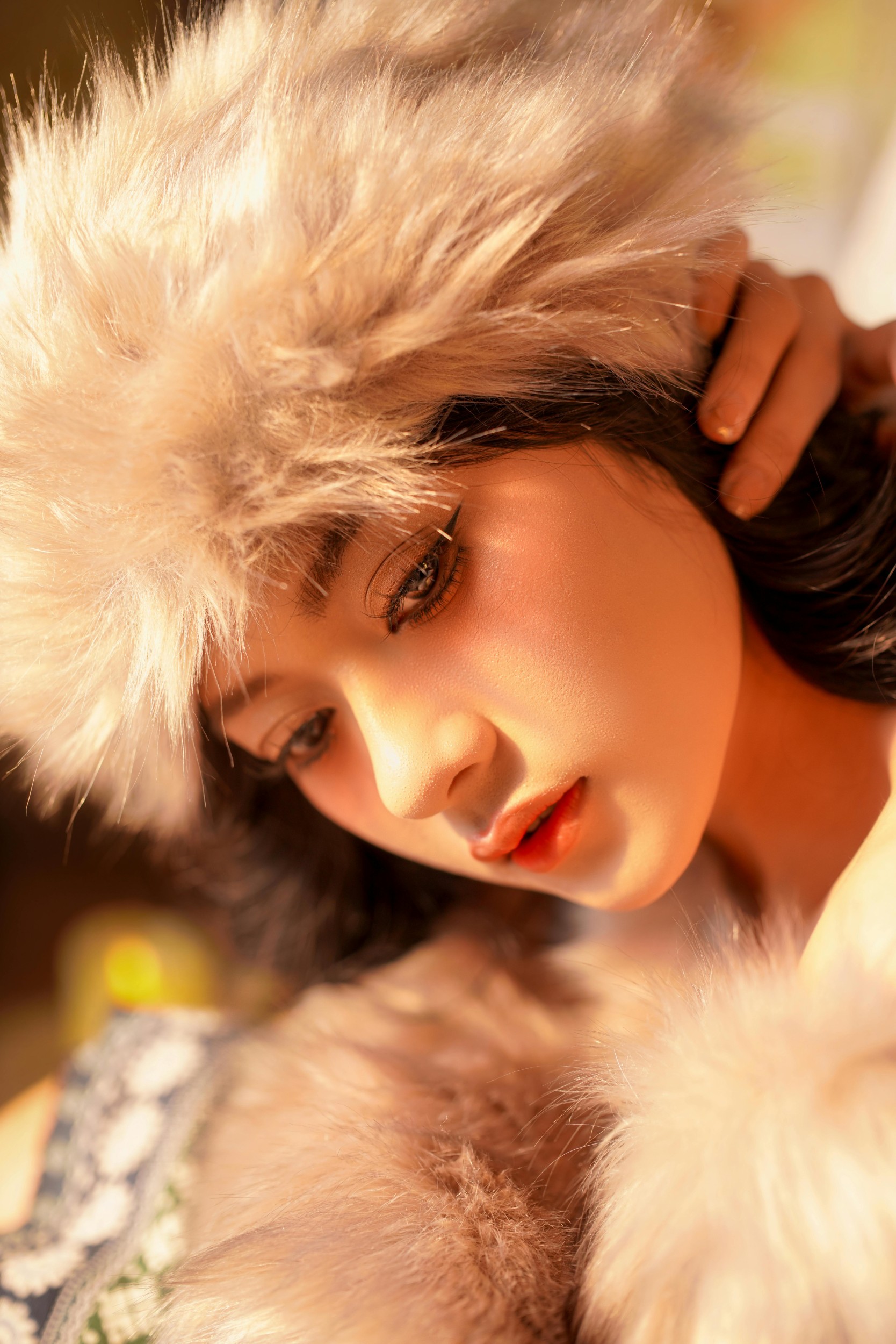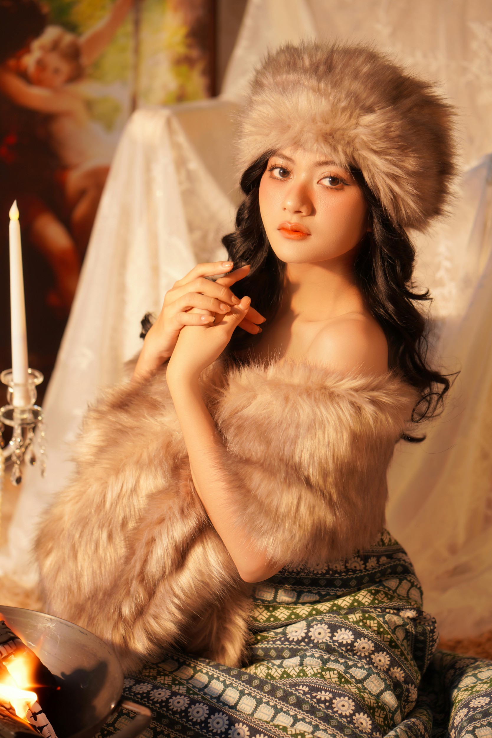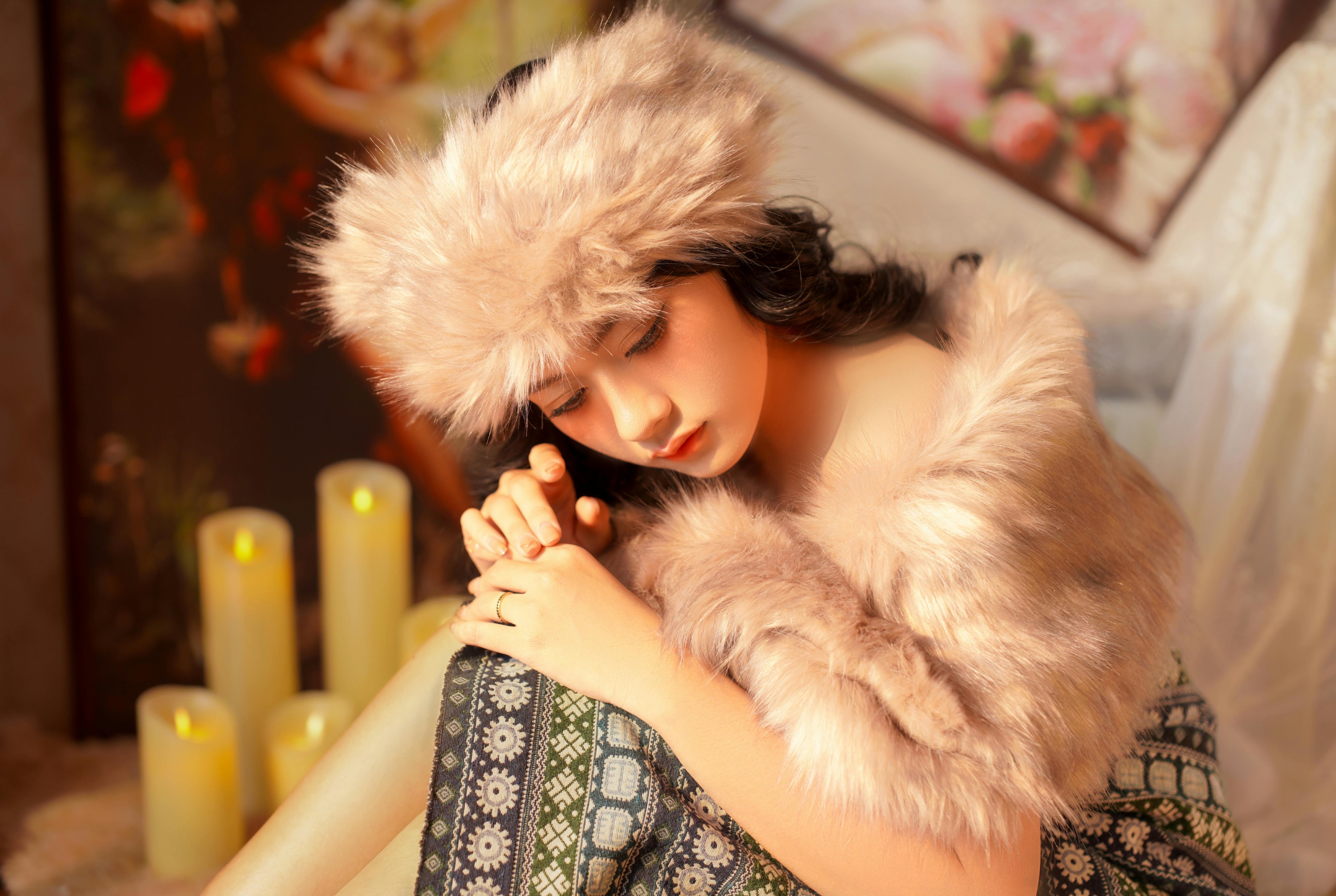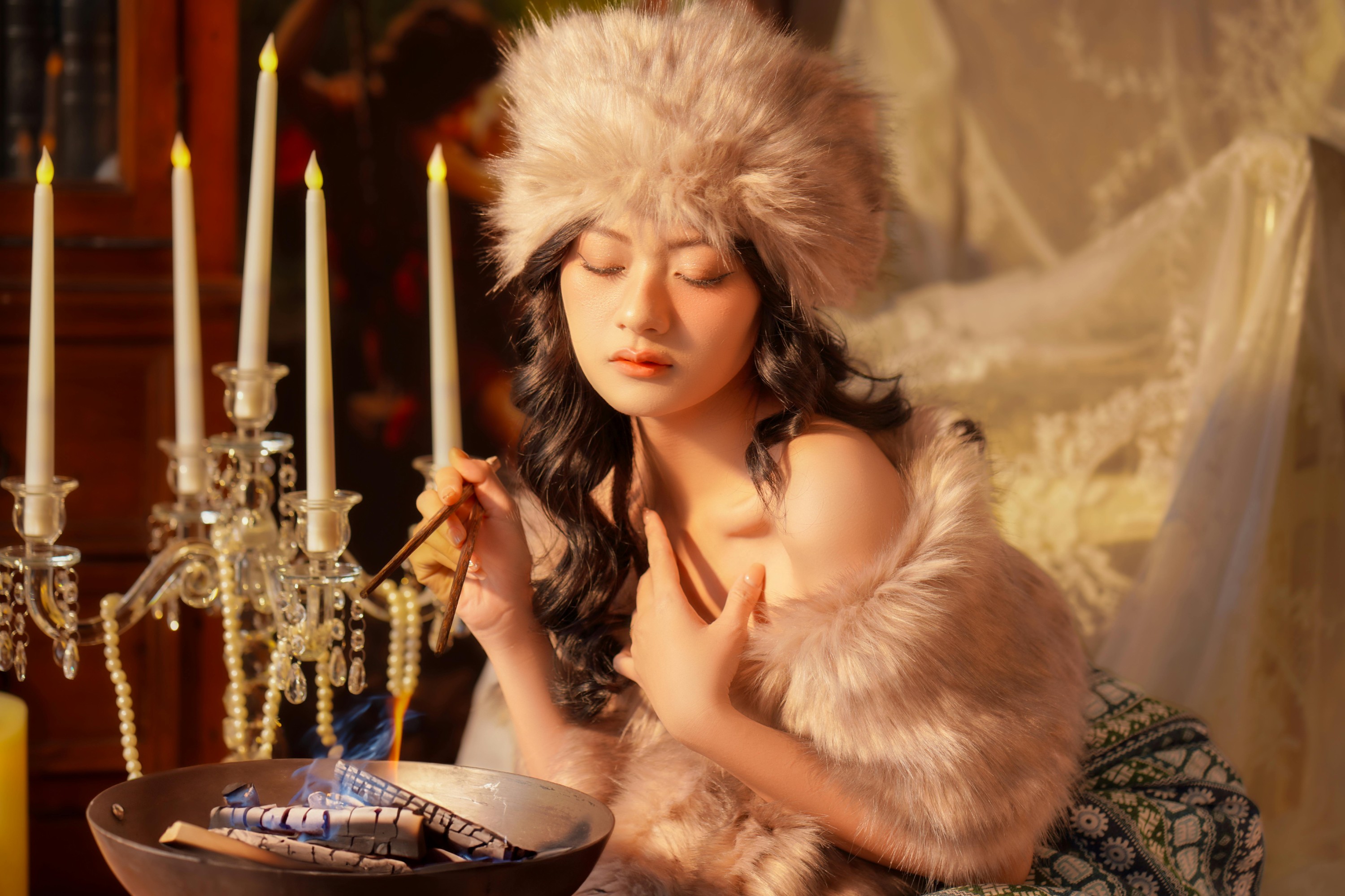蓬松的皮草帽子与披肩自带复古贵气,柔软的毛边在光线下泛着柔和的光泽,搭配民族纹样的长裙,优雅又神秘。她时而垂眸,时而抬眼,指尖轻触烛火,眼神里带着一丝慵懒与疏离,像藏着许多未说出口的故事。