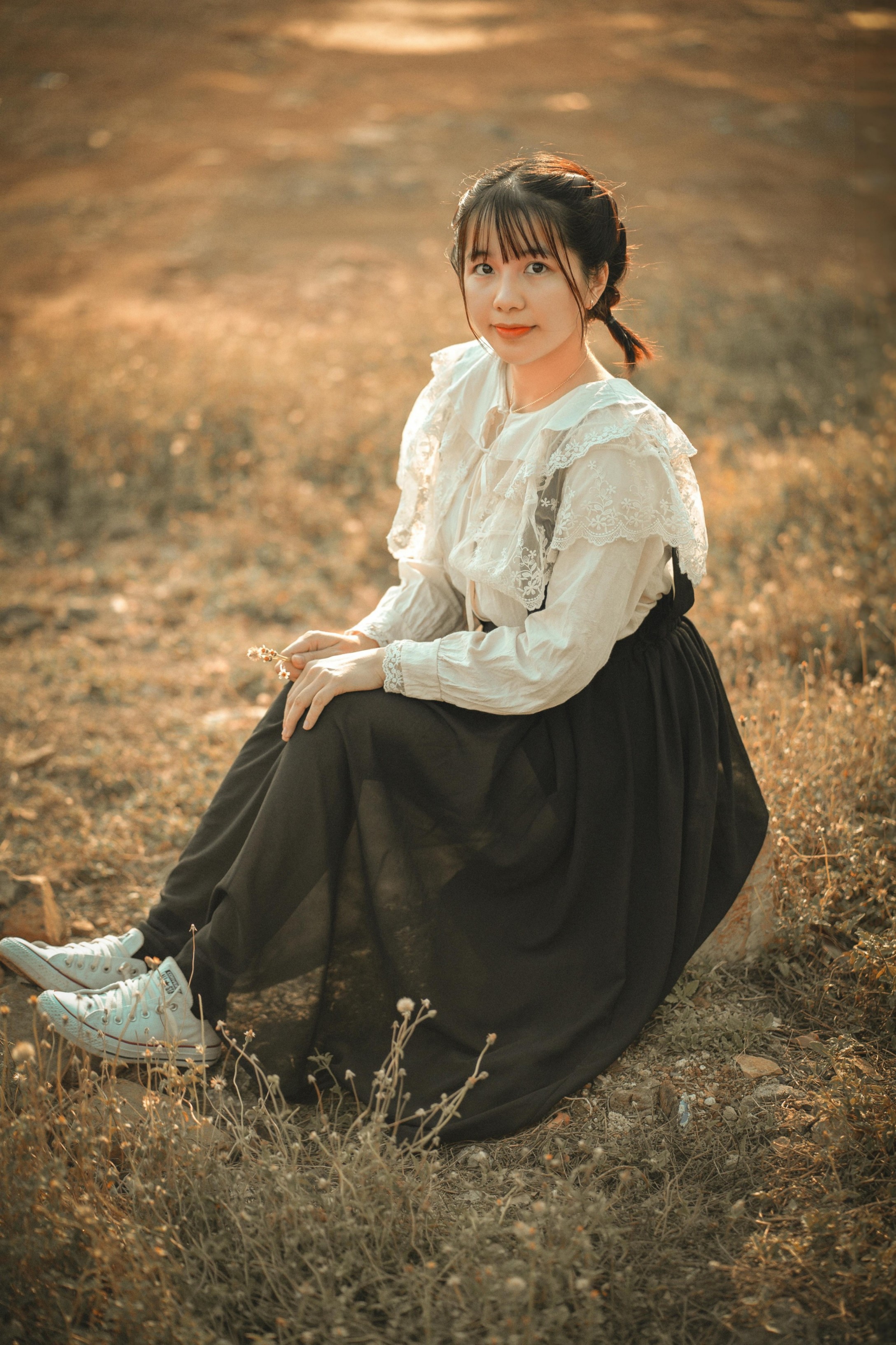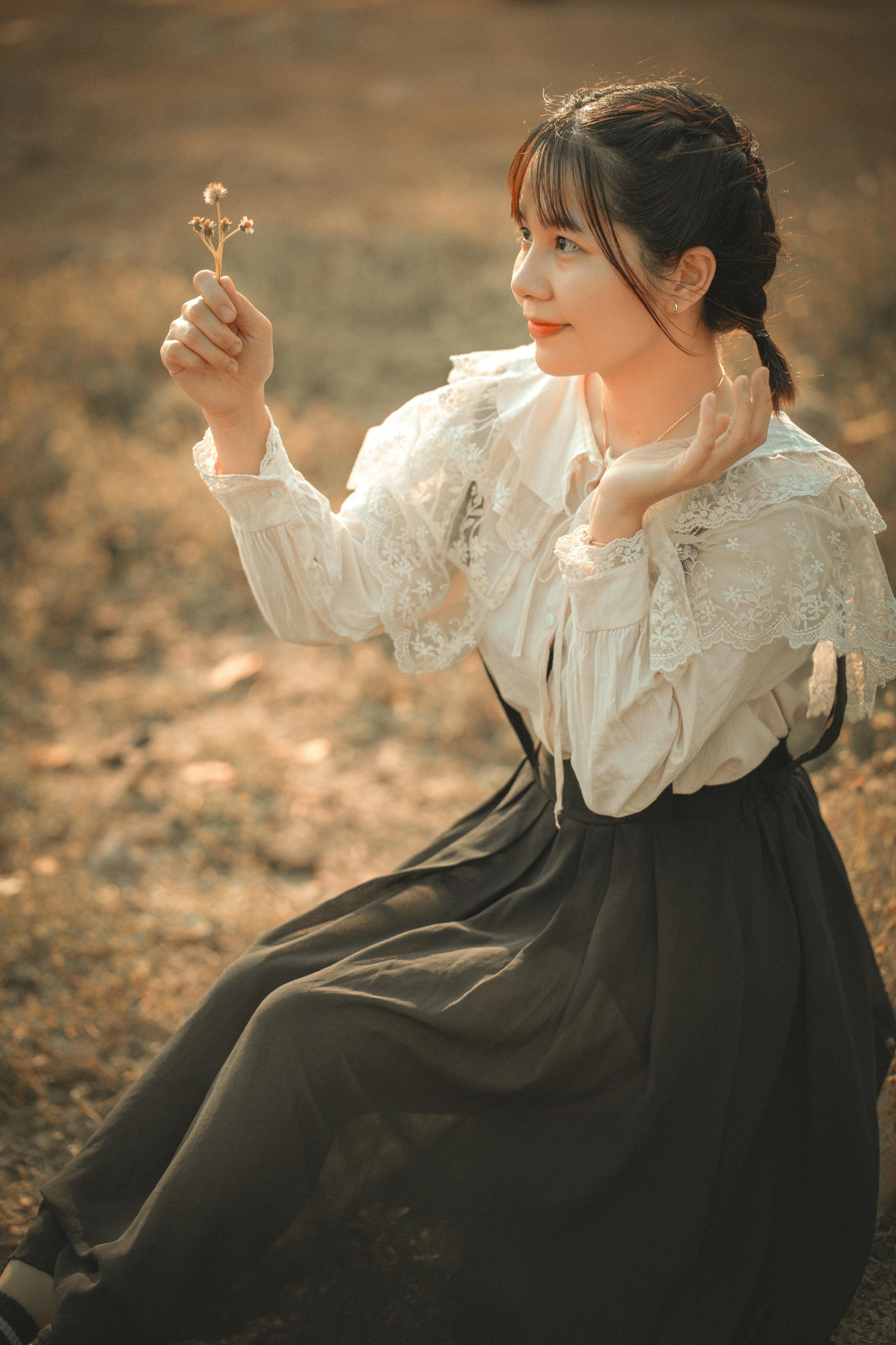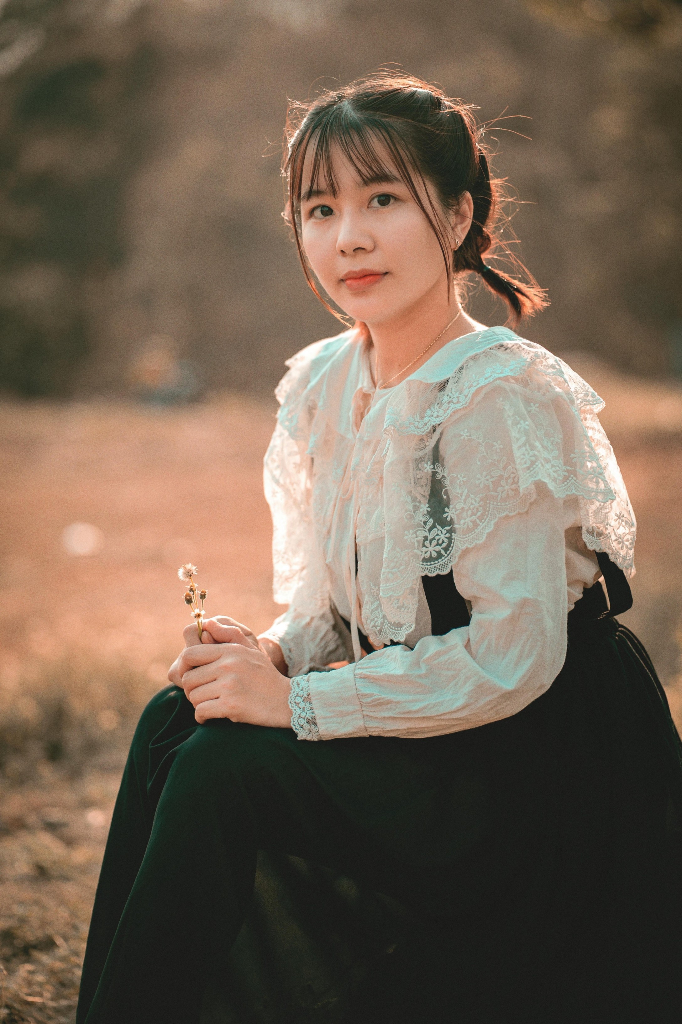 她穿着温柔的森系套装,坐在枯黄的草地上,指尖捏着一朵小小的干花,眼里盛着落日的碎光。垂眸浅笑时,蕾丝的褶皱被光影勾勒得软乎乎的;抬手轻触风的瞬间,连空气都漫着松弛的温柔。暖调的阳光把一切都揉得软软的,把秋日独有的慵懒与清甜,都藏进了每一个不经意的动作里。