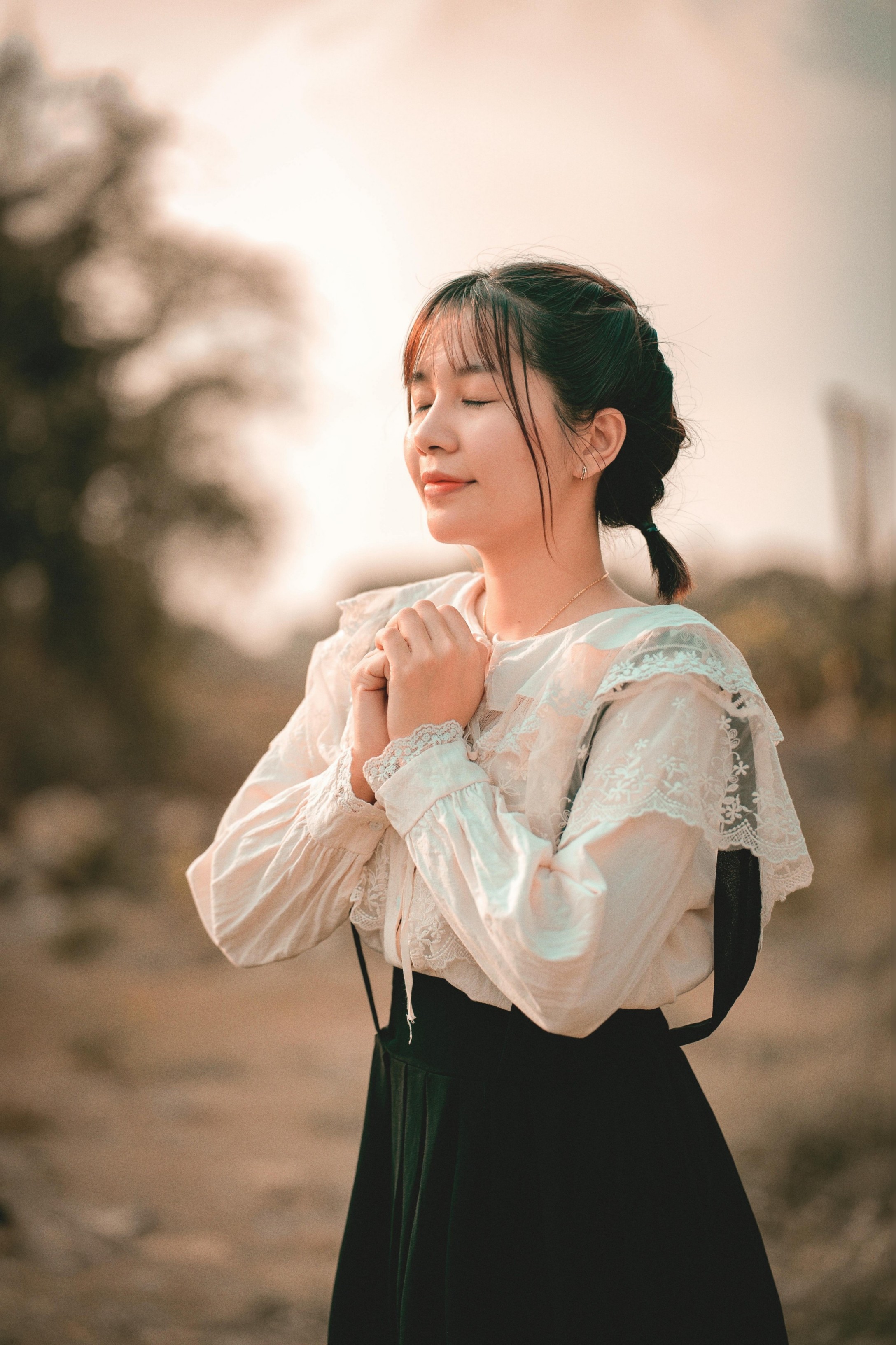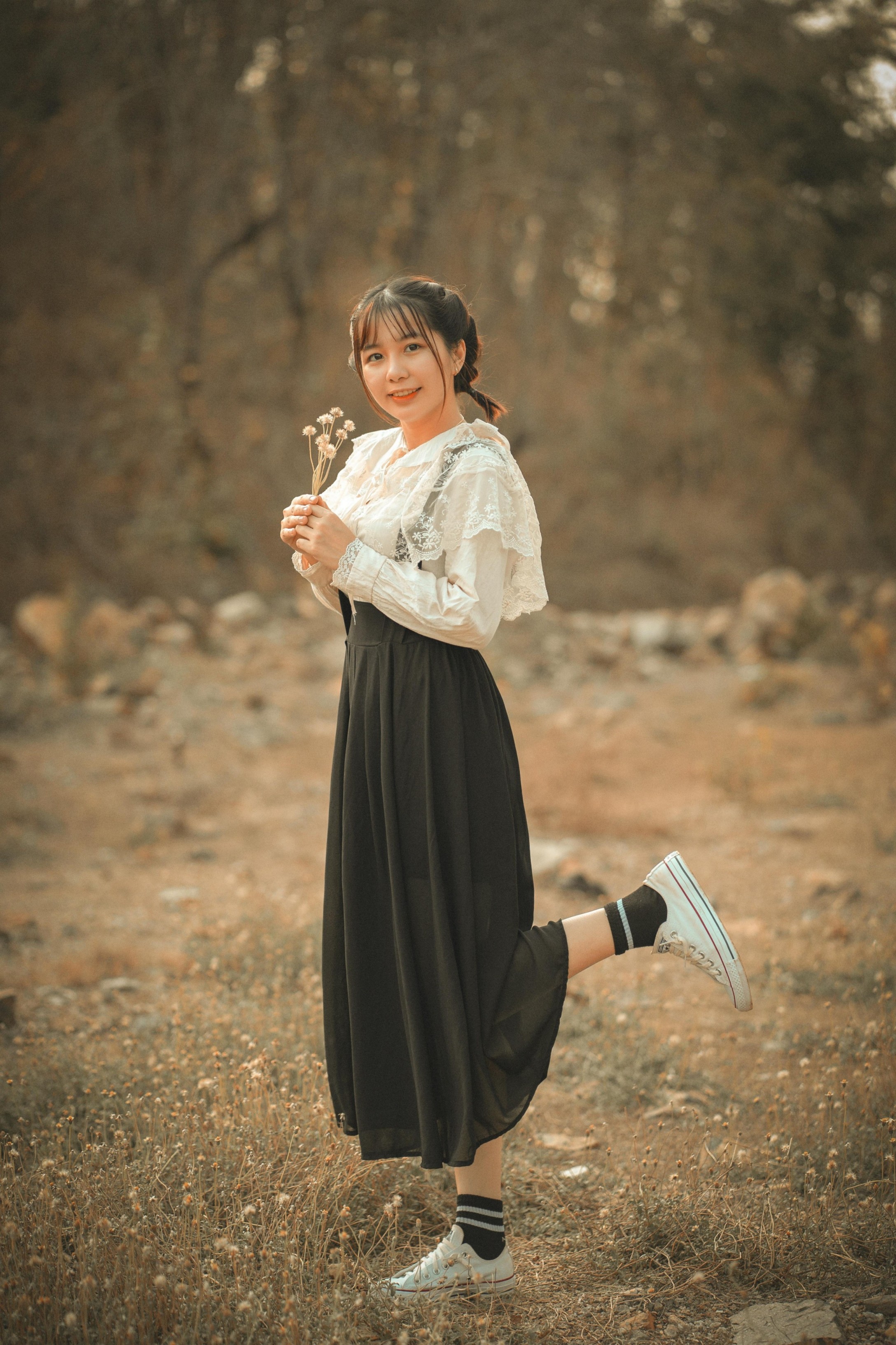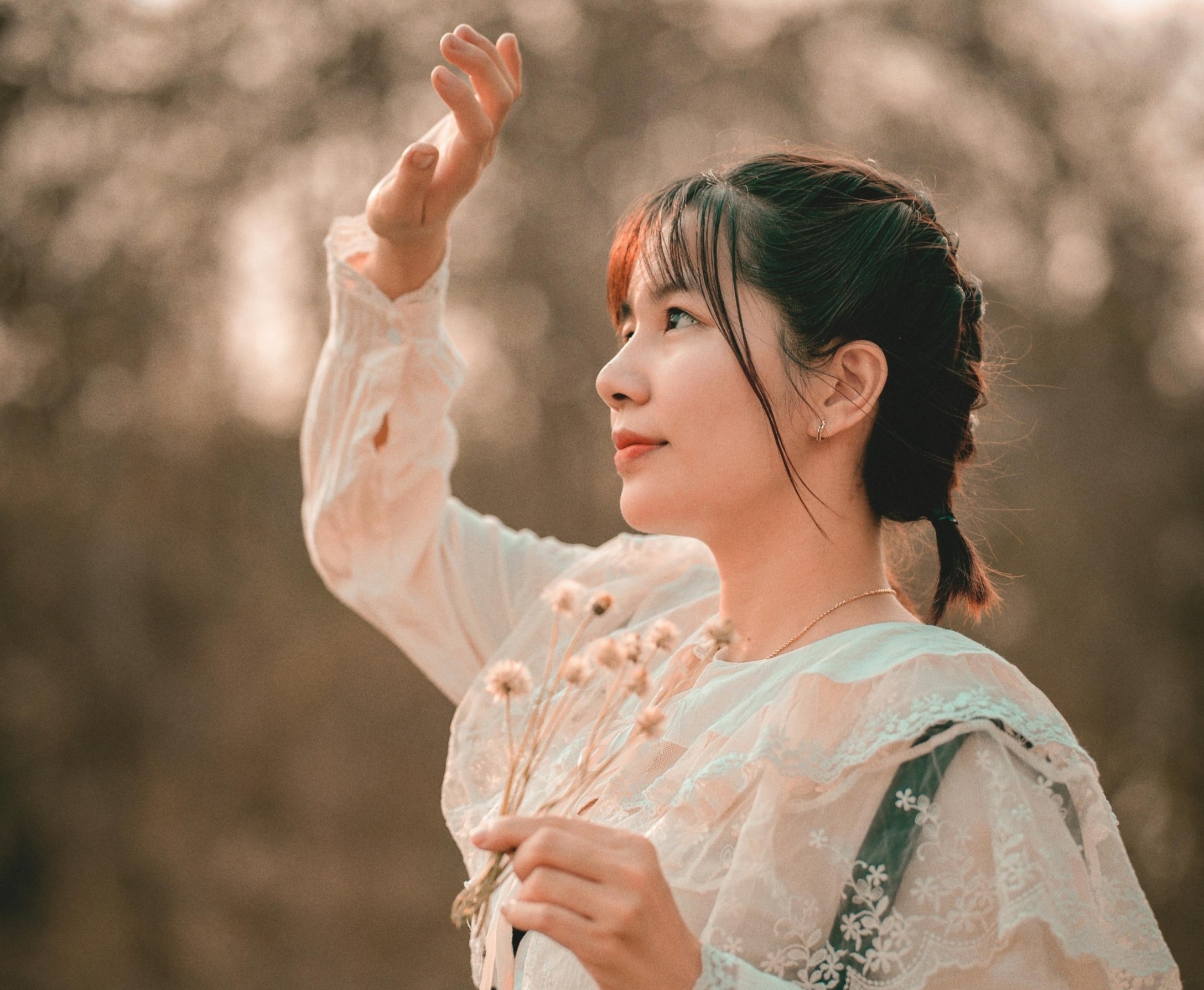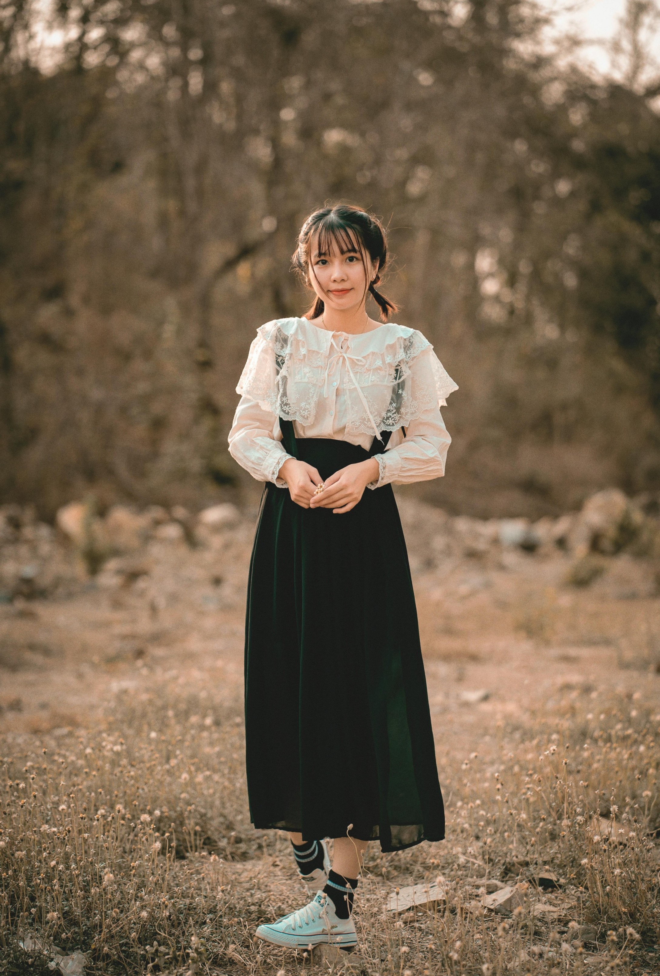 她穿着温柔的森系套装,坐在枯黄的草地上,指尖捏着一朵小小的干花,眼里盛着落日的碎光。垂眸浅笑时,蕾丝的褶皱被光影勾勒得软乎乎的;抬手轻触风的瞬间,连空气都漫着松弛的温柔。暖调的阳光把一切都揉得软软的,把秋日独有的慵懒与清甜,都藏进了每一个不经意的动作里。