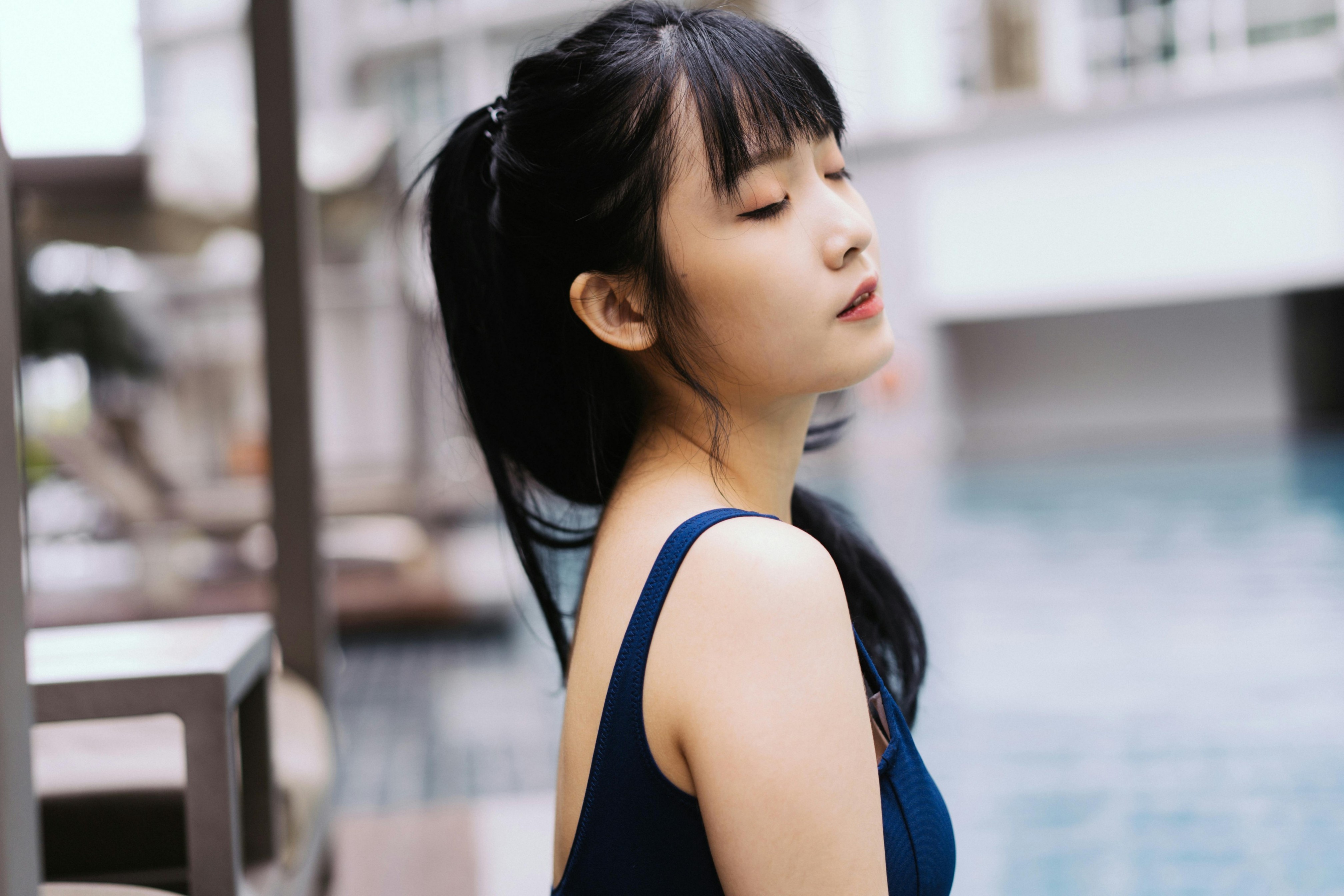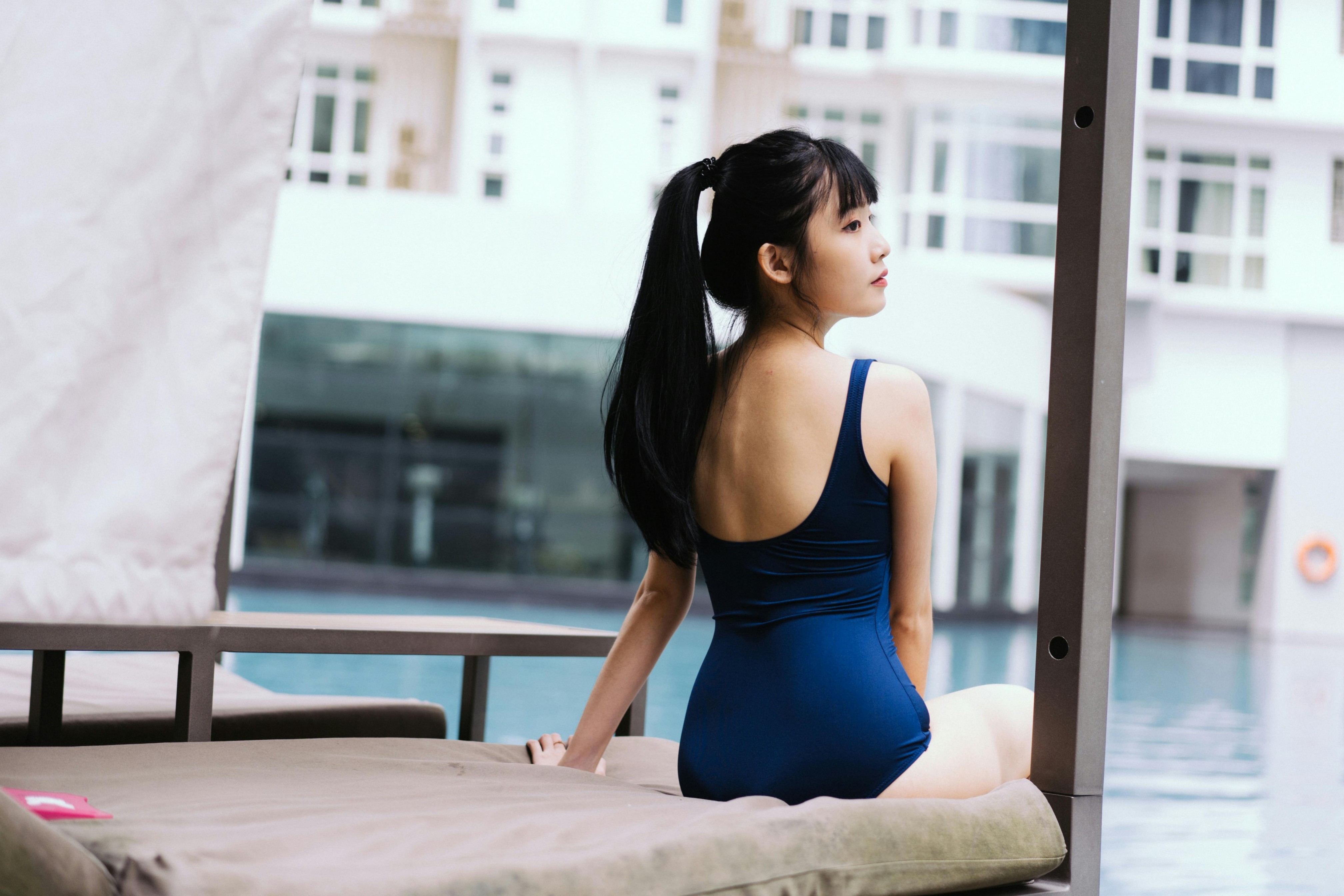 🌊 夏日泳池 | 藏蓝泳衣与高马尾 | 自带清爽感的元气少女