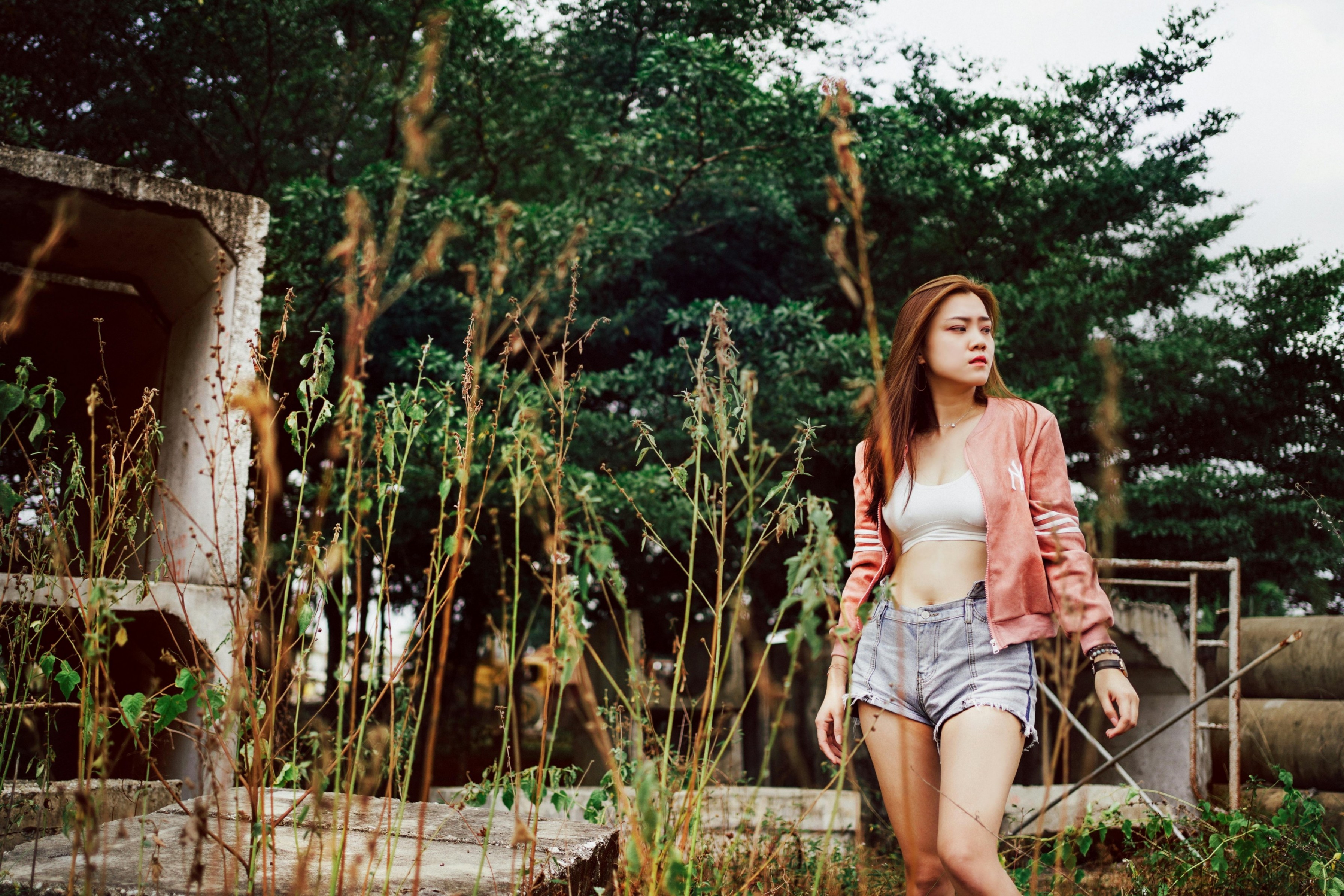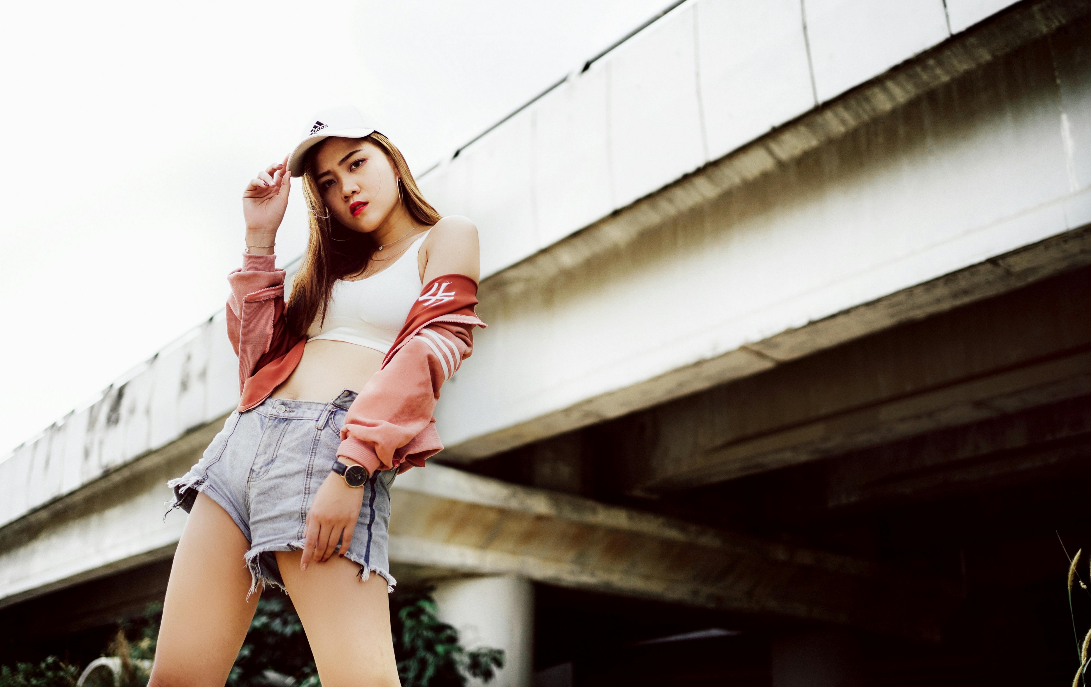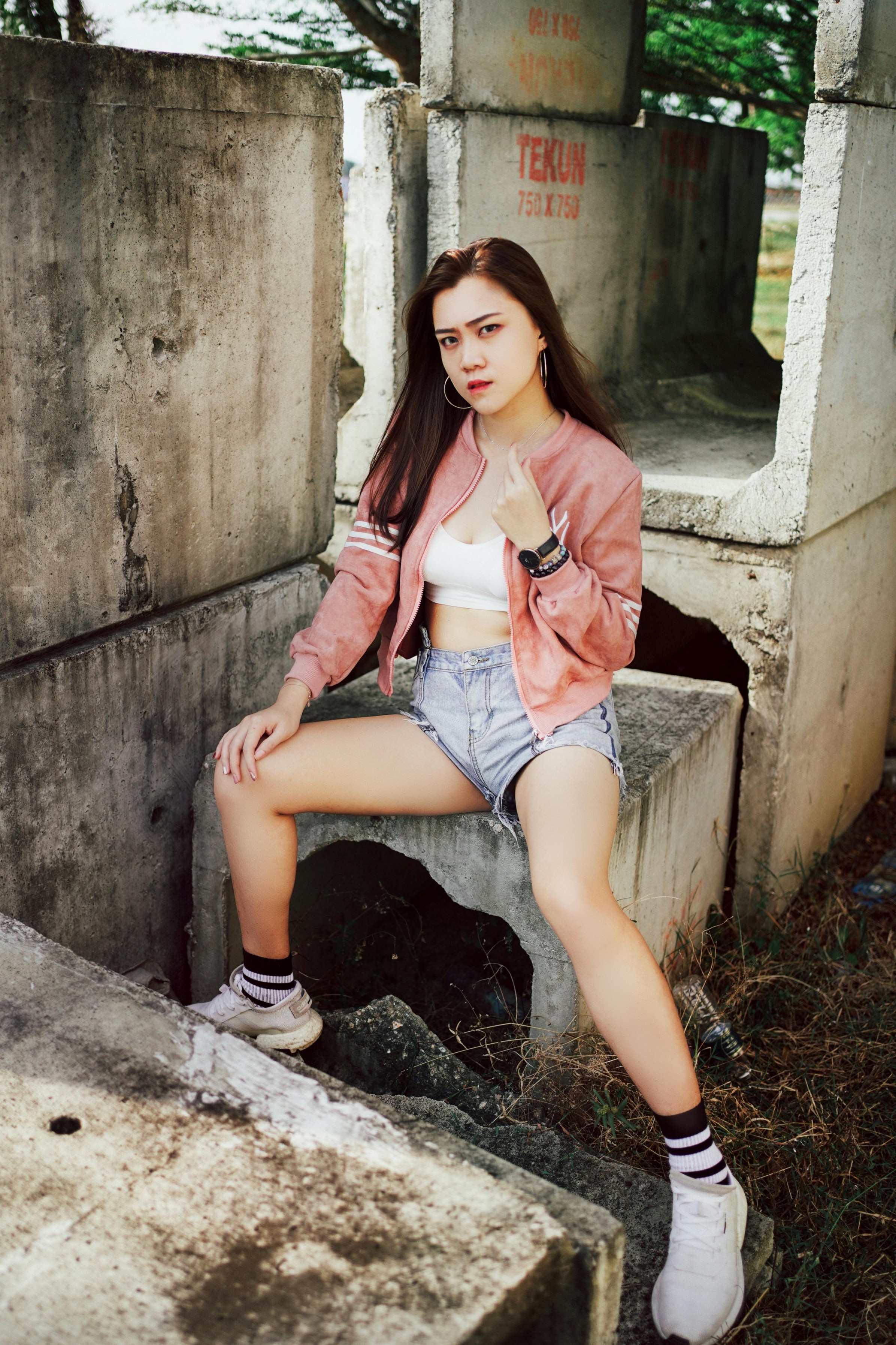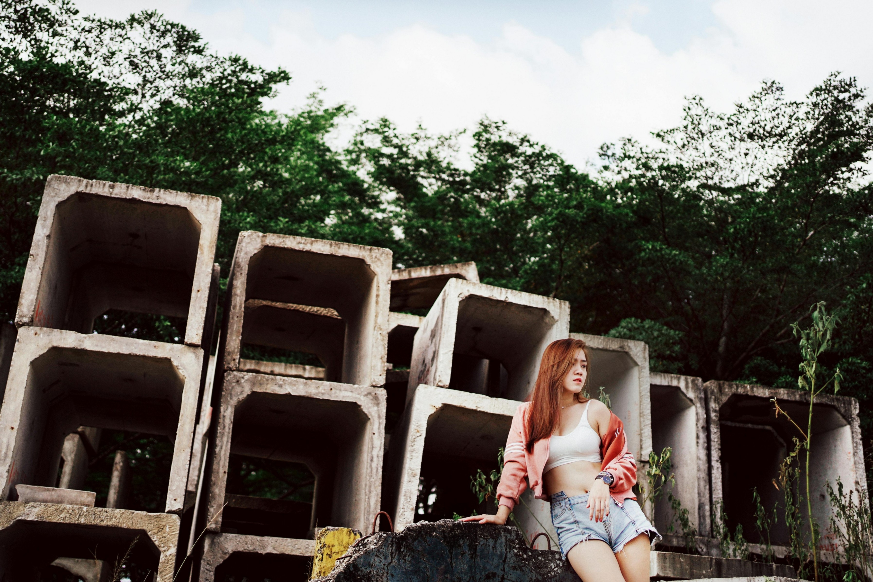 她倚在粗糙的水泥构件上,姿态松弛又带着疏离感,抬眼时眼神里带着生人勿近的拽劲儿,垂眸时又藏着少女的利落锋芒。利落的短上衣和牛仔短裤,搭配松垮的外套,在斑驳的旧建筑里,把街头独有的随性与酷飒,都揉进了每一个不经意的动作里。
