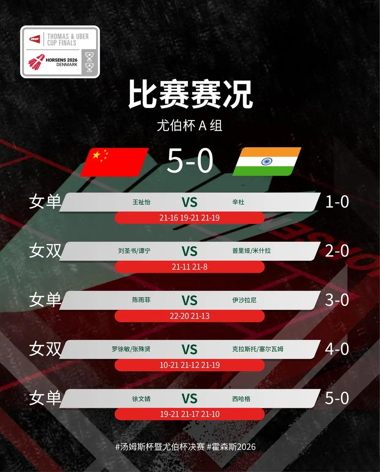 北京时间4月28日清晨,2026年尤伯杯女子羽毛球团体赛在丹麦霍森斯继续进行。中国女子羽毛球队在小组赛第三场较量中,以总比分5比0战胜印度队,以三战全胜且未失一盘的成绩,稳居小组第一,顺利晋级八强。