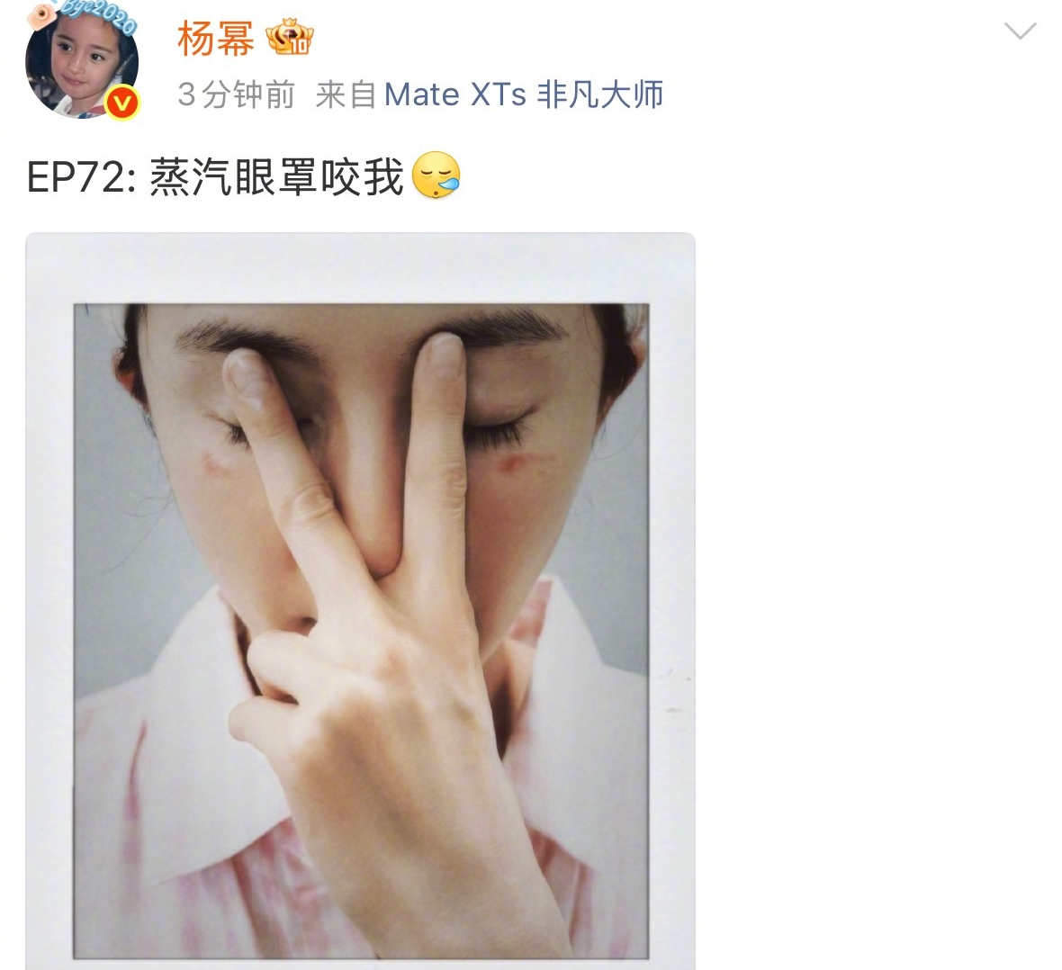 家人们,谁懂啊!2026年4月27日,杨幂突然在社交平台发文,自曝自己被蒸汽眼罩“坑”了——用的时候不小心被低温烫伤,还晒出了近距离照片,照片里她双眼下方两道红痕特别明显,看着就疼。