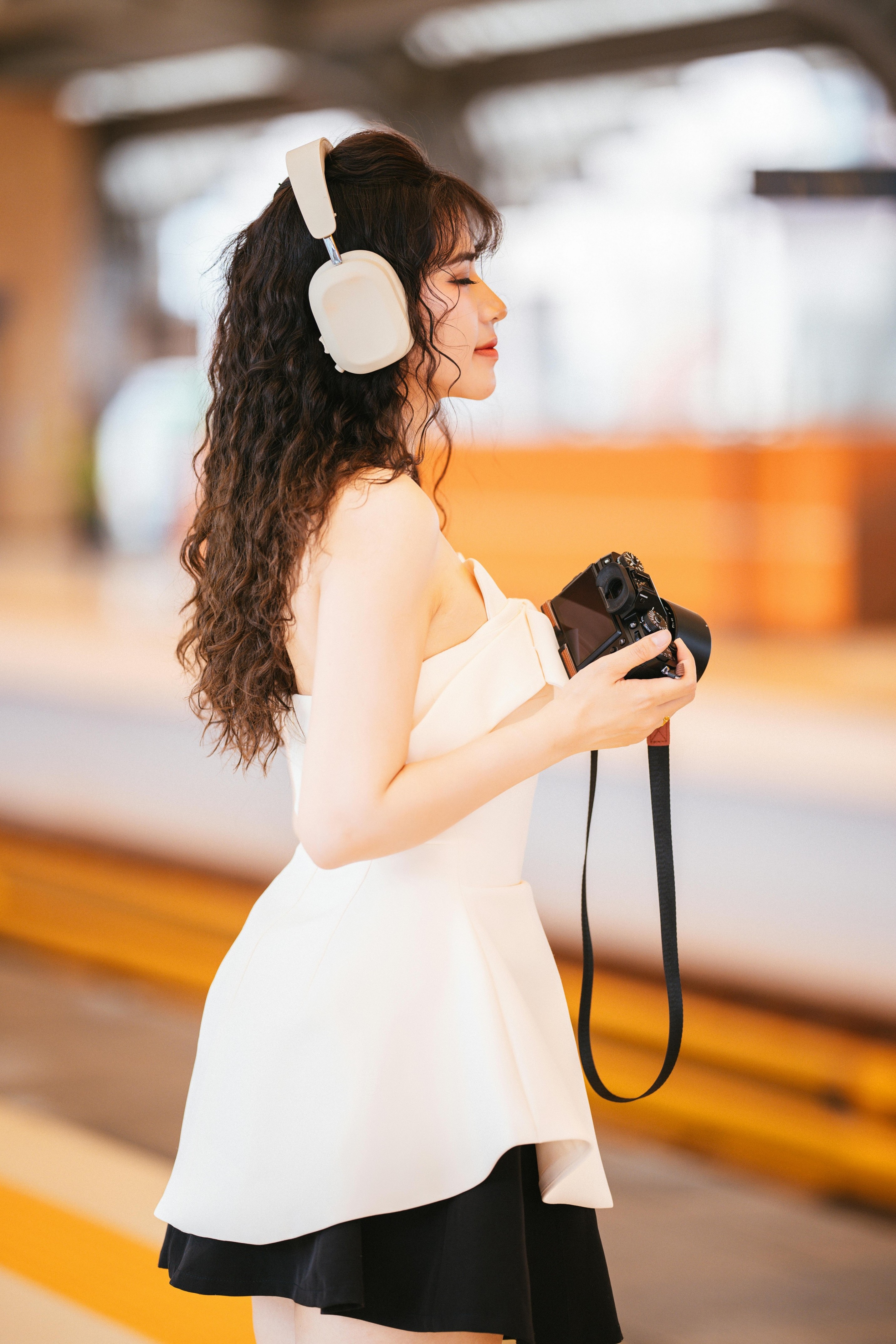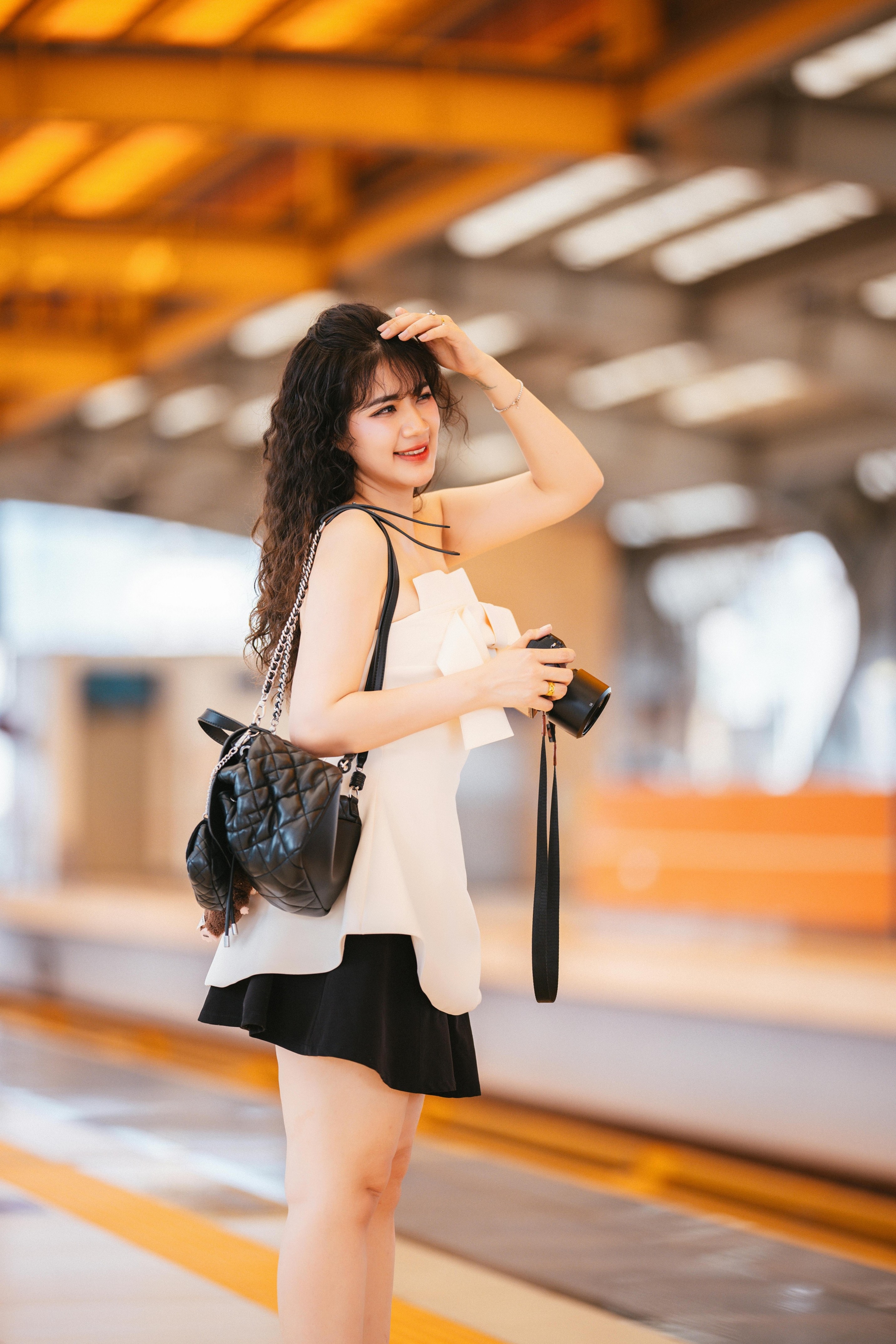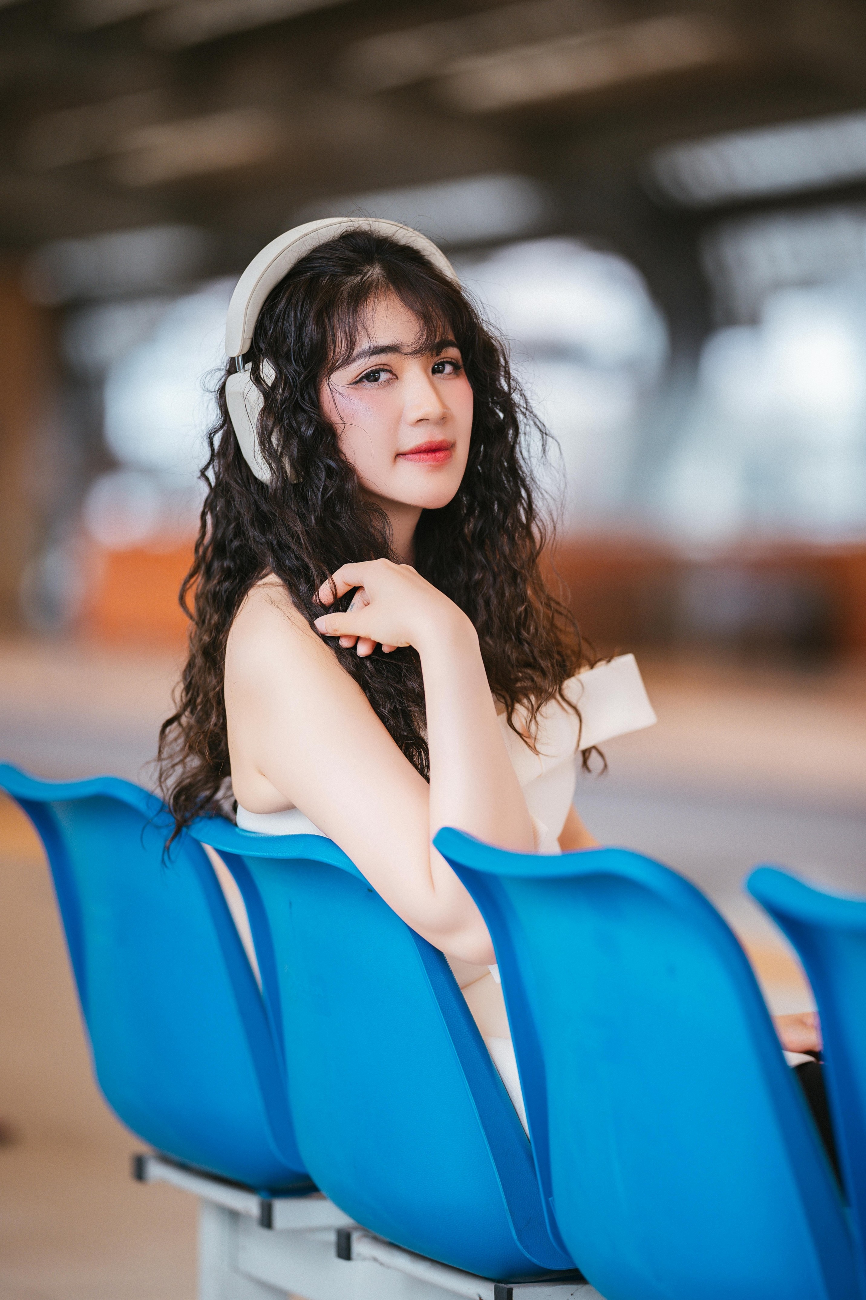 ✨ 抬手撩发、侧头看向镜头、握着相机的瞬间,每一个动作都自然又灵动。焦糖色的光影、蓝色座椅的撞色,让画面多了几分复古电影的质感,慵懒又带点小叛逆的气质,一下子就被镜头抓住了。