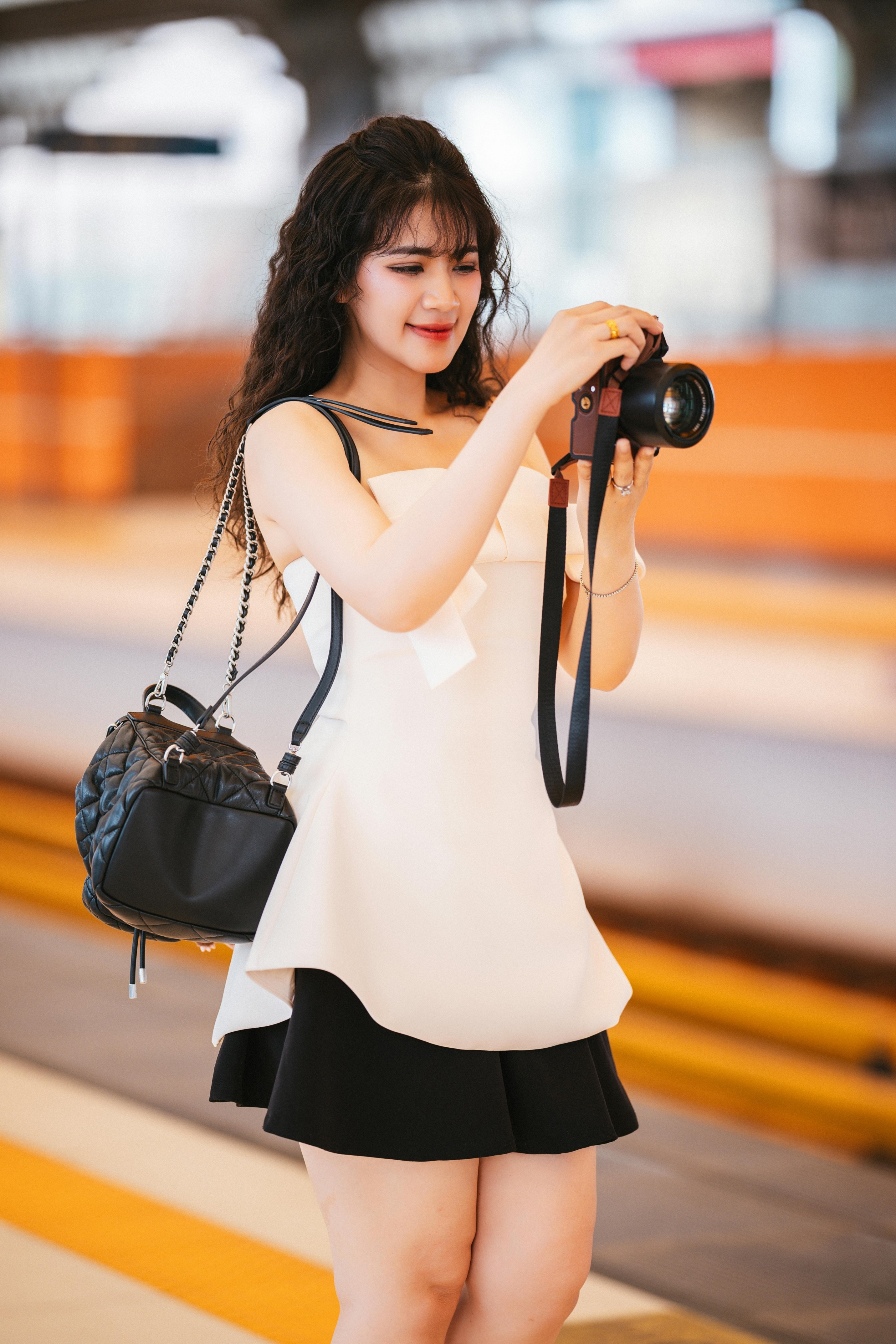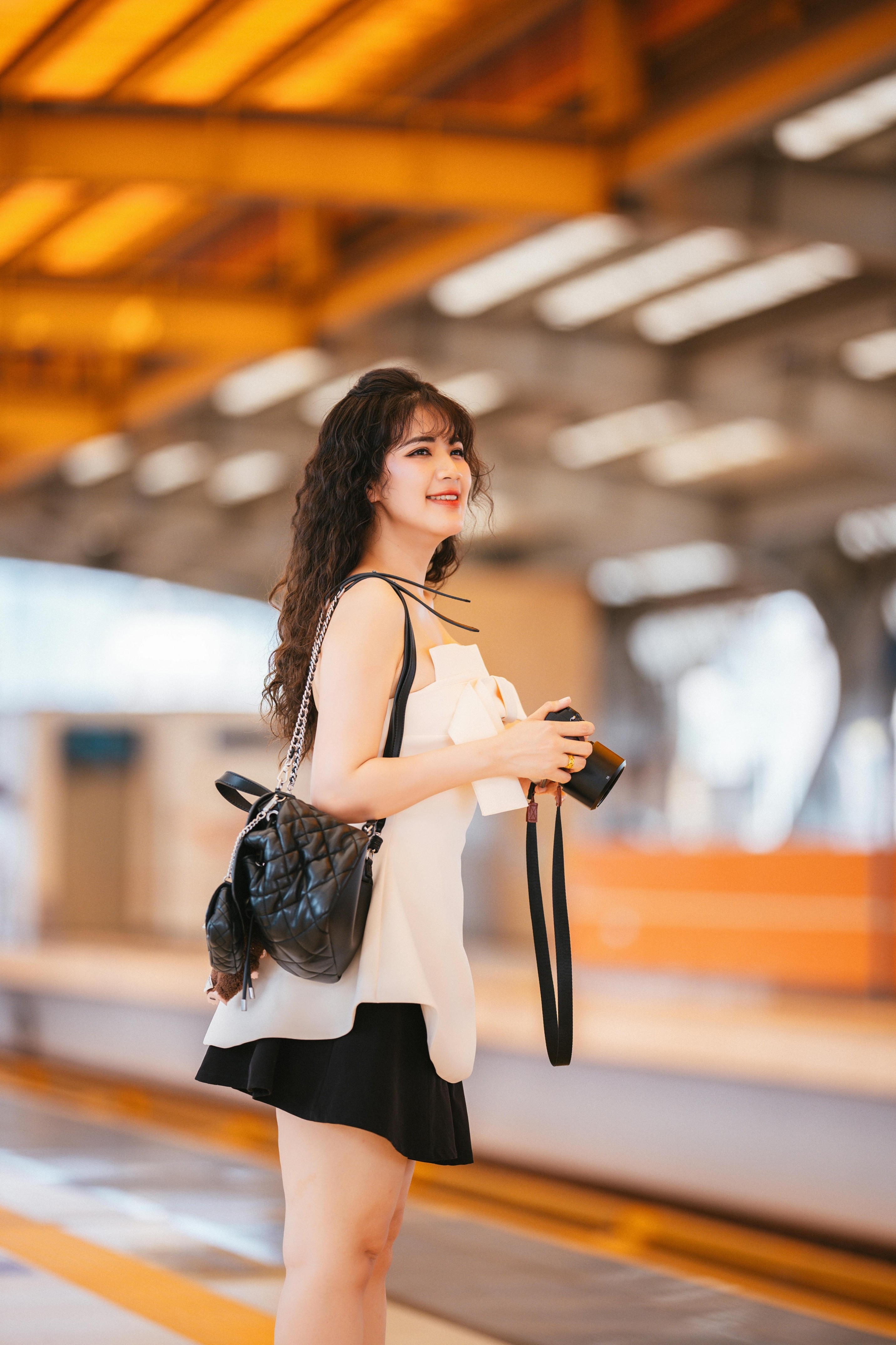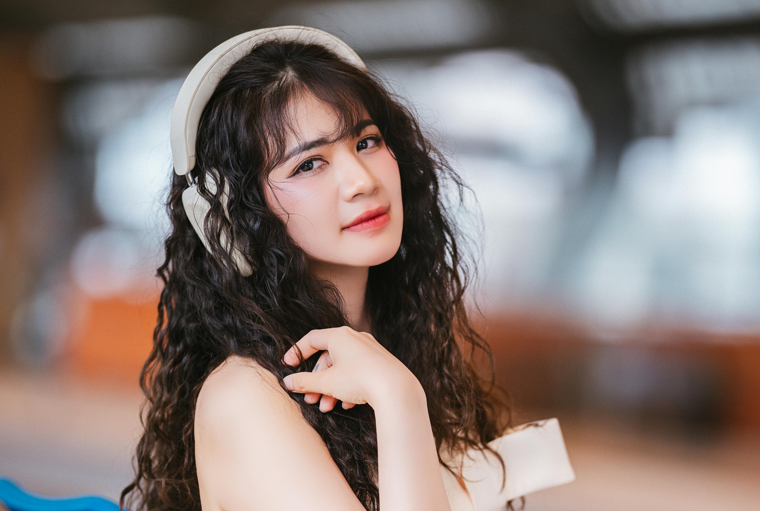 ✨ 抬手撩发、侧头看向镜头、握着相机的瞬间,每一个动作都自然又灵动。焦糖色的光影、蓝色座椅的撞色,让画面多了几分复古电影的质感,慵懒又带点小叛逆的气质,一下子就被镜头抓住了。