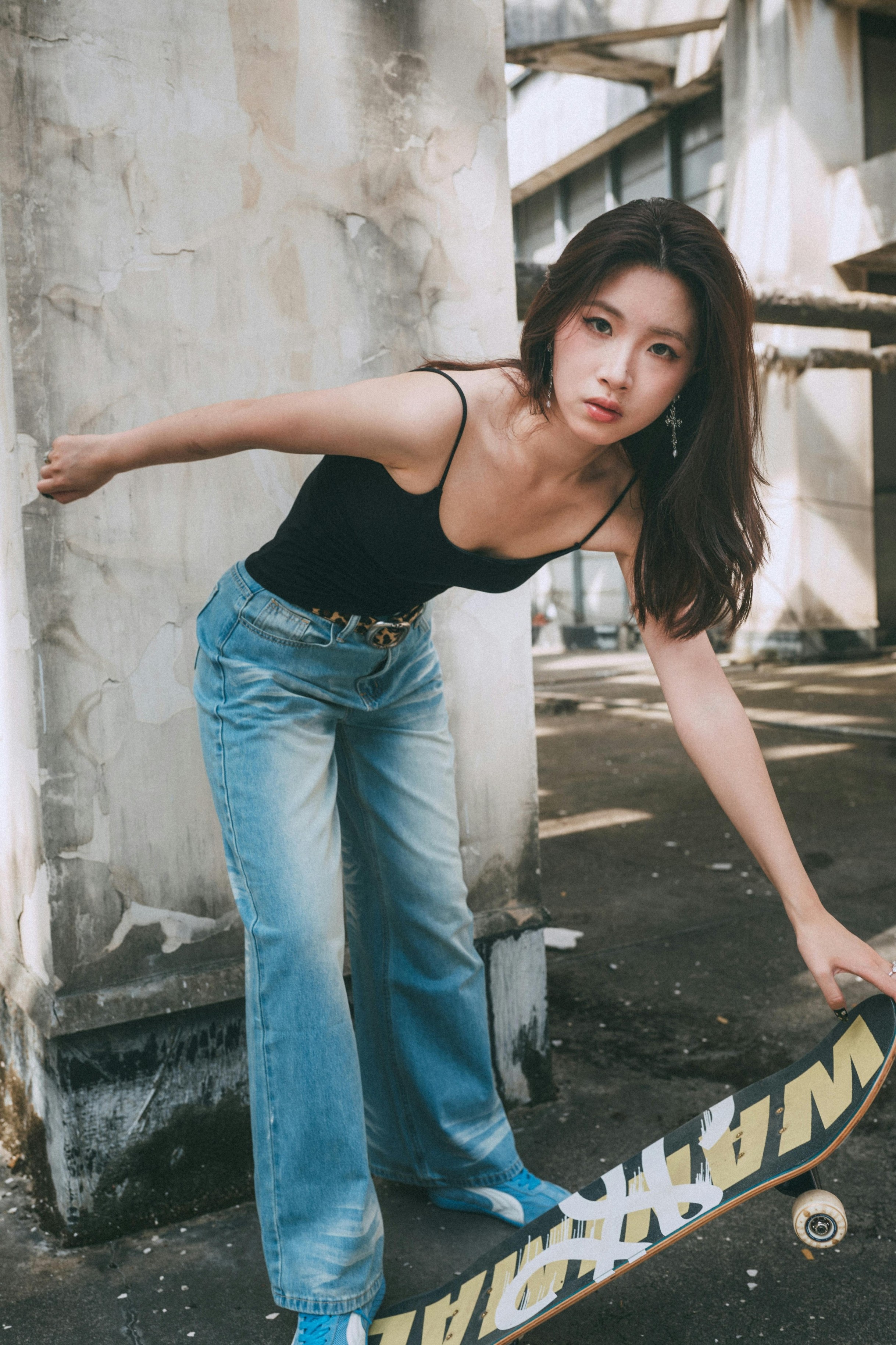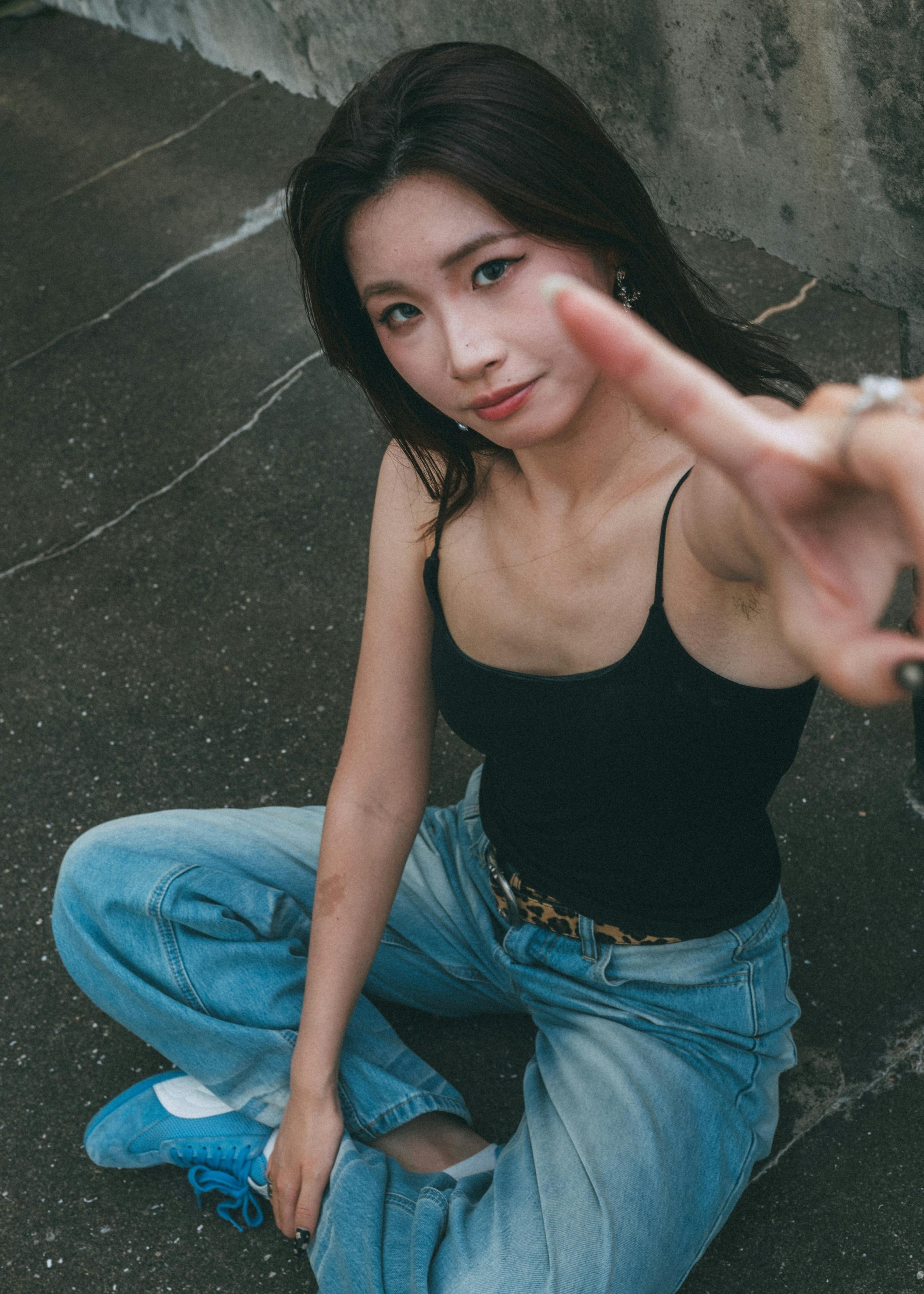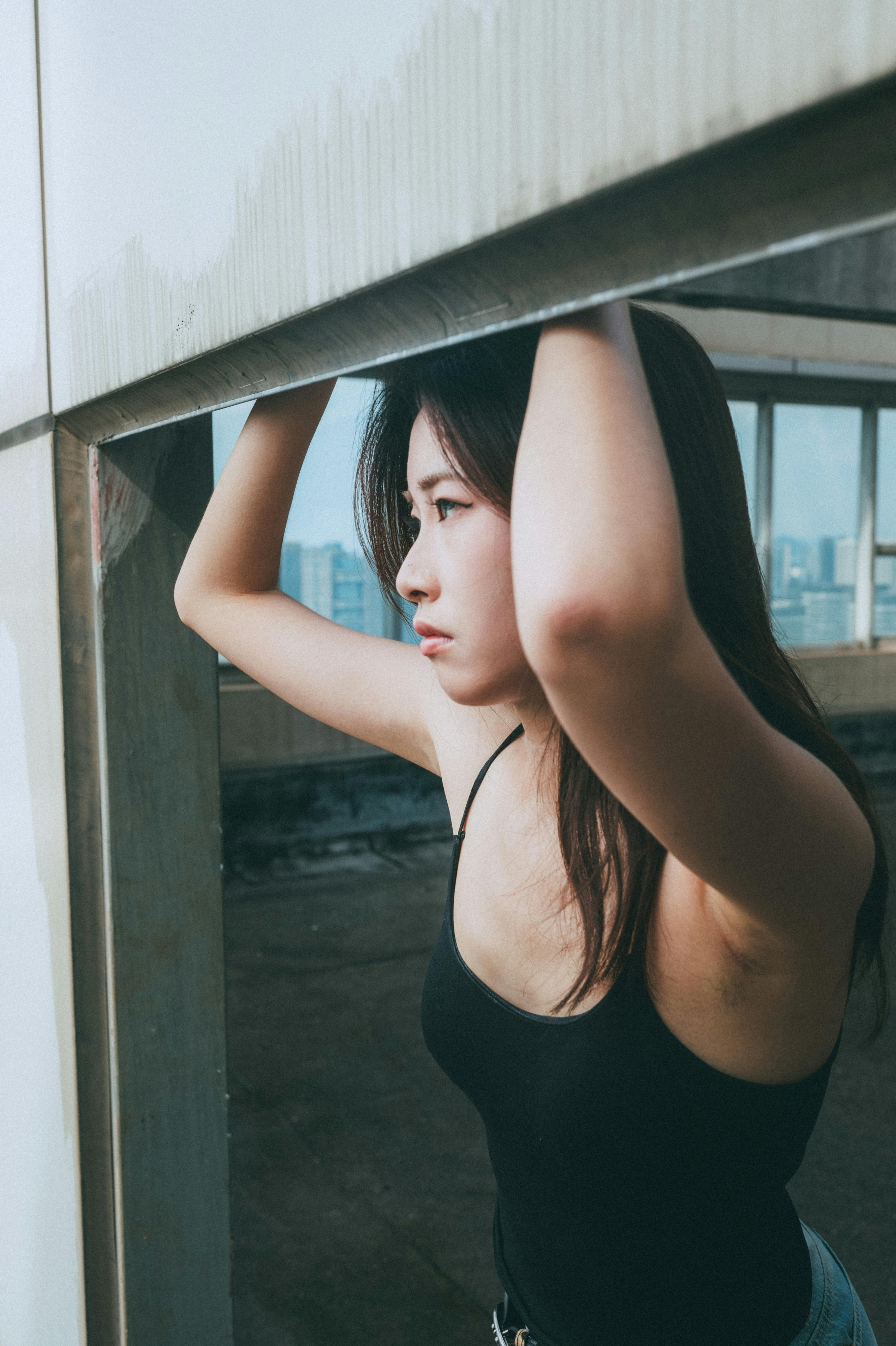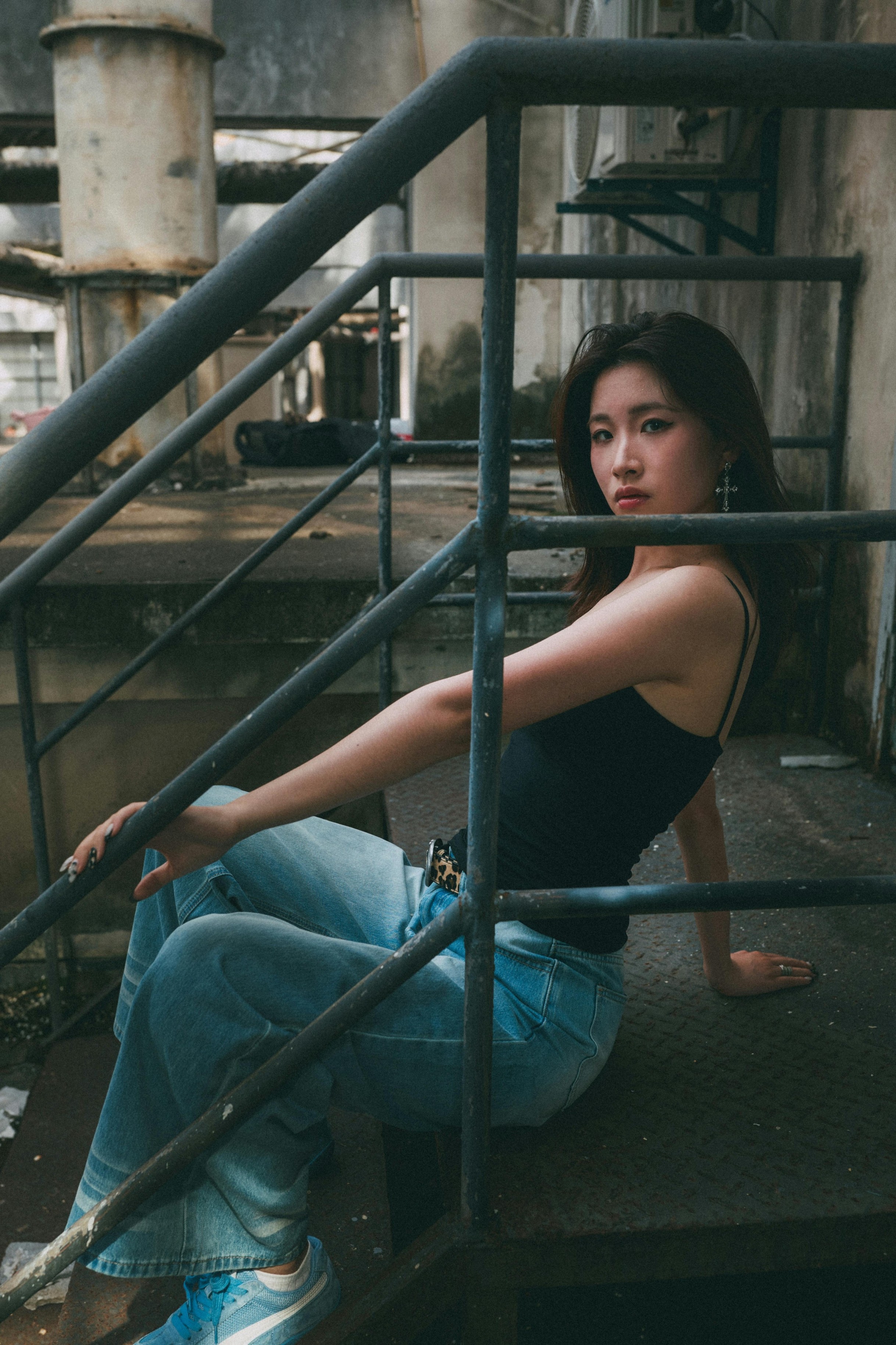 ✨ 或侧身倚坐,或抬手挡脸,或隔着栏杆望向镜头,每一个动作都带着不刻意的叛逆感。冷调的自然光落在皮肤上,在水泥墙的衬托下,眼神里的清冷与疏离被放大,像电影里自带故事感的女主角。