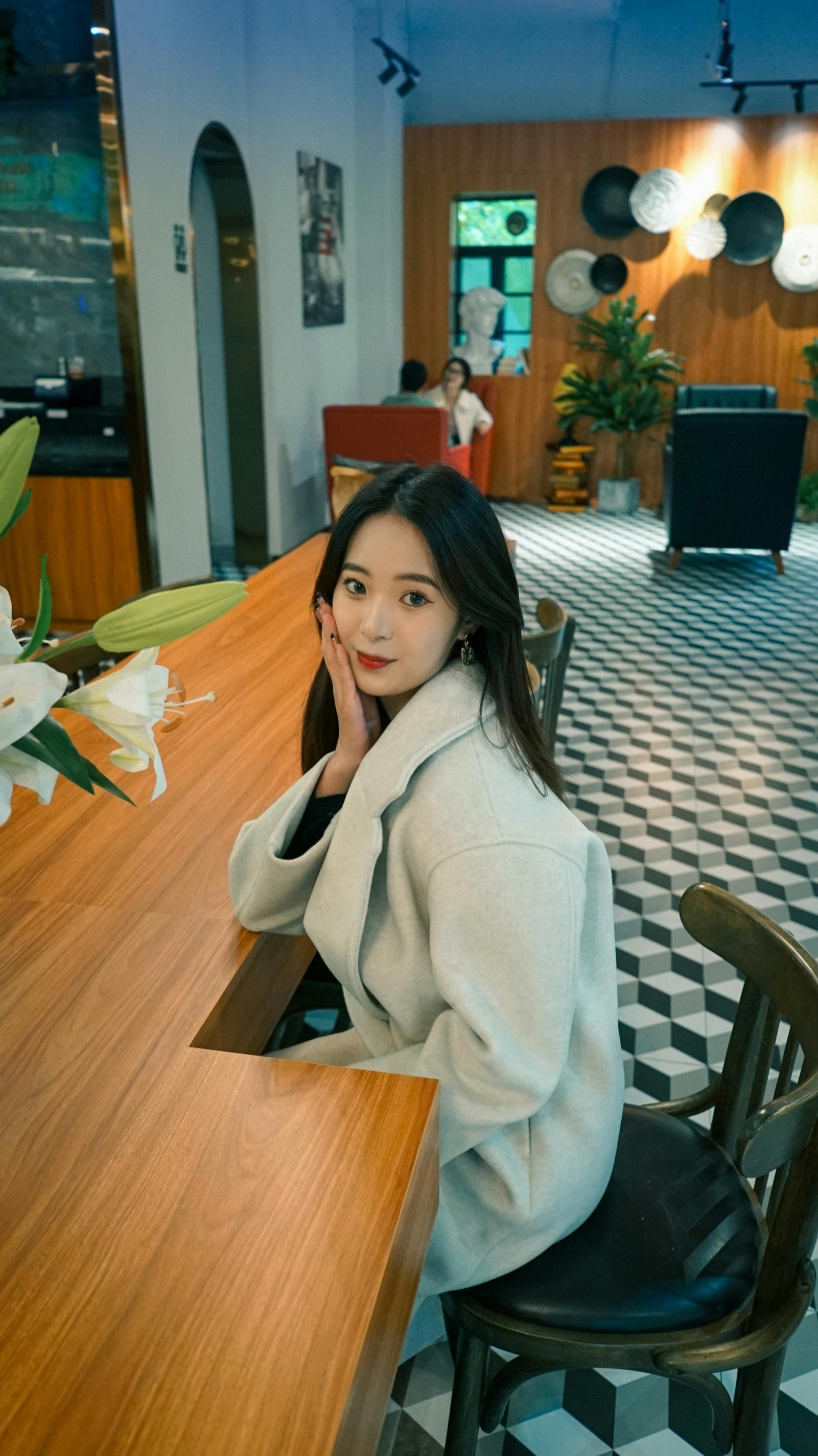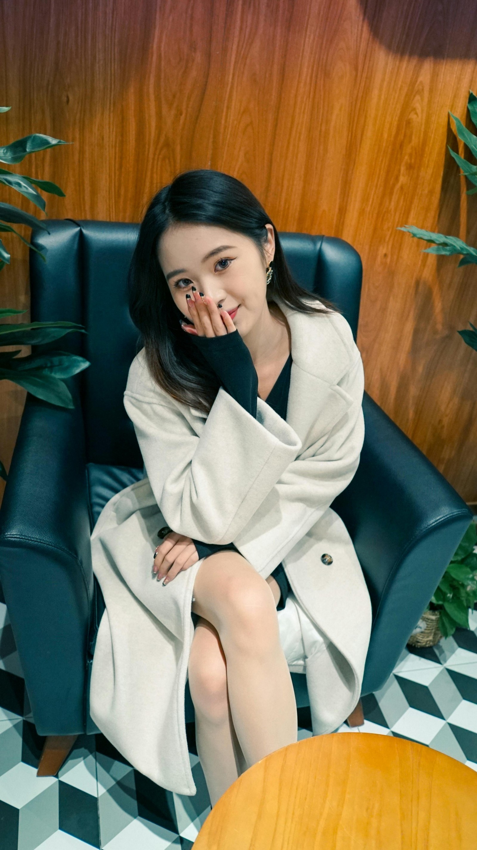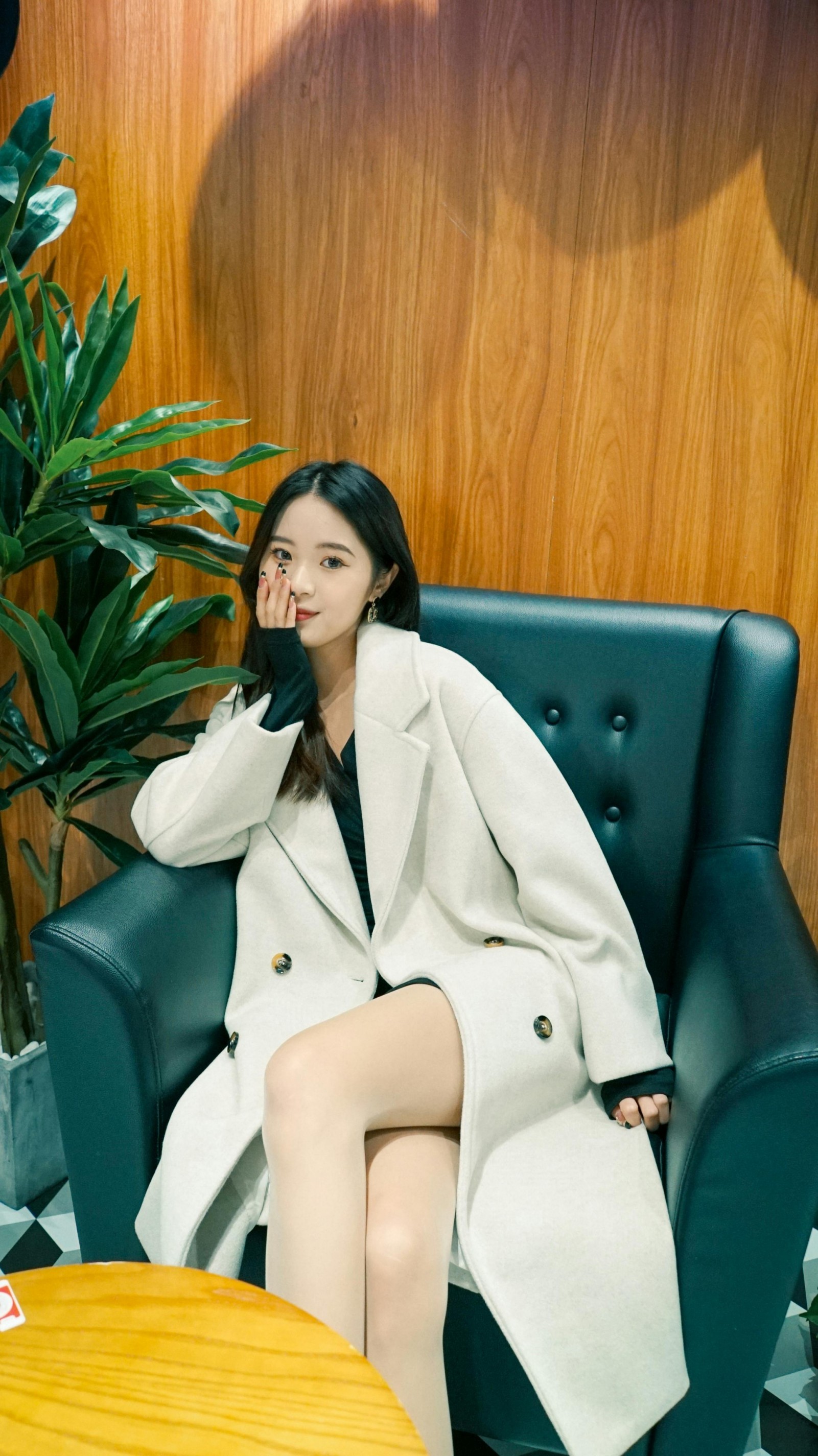 ✨ 撑着脸颊浅笑、轻靠在沙发上、或是静静坐在吧台边,每一个不经意的瞬间都被镜头温柔接住。暖调的灯光给大衣镀上了一层柔光,黑白色的地砖和木质墙面成了天然背景,把轻熟又温柔的氛围感衬得恰到好处。