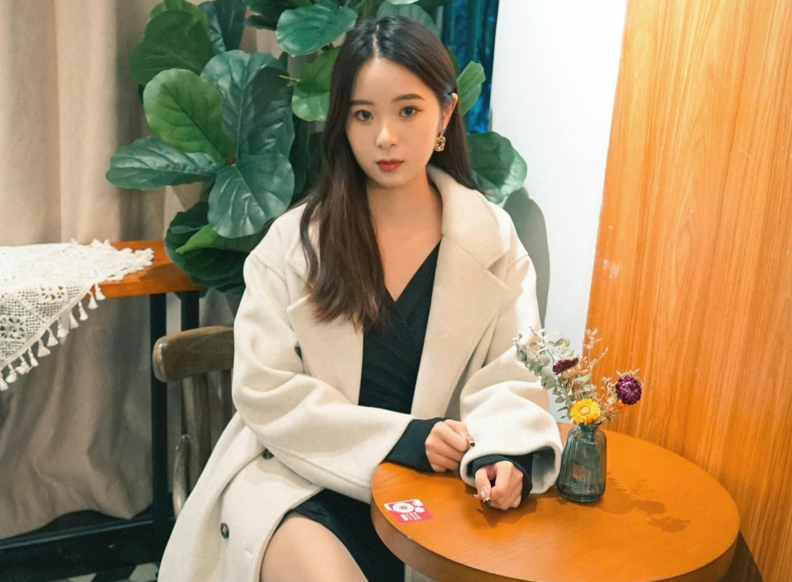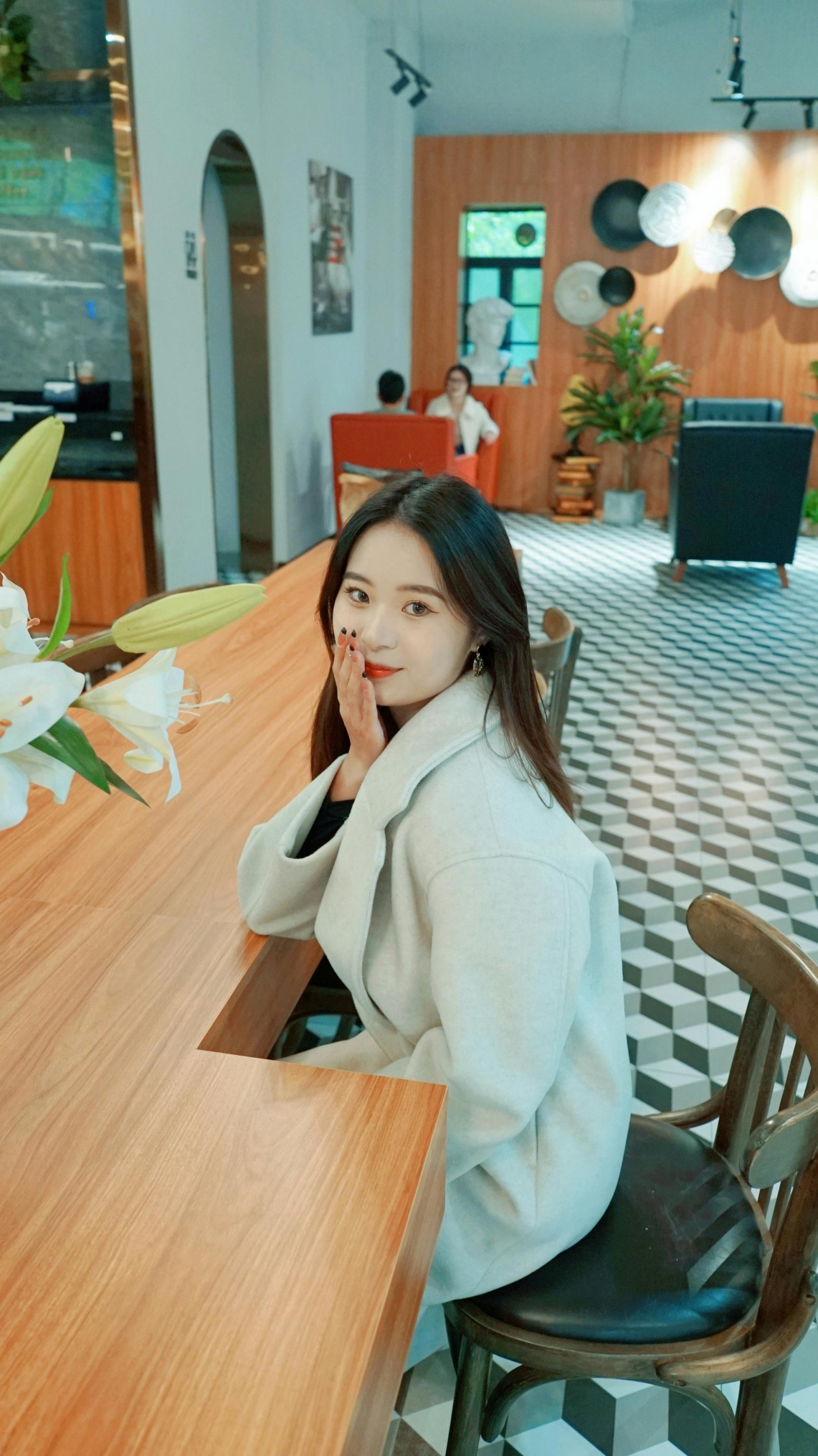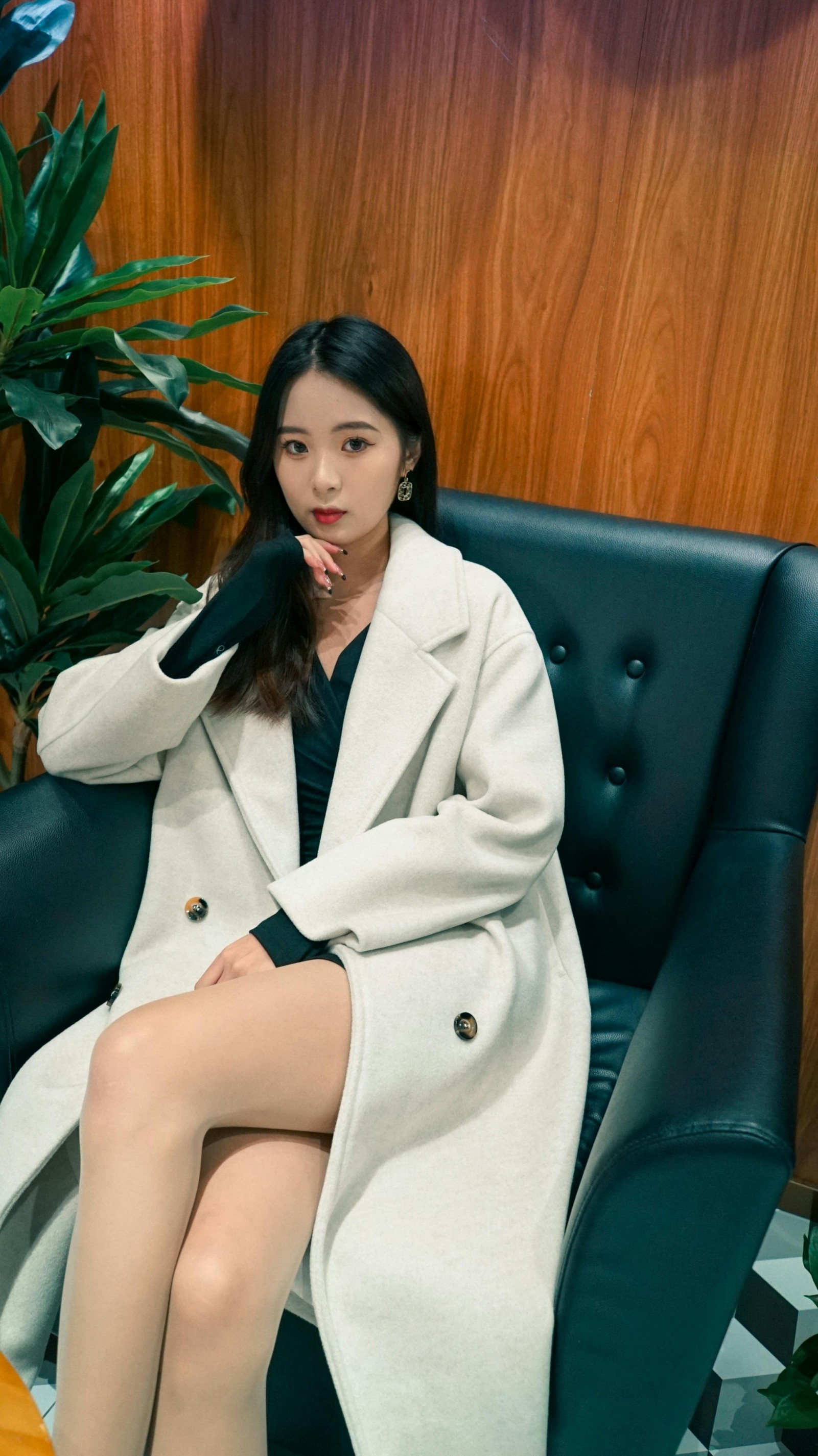 ✨ 撑着脸颊浅笑、轻靠在沙发上、或是静静坐在吧台边,每一个不经意的瞬间都被镜头温柔接住。暖调的灯光给大衣镀上了一层柔光,黑白色的地砖和木质墙面成了天然背景,把轻熟又温柔的氛围感衬得恰到好处。