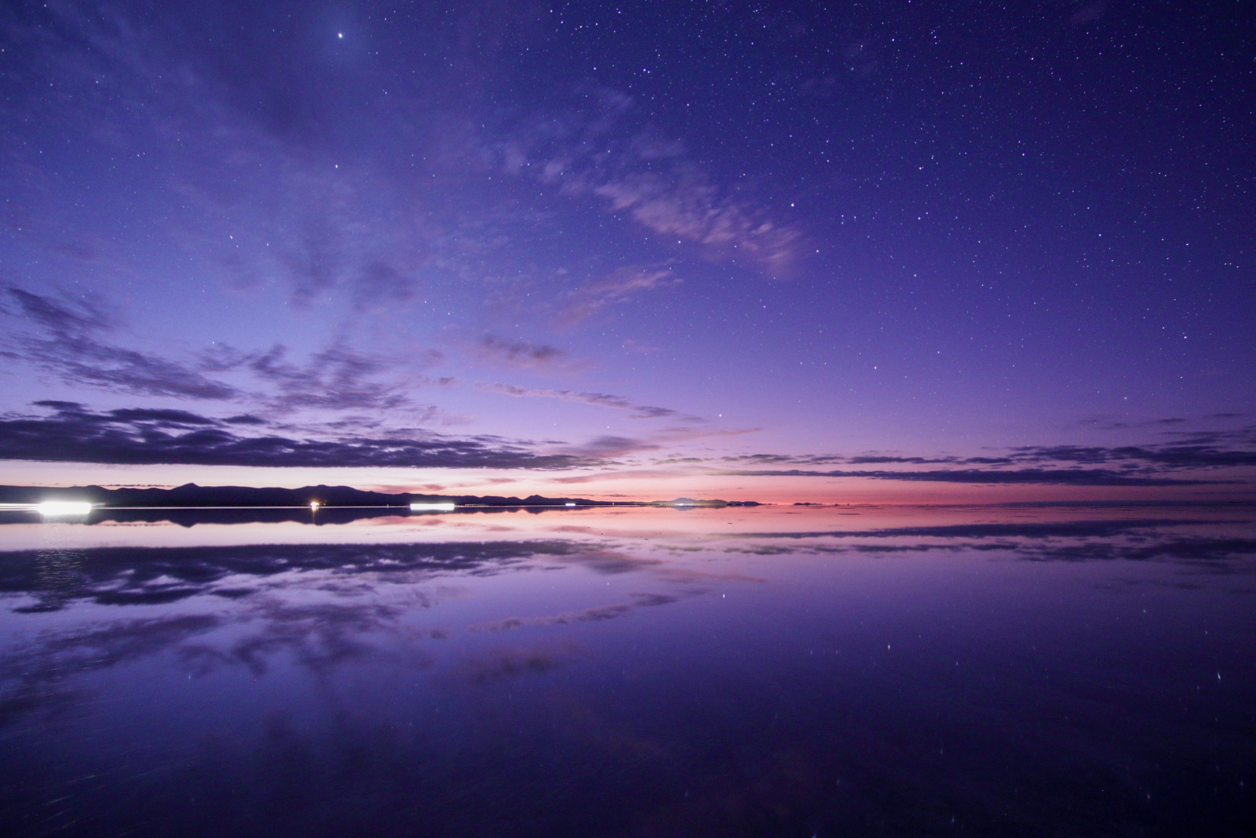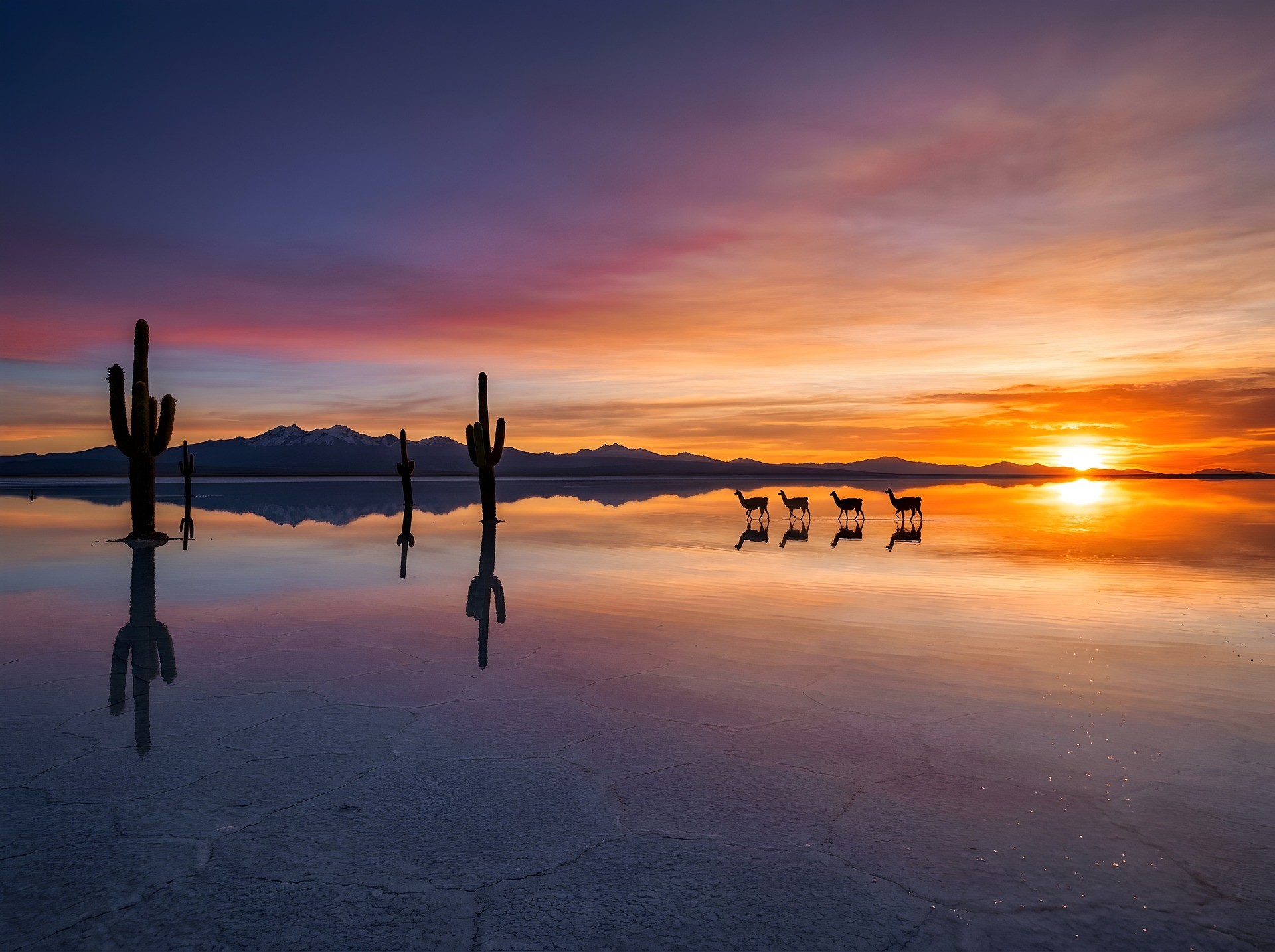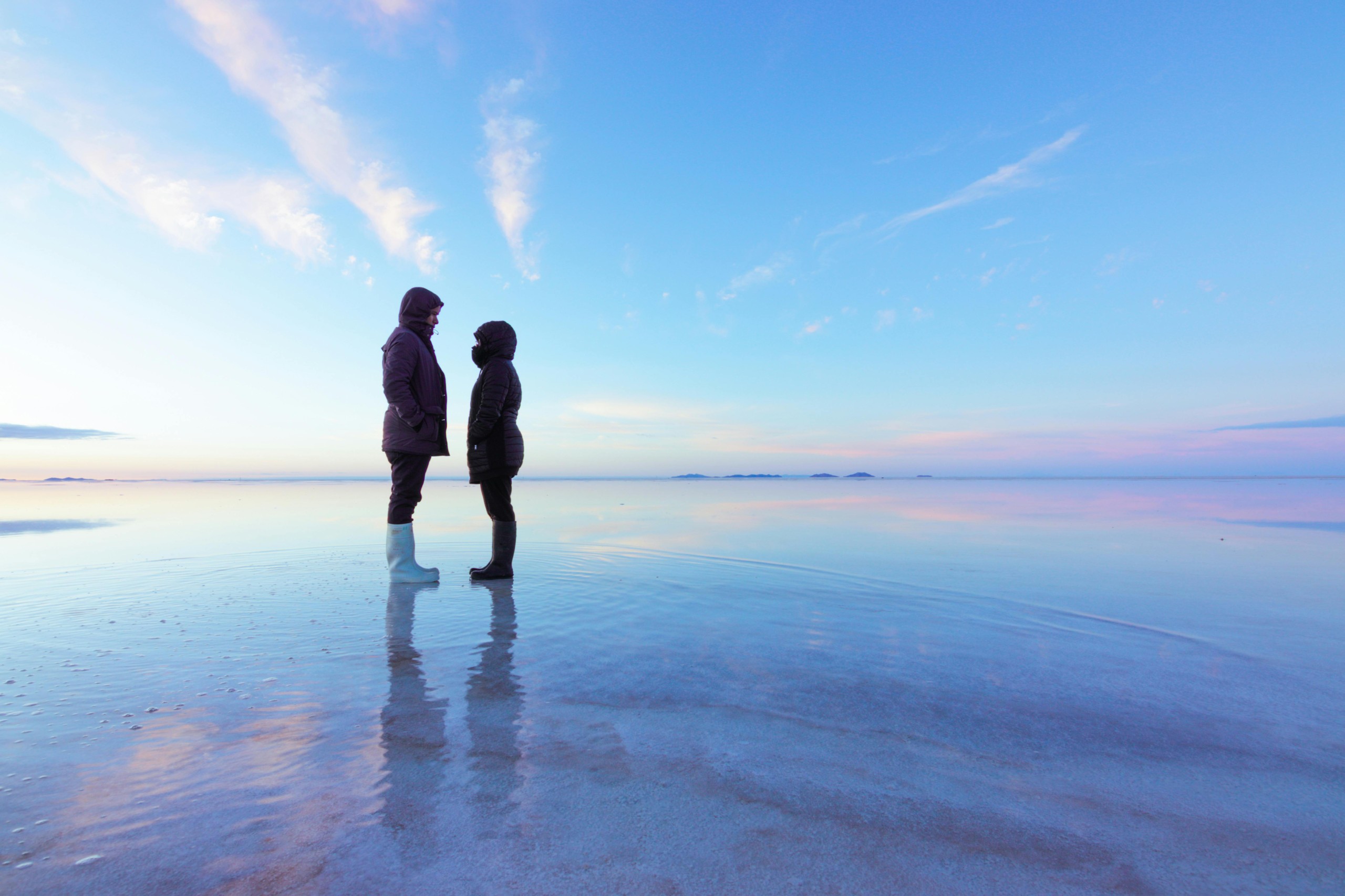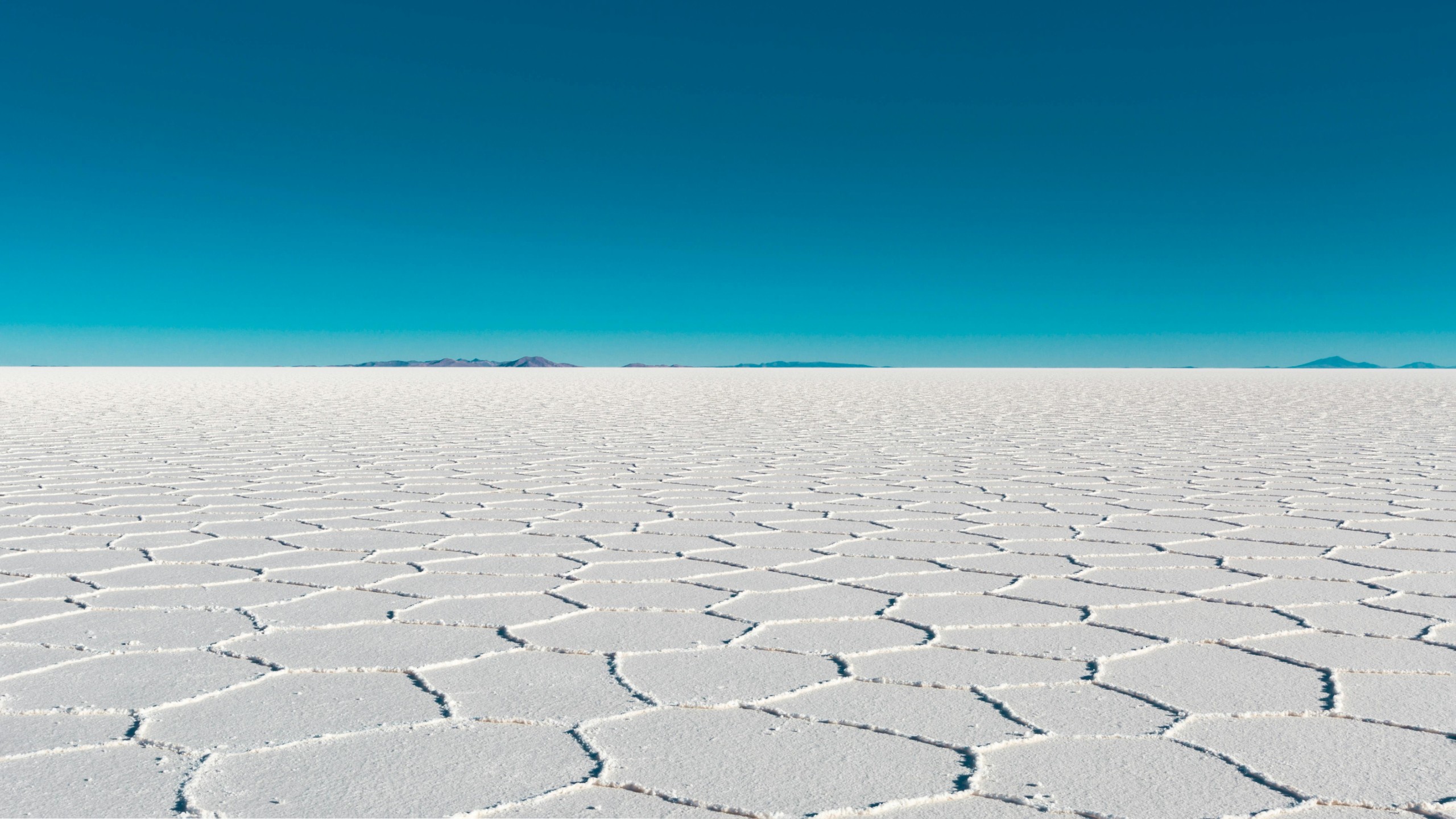 深度描述: 乌尤尼是世界最大的盐沼,面积超过1万平方公里。当雨季来临,薄薄的水层覆盖在纯白的盐壳上,形成了一面绝对水平的镜子,将湛蓝的天空和漂浮的云朵完美反射。此时,地平线彻底消失,人类仿佛悬浮在虚无的维度或平行宇宙的交界处。而在旱季,地表则裂变成无数规则的六角形盐块,像是一片延伸至星系尽头的白银矩阵。这里极度纯净且荒凉,由于温差大、空气稀薄,感官会被极度放大,产生一种不在地球的错觉。