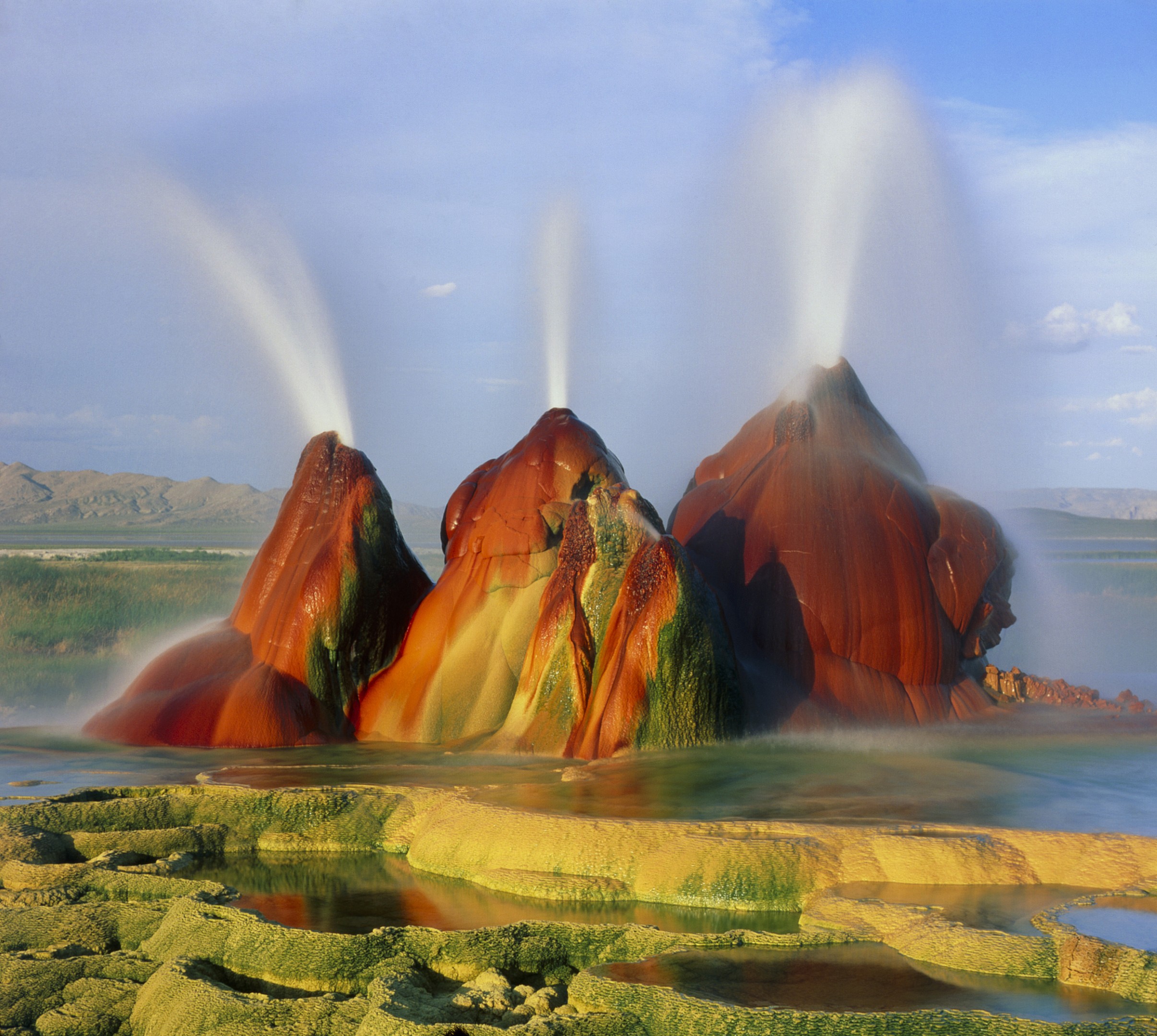 深度描述: 飞喷泉的诞生是一个完美的“意外”。20世纪初,由于钻井开发地热资源后未妥善封口,地底深处富含矿物质的热水不断喷涌而出。几十年来,碳酸钙和硅沉积物在地表不断堆积,形成了数个造型奇特、色彩斑斓的圆锥体塔台。由于嗜热藻类在高温矿物质中生长,喷泉呈现出鲜艳的红色、黄色和绿色。它看起来极其不符合地球生物的逻辑,更像是由某种外星真菌或粘菌生物在荒漠中构建的巨大群落,充满了诡谲而危险的美感。影迹: 它独特的形态经常出现在各种科幻画报中,被认为是《异形》等电影中关于行星表面生物形态设计的现实灵感来源之一。