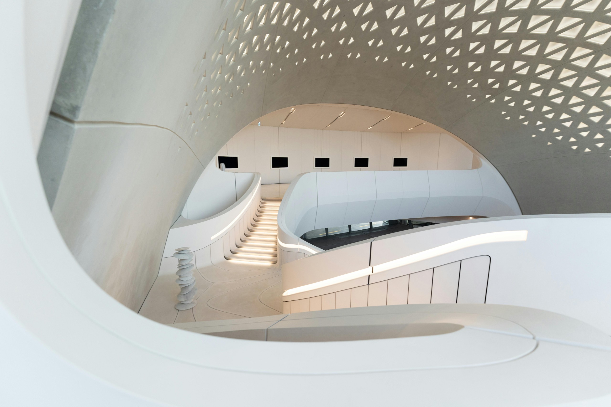 深度描述: 这是一座漂浮在海面上的“微型城市”。最科幻的设计是它巨大的银色穹顶,重达7500吨,由八层复杂的金属几何图形堆叠而成。当阳光穿过穹顶的孔隙,会洒下名为“光雨”的视觉奇观,仿佛在宇宙飞船内部感受星光的洗礼。博物馆由55座白色独立建筑组成,四周环水。这种纯白、极简且带有复杂几何纹理的设计,极像科幻巨著《沙丘》中卡拉丹星球的官邸,或者是某个高阶星际文明在水行星上建立的学术圣殿,庄严而深邃。