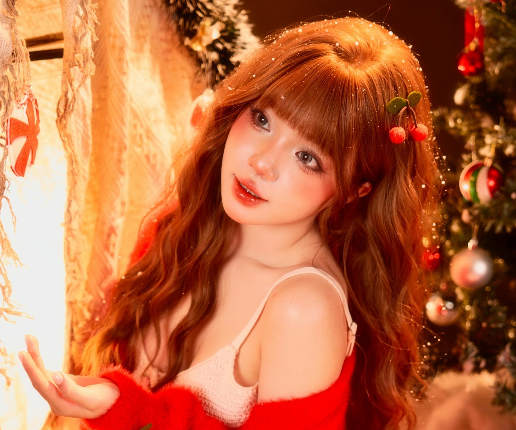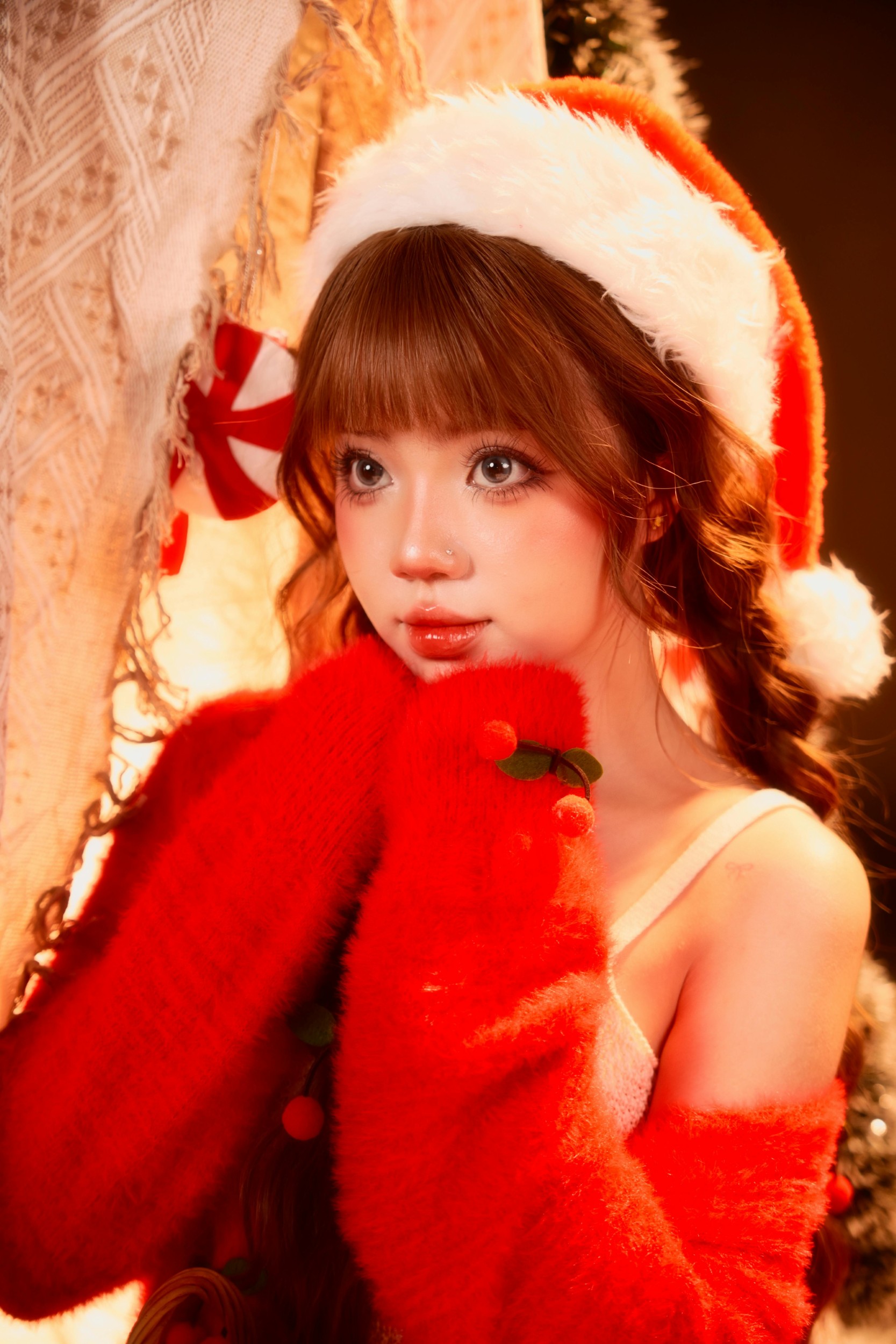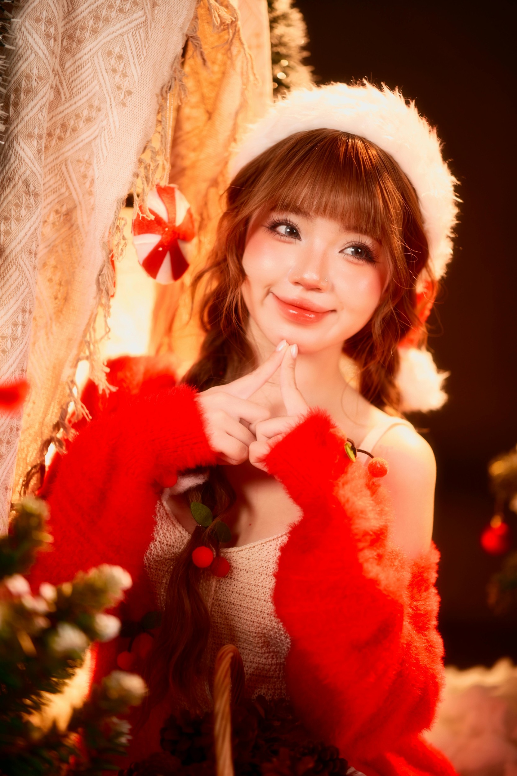 她抱着装满松果的藤篮,指尖轻触飘落的细碎光点,眼里盛着星光,笑容软乎乎的。背景里的装饰树、精致的礼物盒,和她身上的樱桃小配饰相映成趣,整个场景像被施了魔法,泛着温柔的光晕。热烈的红、蓬松的白,和她甜软的笑容融在一起,把独属于少女的治愈与浪漫,都定格成了永不褪色的瞬间。