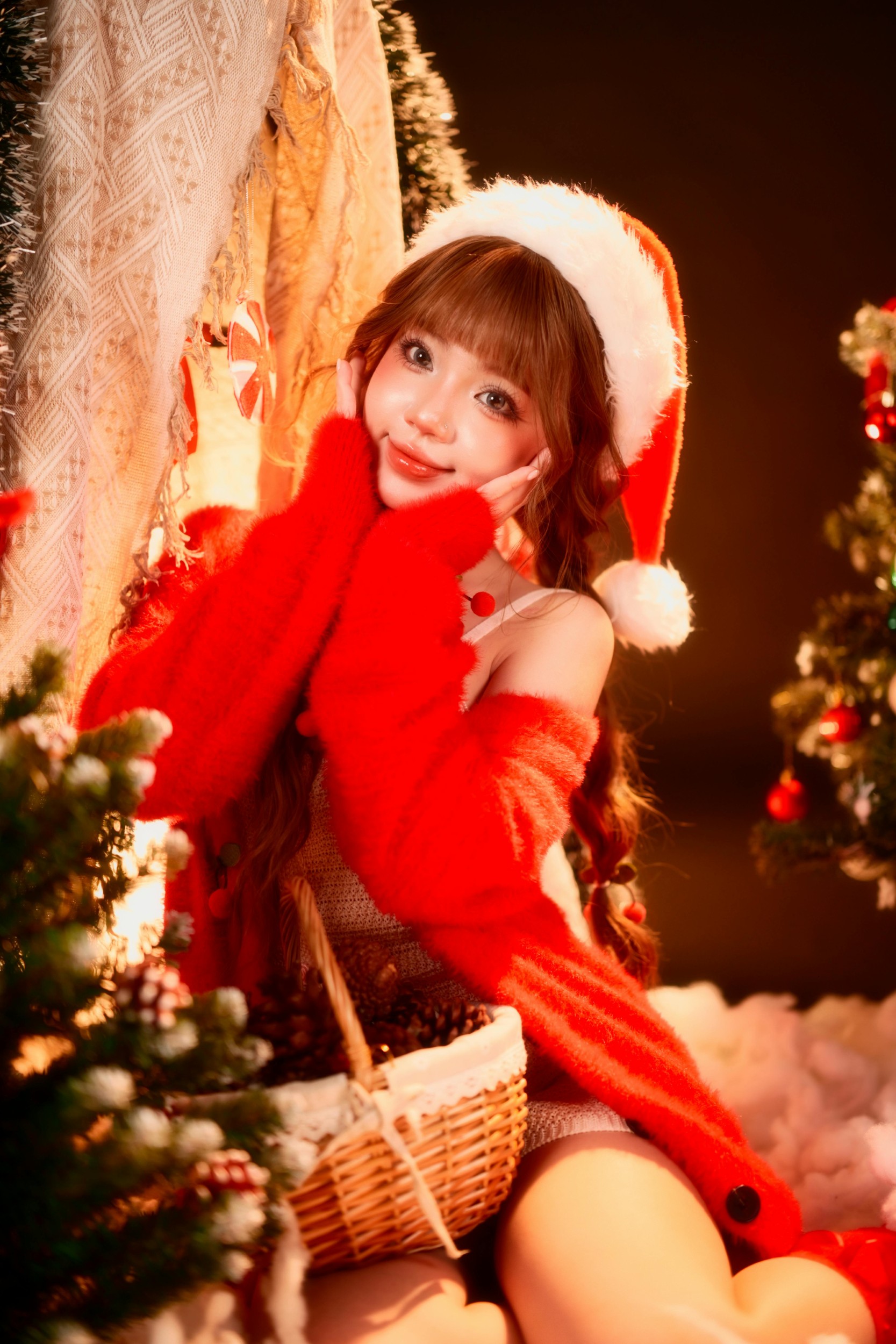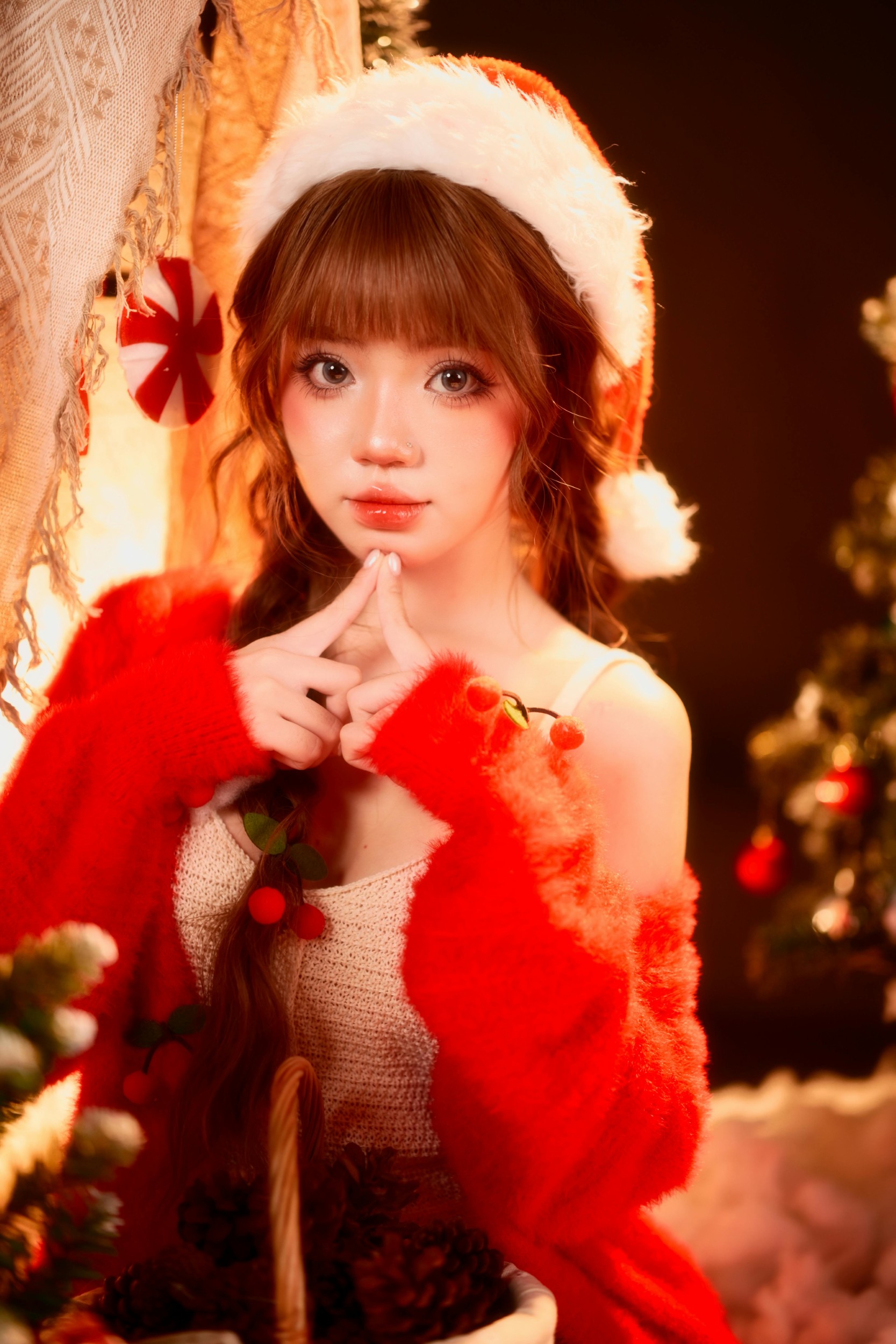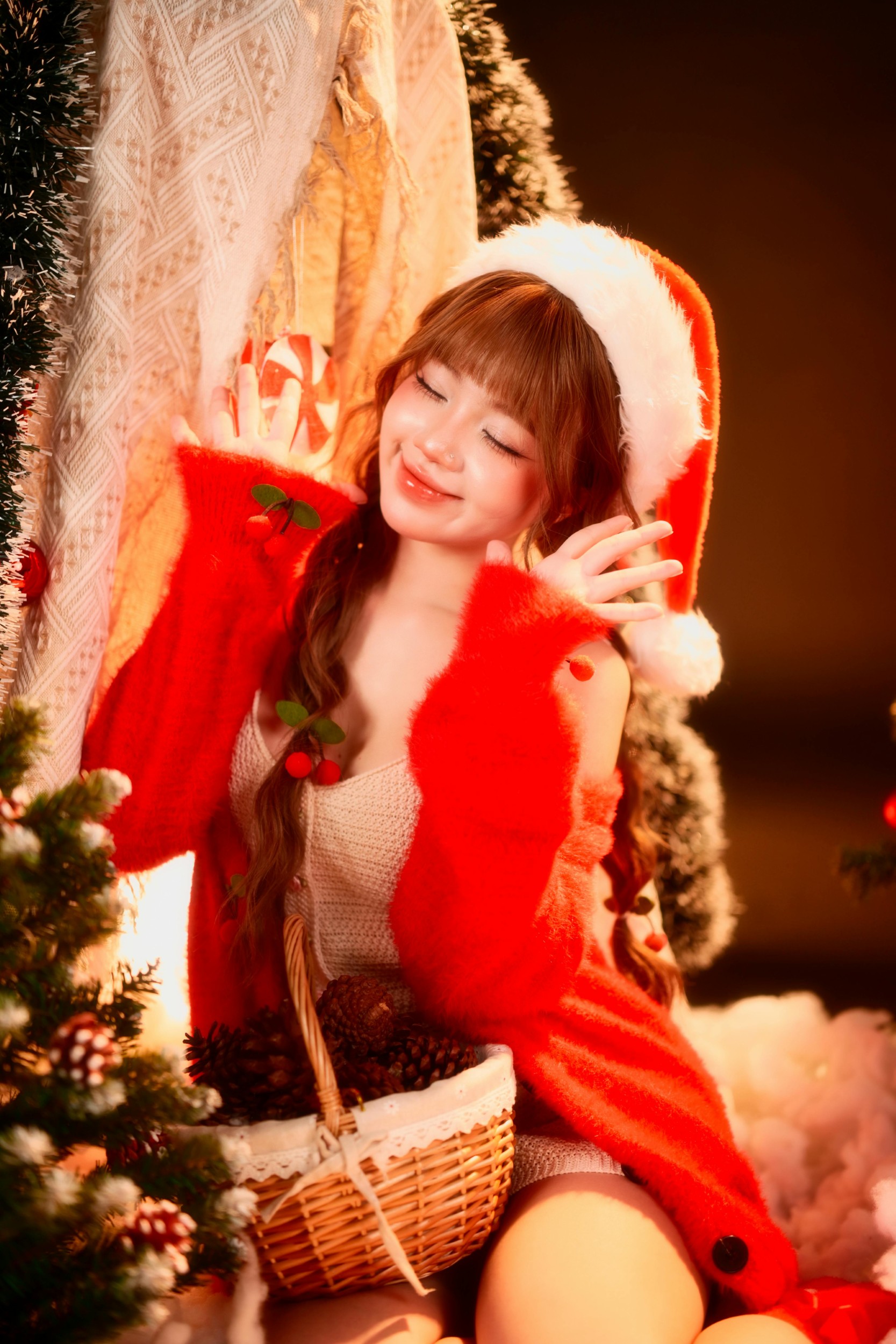 她抱着装满松果的藤篮,指尖轻触飘落的细碎光点,眼里盛着星光,笑容软乎乎的。背景里的装饰树、精致的礼物盒,和她身上的樱桃小配饰相映成趣,整个场景像被施了魔法,泛着温柔的光晕。热烈的红、蓬松的白,和她甜软的笑容融在一起,把独属于少女的治愈与浪漫,都定格成了永不褪色的瞬间。