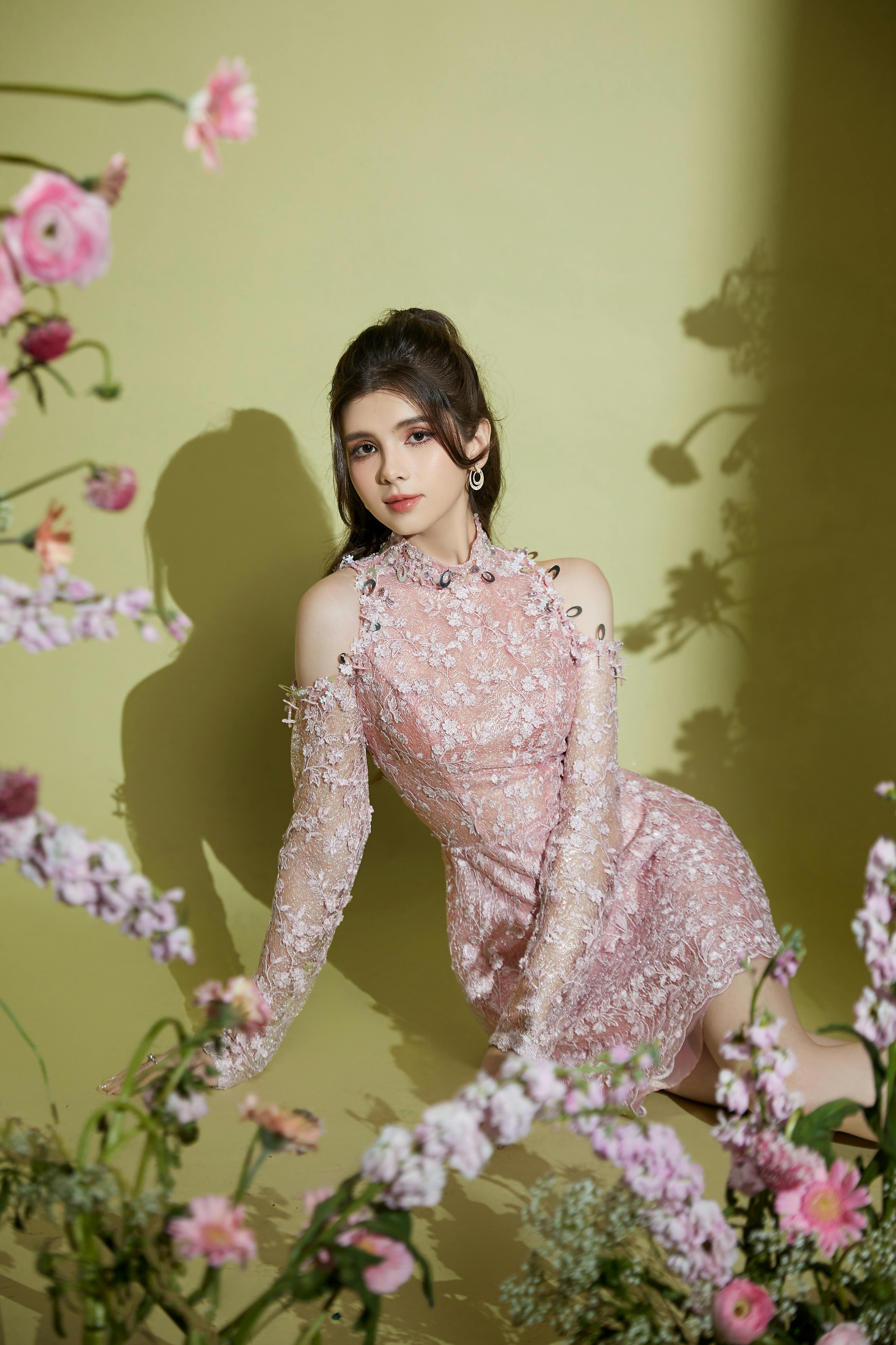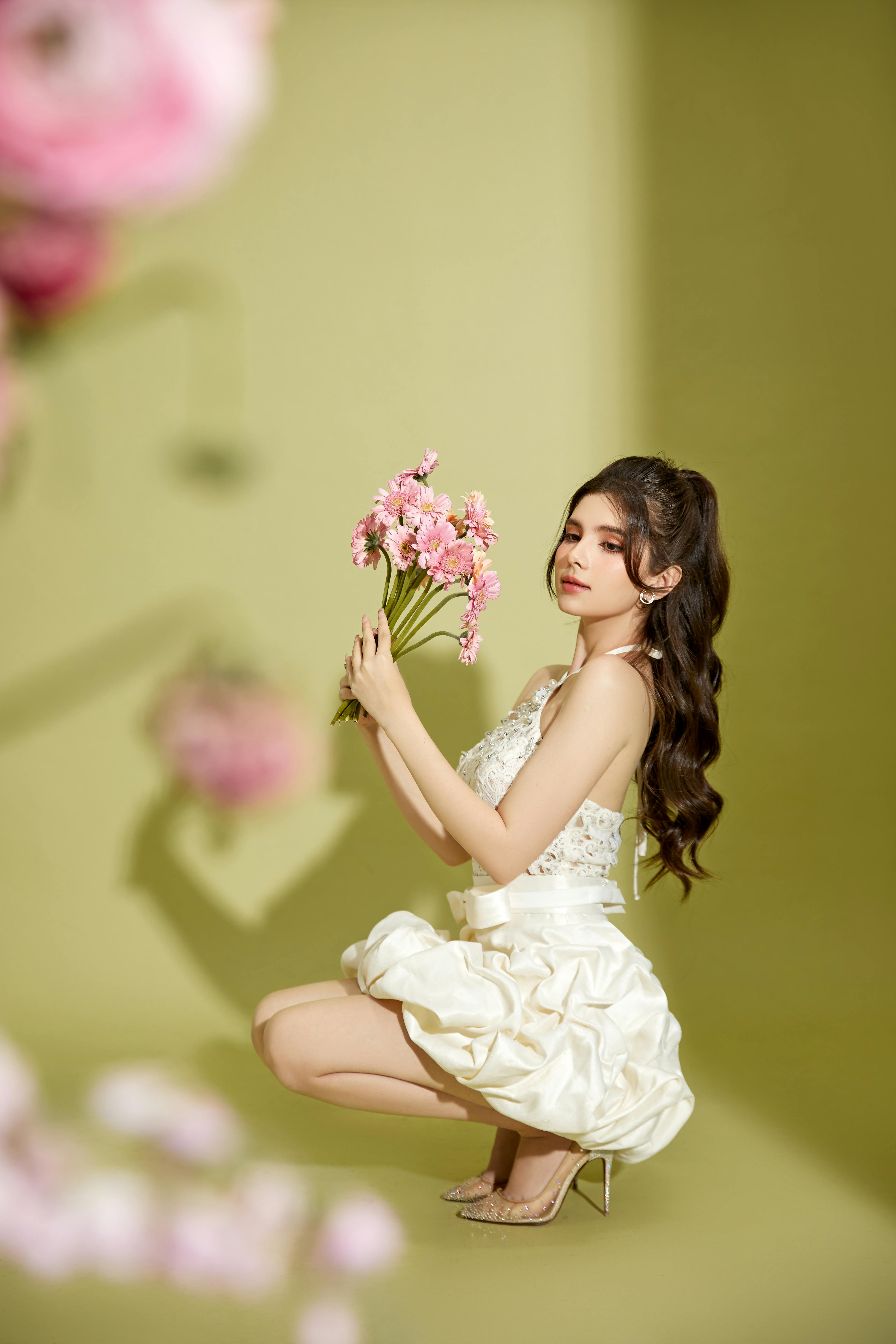 她身着白裙,蕾丝与缎面勾勒出温柔的轮廓,捧着一束粉橘色的非洲菊,像捧着一整个春天;或是换上银灰、裸粉的蕾丝裙,肩颈的碎钻与纱质肌理,在光线下泛着细碎的光泽,与周围的花影交叠。暖调的光线穿过花瓣,在她的发梢、裙摆上落下斑驳的影子,每一个眼神、每一个转身,都带着独属于少女的温柔与浪漫。