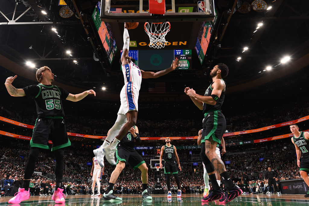 比赛上半场,凯尔特人整体状态更为稳定。首节开局,76人由保罗·乔治连续命中两记三分球,取得8比2的领先优势。随后凯尔特人杰伦·布朗通过不断冲击篮下帮助球队止血,76人方面泰瑞斯·马克西和VJ·埃奇库姆及时回应,场上比分保持胶着。首节后半段,杰森·塔图姆和布朗连续突破得手,凯尔特人完成反超。节末阶段,马克西多次利用个人突破紧咬比分,首节结束时,凯尔特人以23比21领先76人。