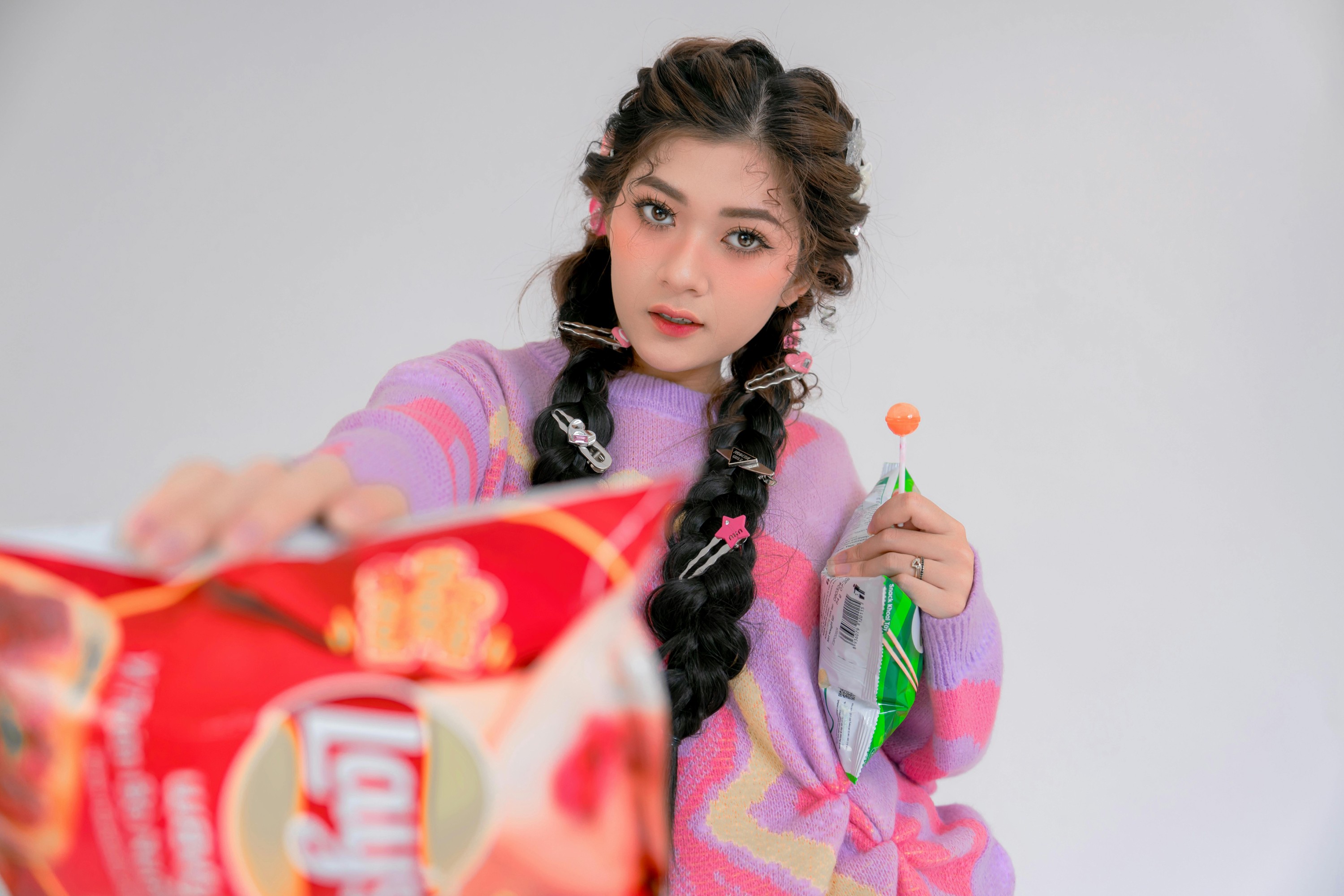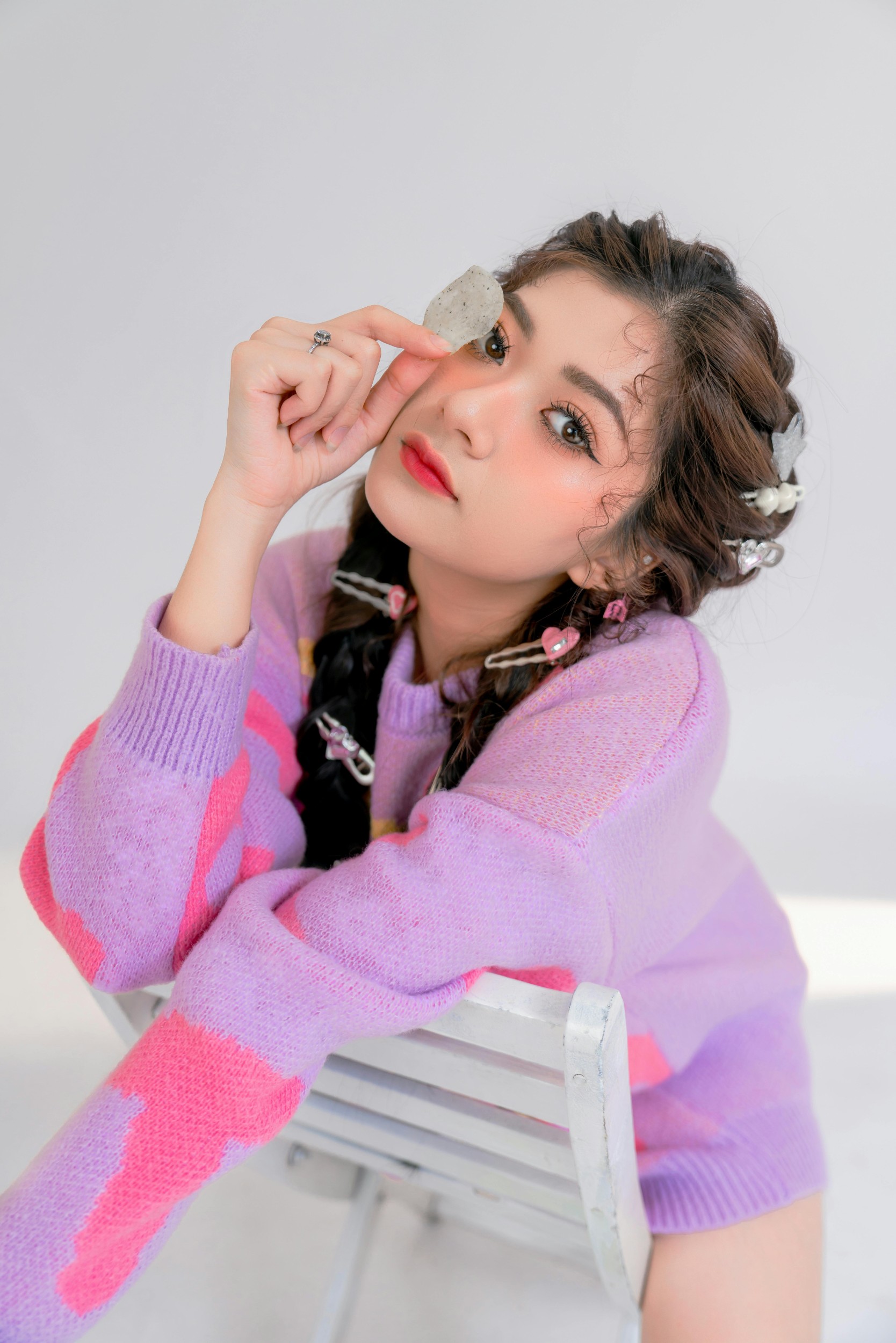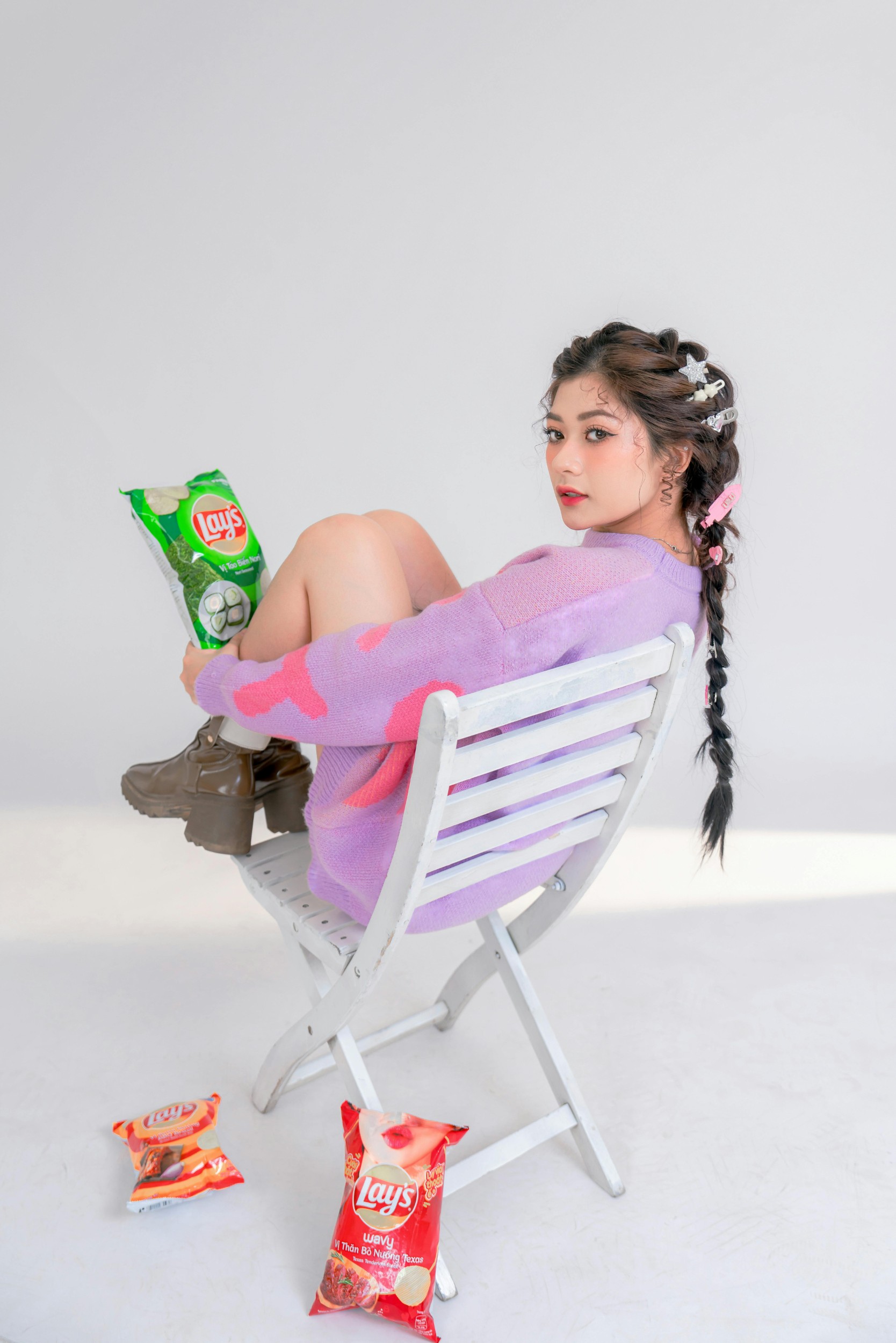 坐在椅子上晃着脚,把薯片举到眼前,咔嚓咔嚓拍个不停,感觉下一秒就要被快乐和零食一起淹没啦!