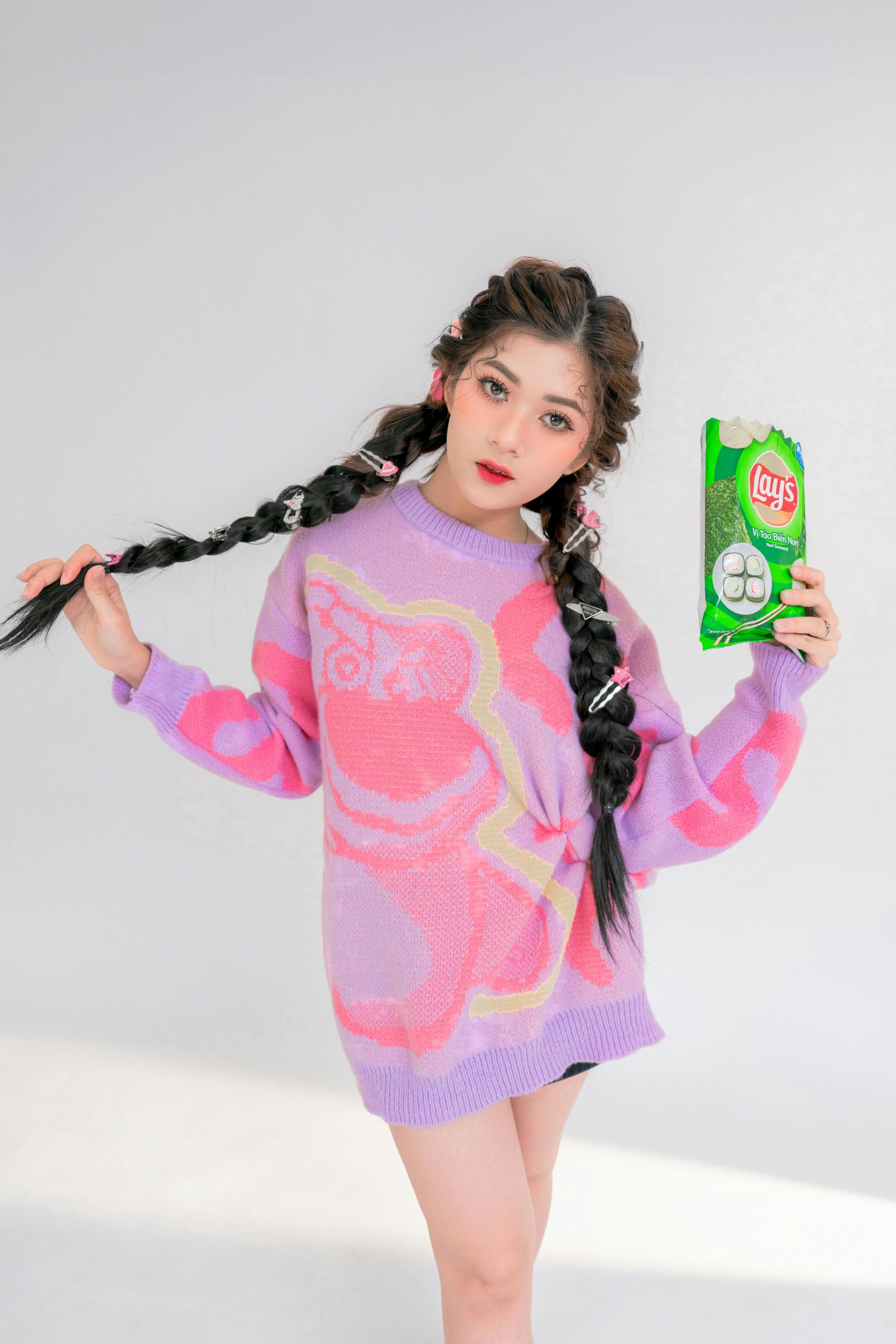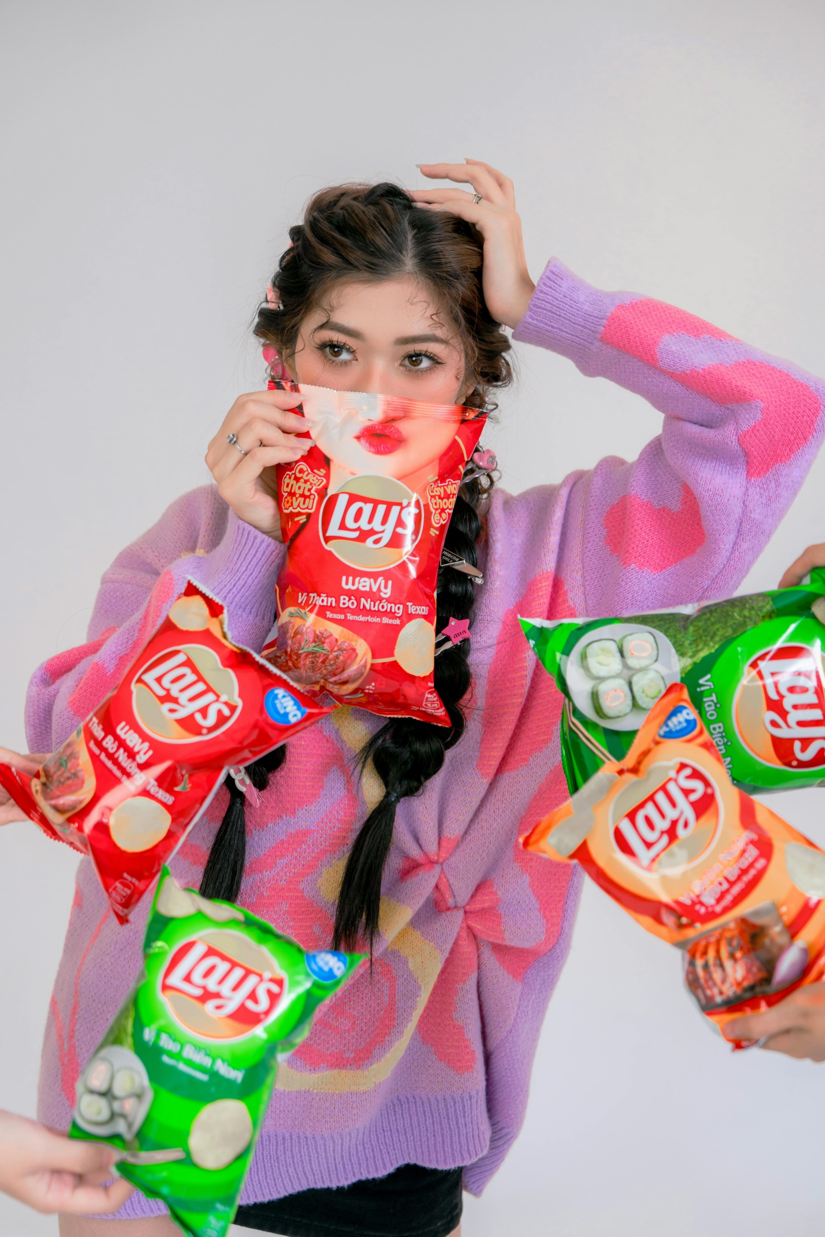 手里的薯片袋都快被玩坏啦!一会儿举起来对着镜头比耶,一会儿把袋子捂在脸上,假装自己是个小 “薯片怪”,连镜头里的风都变得甜甜的~