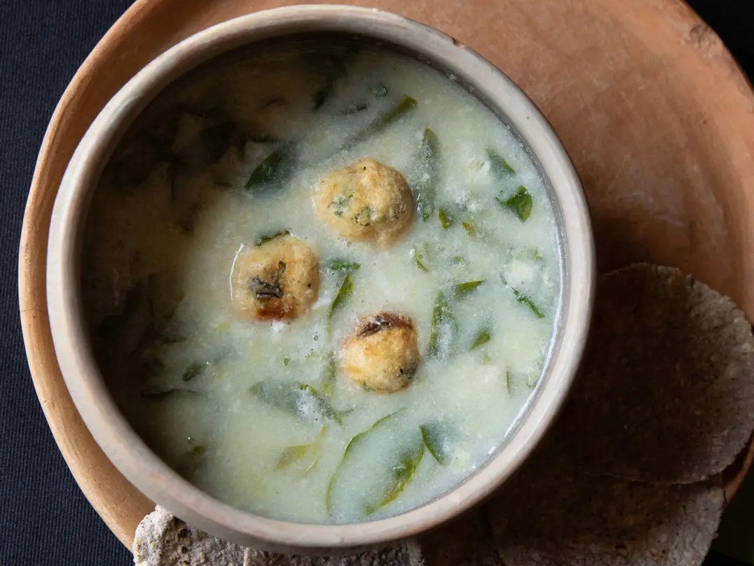 - 在大碗中,将玉米面团、切碎香菜叶和2g盐混匀,揪成弹珠大小的面团放在烤盘上,重复操作做出约 30 个。手指在圆球中心按出小坑,放入豌豆粒大小碾碎的豆腐乳,包好后再搓成圆球。